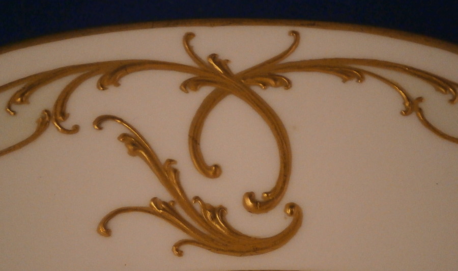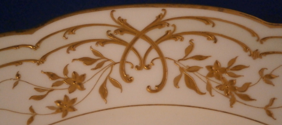 This is a really nice Art Nouveau period plate made by KPM in the early 20th century. The plate is hand painted with two wild female turkeys in a landscape surrounding. The rim is decorated in the Jugendstil style with raised gold scrolls as well as some leaves and flwoers and a slightly greenish ground color between the scrolls which is hard to see in the pictures. A truly superb plate and it is in superb condition. The piece is 1 inch tall and 9.75 inches in diameter. It is marked underneath with the underglaze blue scepter as well as the red orb mark as well as a painter's and a gilder's mark and the usual impressed marks of the period. Please email me for more information or other pictures.