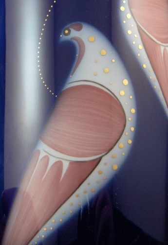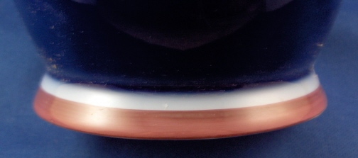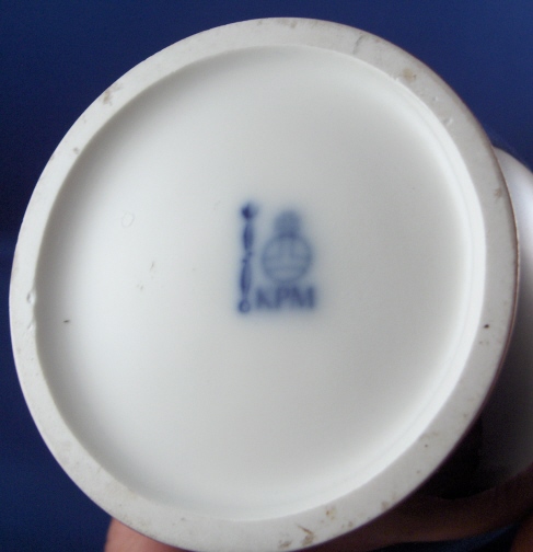This is a large vase made by KPM around the mid 20th century. It is handpainted with an underglaze design of two birds with a cobalt blue ground color covering the rest of the piece. Nice brown trim to top and bottom rim. A bit of gold highlights on the birds. This is really a superb design and one of the more popular from this time period! Always wanted to have one and now I do :) The vase is 10 inches tall and 5.125 inches in diameter. It is marked underneath with the underglaze blue scepter and orb mark as well as something like looks like an odd R. It is in perfect condition! Please email me for more information or other pictures.
