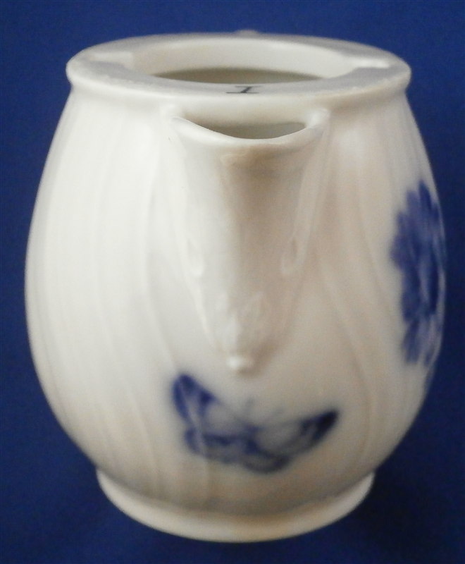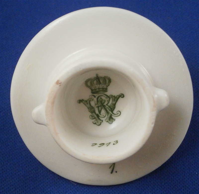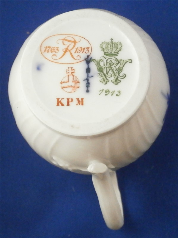 This is a nice lidded creamer with some history attached to it made by KPM in 1913. The creamer is hand painted some nice underglaze blue flowers and a butterfly, has a nice ribbed design to the paste and the branch handle terminates into some flowers and leaves as shown. Pine cone finial to the lid. The piece is in perfect condition which is always nice :) It is 3.25 inches tall, 3.75 inches from handle to spout and 2.25 inches in diameter. The special part of this piece is that it has the ownership mark of Kaiser Wilhelm II - imagine all the famous people that touched this piece! The underside of the main body is marked with the underglaze blue scepter, the red orb mark, the 1913 anniversary mark as well as the WR under a crown and the year mark 1913 in green. The underside of the lid has the same mark as well as the number 1 which matched the Roman numeral I on top of the creamer to show this is an original creamer and lid. The underglaze blue is nice because it will last forever even if you should use it. Please email me for more information or other pictures.