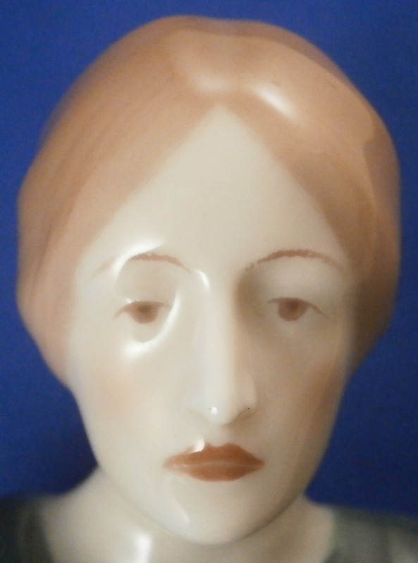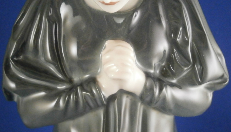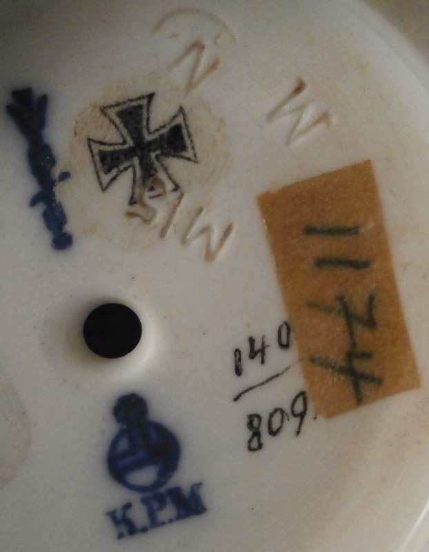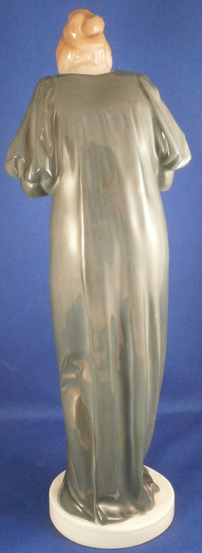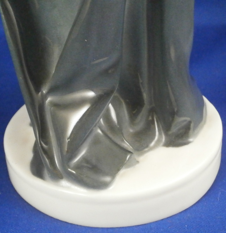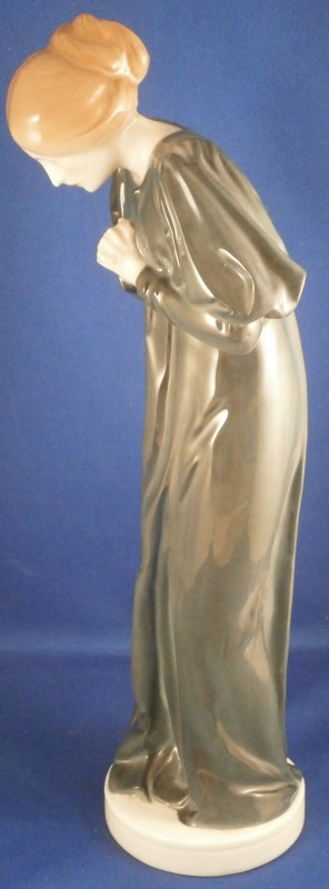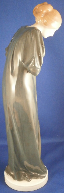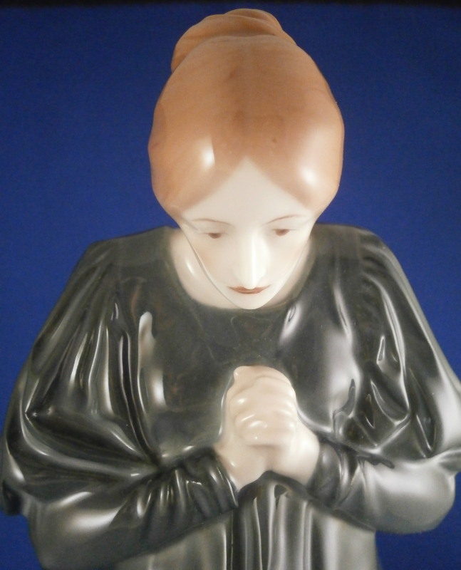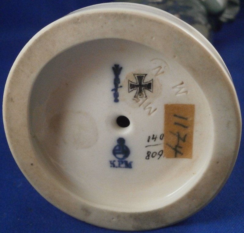 This is a superb and quite rare figurine of a lady made by KPM in the early 20th century druing WWI. Superbly modeled and hand painted in the typical under glaze colors of the Art Nouveau / Jugendstil period. I actually cannot find this model so I do not have the artist info on her so if anyone knows more about her a little help would be appreciated. The piece has the artist name impressed into the back of the base but I cannot make them out. The model is not even in the book of the Broehan Museum in Berlin which has most of these pieces in it. Either way - a nice size figure of a lady that appears to be praying. She is wearing a long dark green gown and is standing on a round white base. Her hair color goes very well with the color of the dress. The figure is in superb condition with a small glaze flaw to the back and a tiny chip to a fold on her right under her shoulder. Neither shows at all when on display and she looks fabulous! The figurine is 12 inches tall, 4.25 inches wide and 3.125 inches deep. The piece is marked underneath with the under glaze blue scepter, the blue orb for their under glaze colors, the Iron Cross of the period as well as the usual impressed and written numbers of the period as shown. First choice piece. Not a piece you will see again anytime soon! Please email me for more information or other pictures.