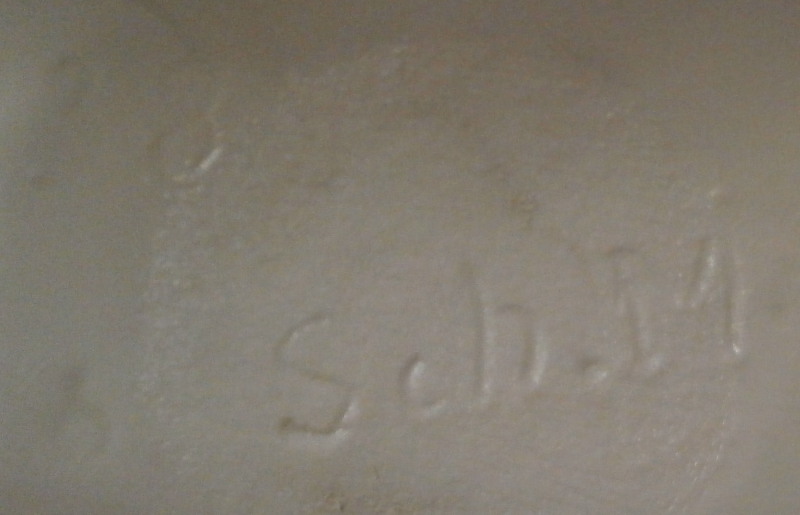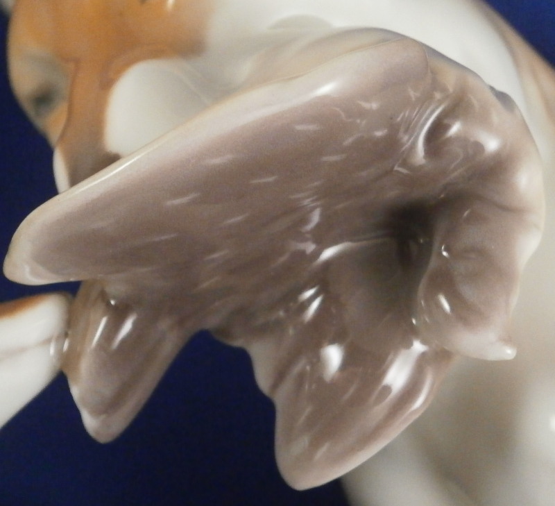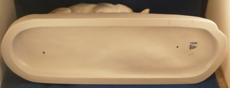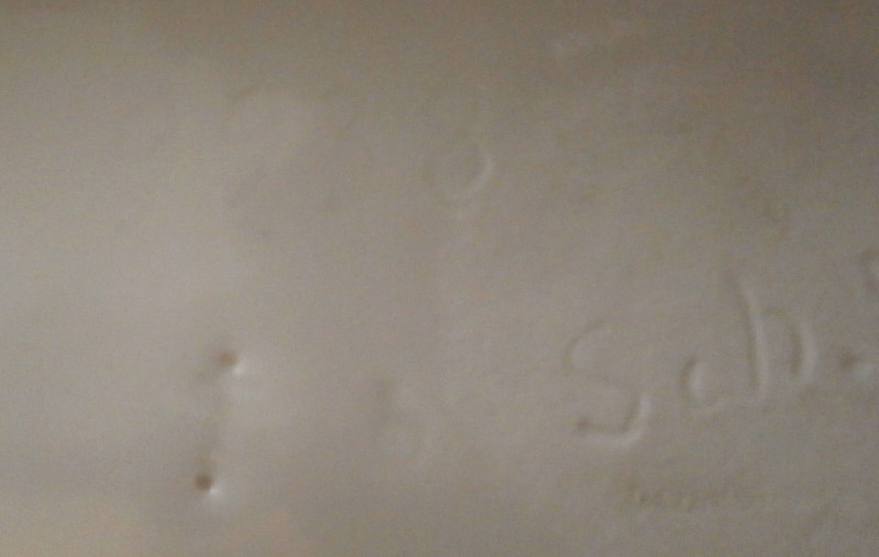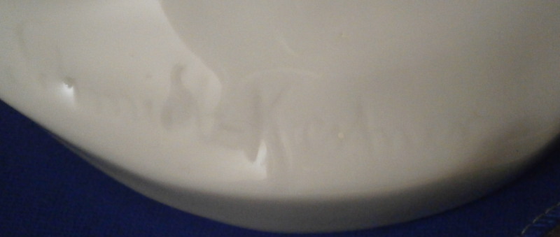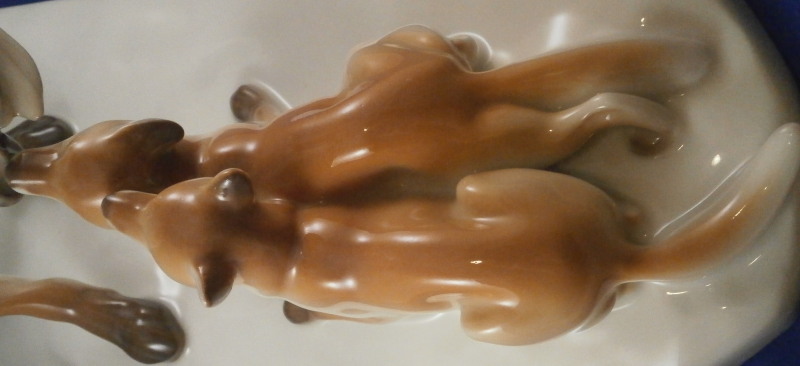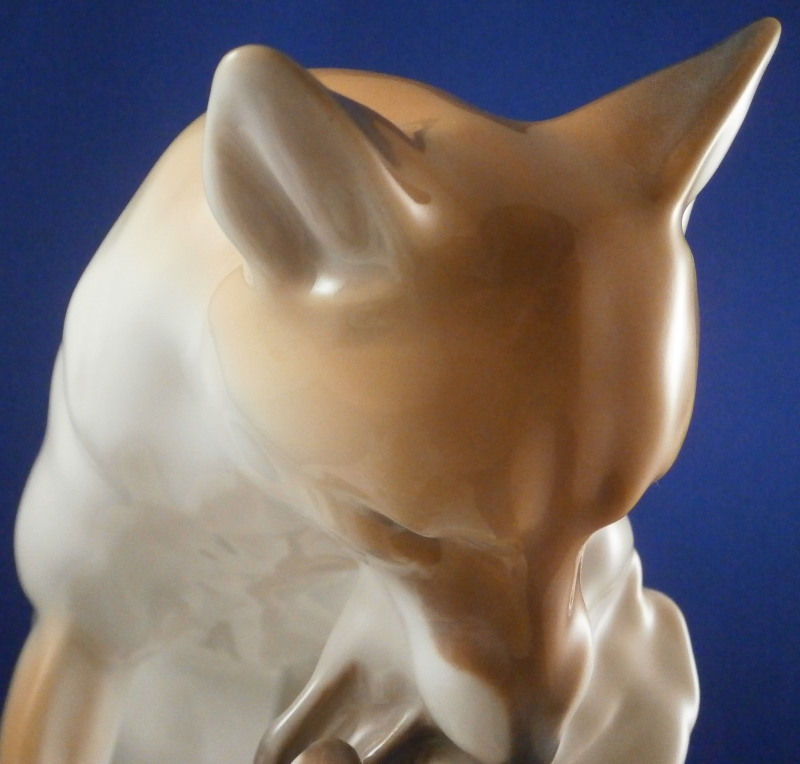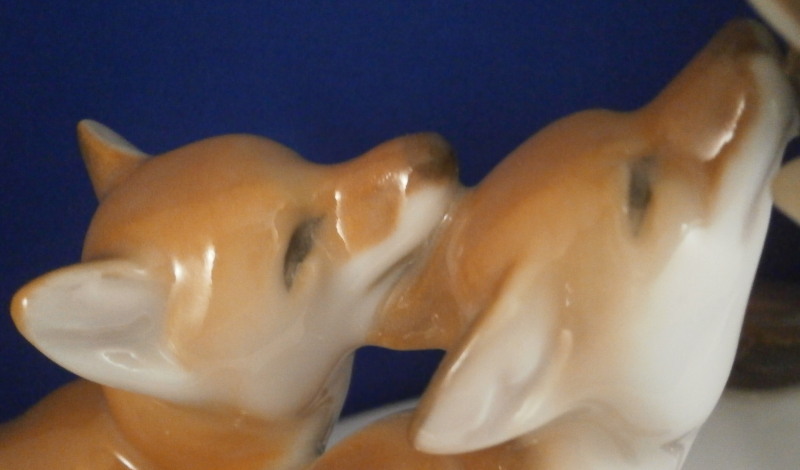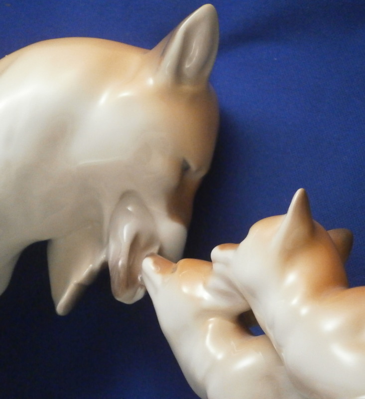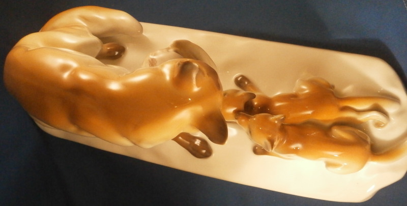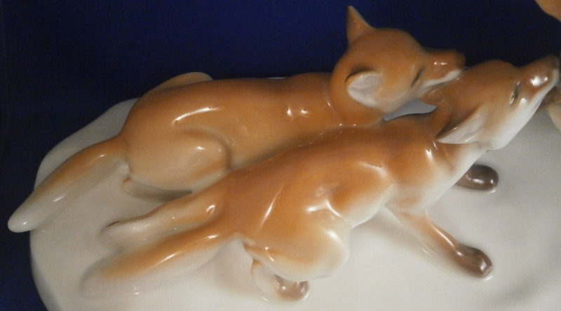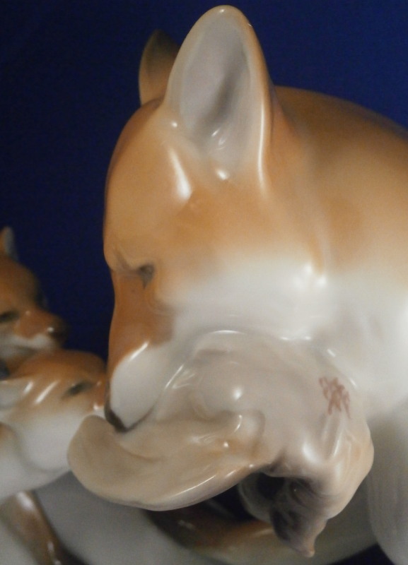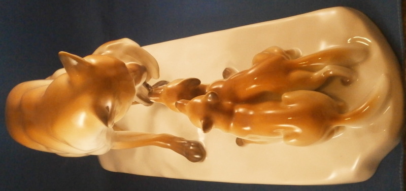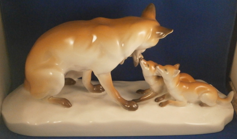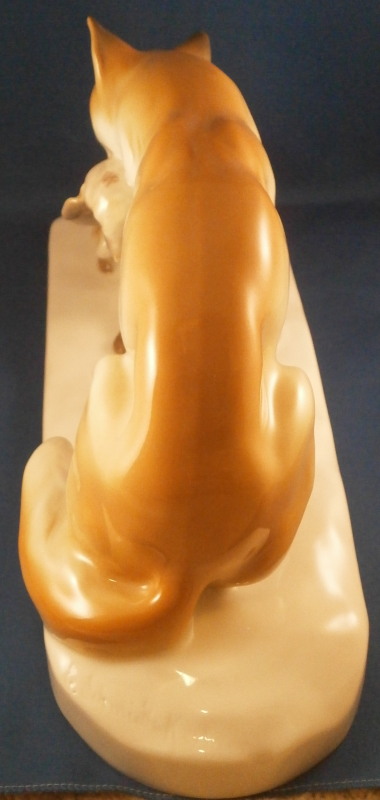 This is a large figurine made by KPM in the early 20th century - circa 1920. It is of a female fox feeding her young a dead bird. She has the bird in her mouth with one little fox pulling at it and the other coming in closer. The piece is hand painted in the Art Nouveau or Jugendstil style of the period in underglaze colors that are quite different from the more usual above glaze colors. Quite elegant and decorative! The piece was designed by Erich Schmidt - Kestner and is a very impressive figure in terms of modelling and size. The figure is in perfect condition. The figure is about 7 inches tall, about 5 inches deep and about 15 inches long. It is marked underneath with the underglaze blue scepter, the blue orb (used only on underlgaze decorated pieces), some red numbers and letter as well as the usual impressed numbers and marks as shown. First choice pieces of this size are amazing as things often went wrong during the firing process. The side of the base behind the mother fox has the artist name impressed in it. Please email me for more information or other pictures.