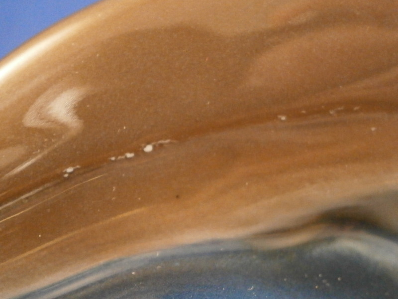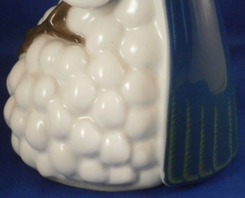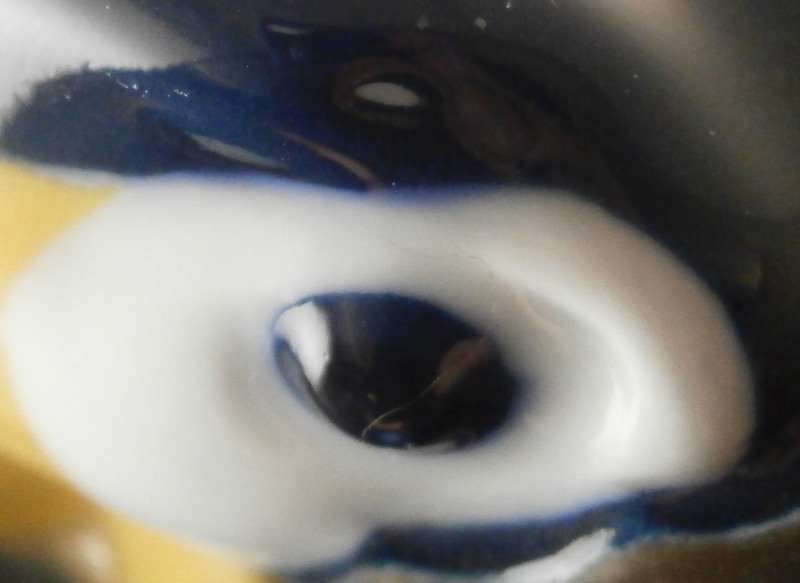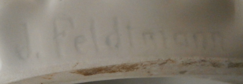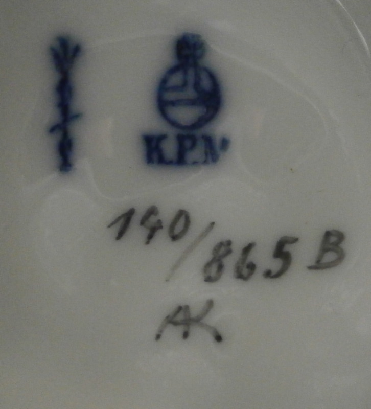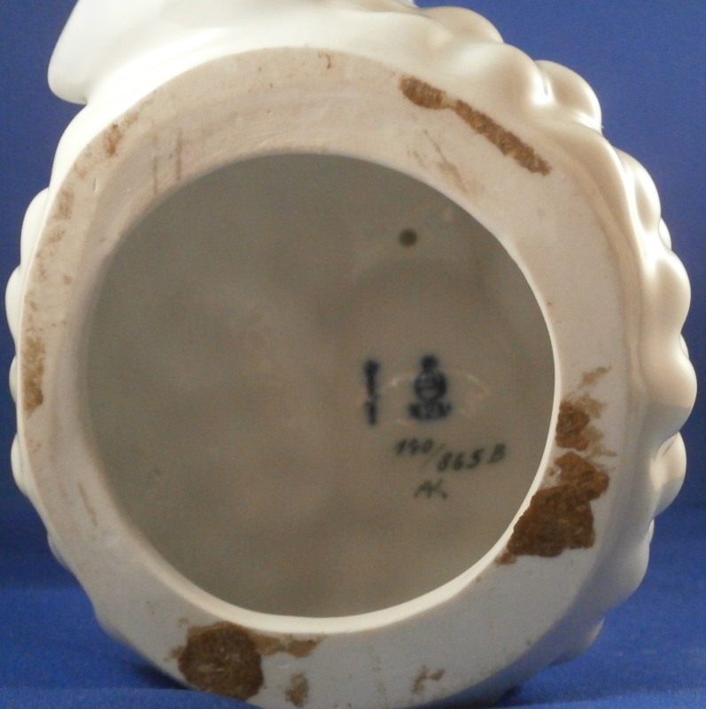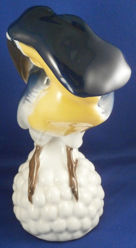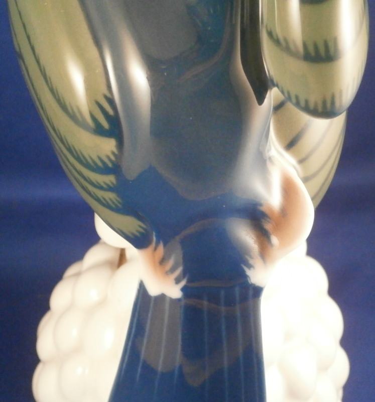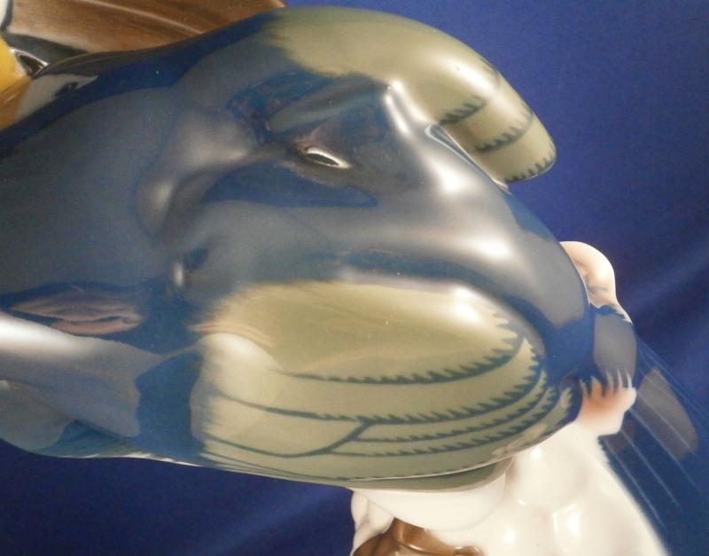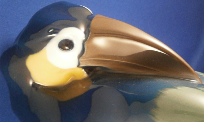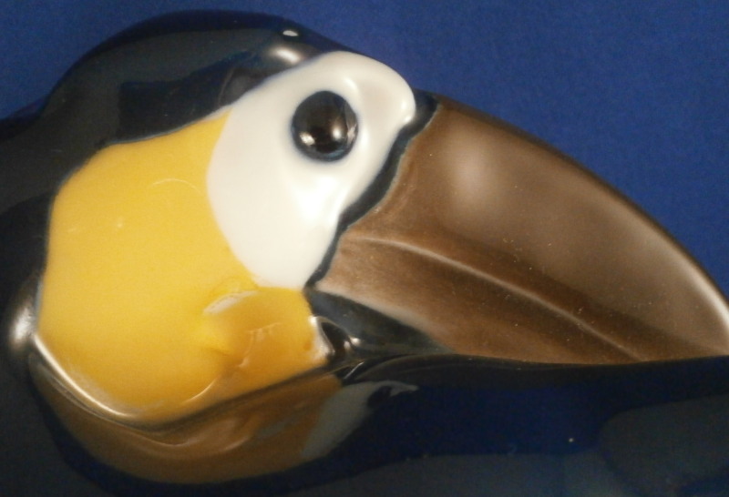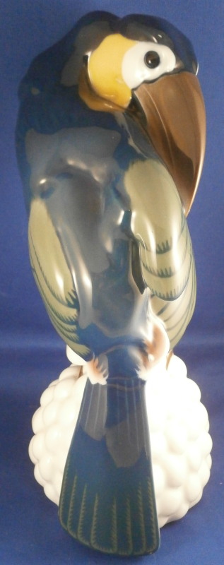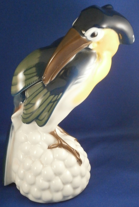 This is a large figurine of a toucan bird made by KPM in the early 20th century - circa 1925. The bird is pruning itself while sitting on a pile of berries though they look more like eggs :) The piece is hand painted in the Art Nouveau or Jugendstil style of the period in underglaze colors that are quite different from the more usual above glaze colors. Quite elegant and decorative! The piece was designed by Julius Feldtmann and is a very impressive figure in terms of modelling and size. The figure is in perfect condition but there are some color misses here and there as shown - not an uncommon issue on underglaze colored pieces and it was still deemed a first choice piece so nthing that takes away from the piece at all. The biggest is a spot of blue missing along the back of his head and some smaller spots of brown along the beak. The figure is about 10 inches tall, about 4 inches deep and about 7 inches long. The figure is marked underneath with the underglaze blue scepter, the blue orb (used only on underglaze decorated pieces), some black numbers and letter as well as the usual impressed numbers and marks as shown. First choice pieces of this size are amazing as things often went wrong during the firing process. The back of the base next to his tale has the artist name impressed in it. Please email me for more information or other pictures.