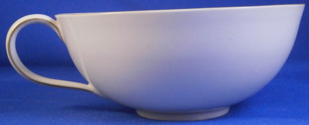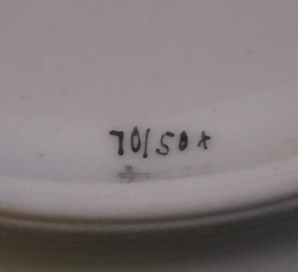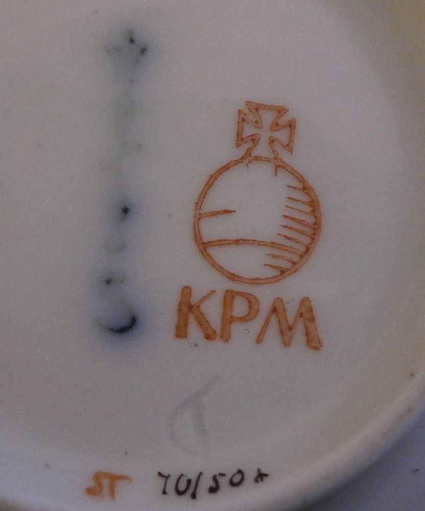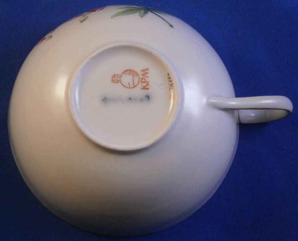 This is a nice cup and saucer made by KPM right around the mid 20th century right after WWII. I think it is in the Urbino design but could be Berlin as well. The set is hand painted with a nice flower on each piece as well as a gold trim to the edges. Nice sleek shape. This design from this period is one of the most elegant and delicate KPM ever made I think. Simple lines and thinnly potterd with a nicely done single flower - just amazing! The cup & saucer are marked underneath with the under glaze blue scepter with the S under it for the Selb location, the red orb mark as well as some painter's marks and the usual impressed marks as shown. The cup is 1.625 inches tall and 3.875 inches in diameter. The saucer is 0.75 inches tall and has a diameter of 6 inches. They are in perfect condition! Please email me for more information or other pictures.