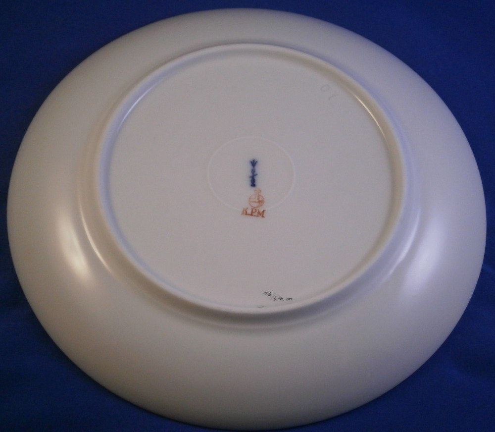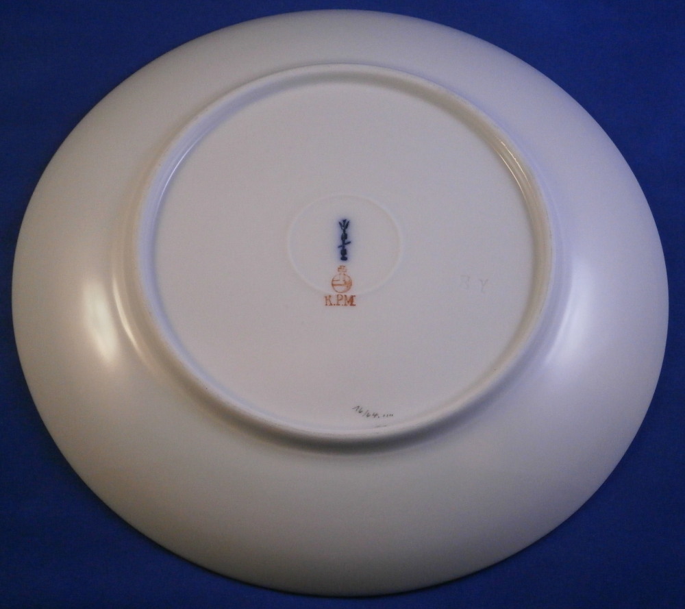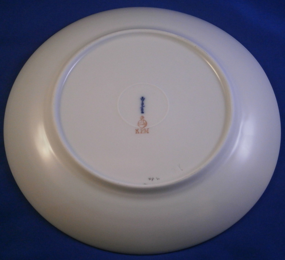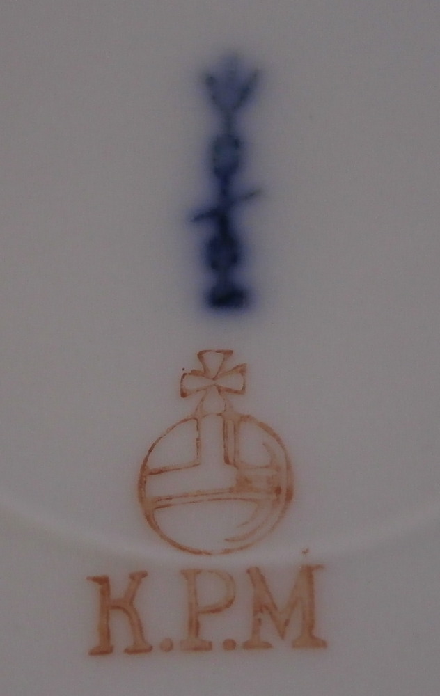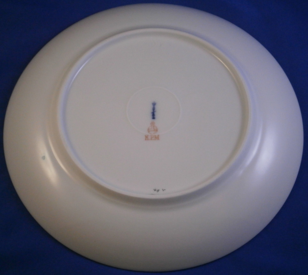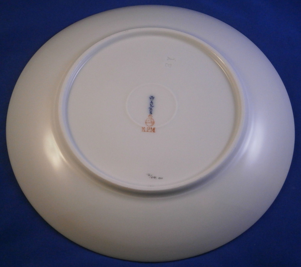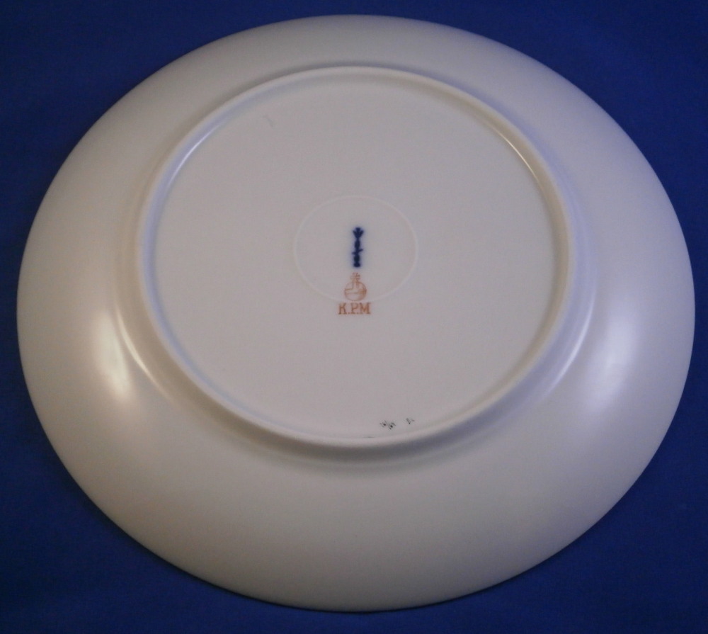 This is a nice set of 6 dessert plates made by KPM right around the mid 20th century. I think it is in the Urbino but could also be the Berlin design. Each plate is hand painted with a nice flower in the center and two also have a single little bug to cover a small flaw which was often used by them on this service. Each piece has a simple yet elegant shape with a gold trim to the edge. All pieces are in superb condition and are marked underneath with the under glaze blue scepter, the red orb mark as well as some black and impressed numbers as shown. The plates are 0.875 inches tall and have a diameter of about 7.875 inches. Please email me for more information or other pictures.