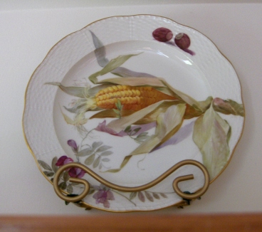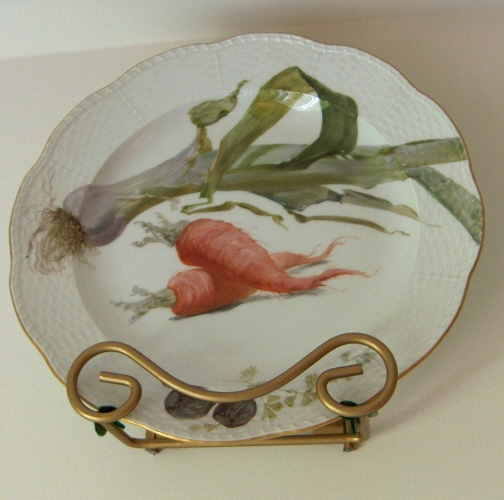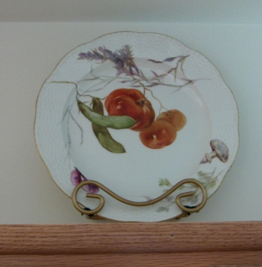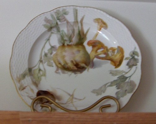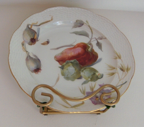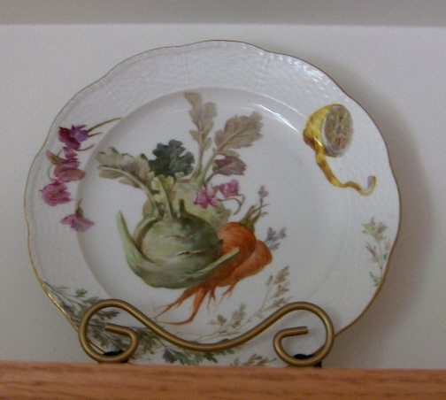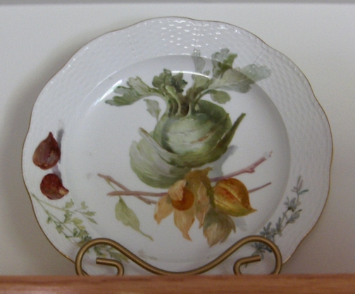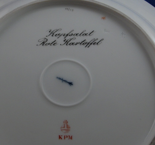 This is a super set of eight vegetable plates made by KPM around 1909. They are all completely handpainted with many different vegetables and some fruit. Each plate has a main theme to the center and then something smaller painted on the rim. The rims are of a relief basketweave pattern with a gold trim to the outside edge. Most of the plates are marked in black on the back as to what vegetable is painted on the front. Two are not. Each plate is 1.25 inches tall and 9.625 inches in diameter. They are all in great condition (small amount of wear to one or two) and marked underneath with the underglaze blue scepter as well as the red orb mark. Also some impressed letters, etc. The lettuce plate for example has an impressed I with dots around it and the letter T. It also has written on there Kopfsalat (lettuce) and Rote Kartoffel (red potatoe). A red star mark for the painters mark and 11/13 in black. Please email me for more information or other pictures.