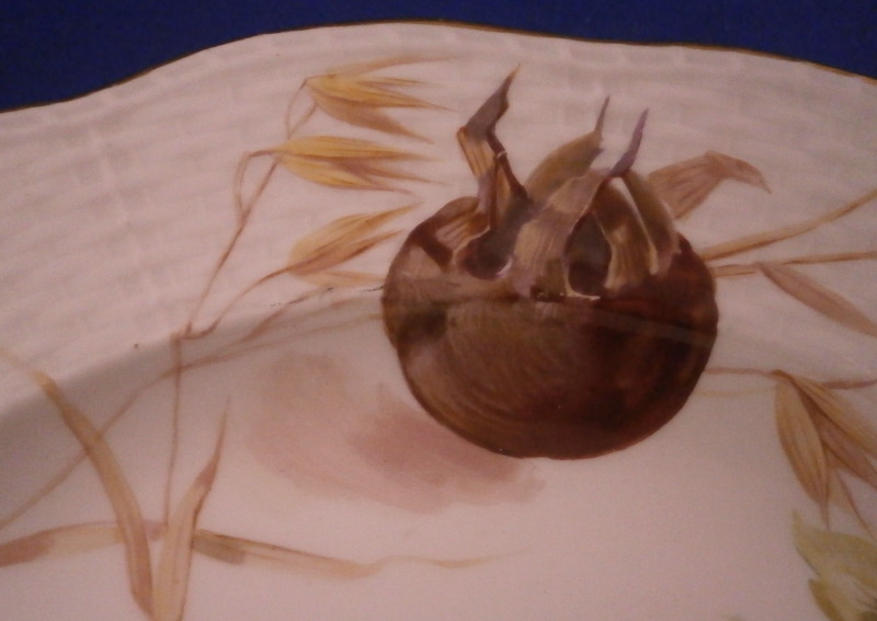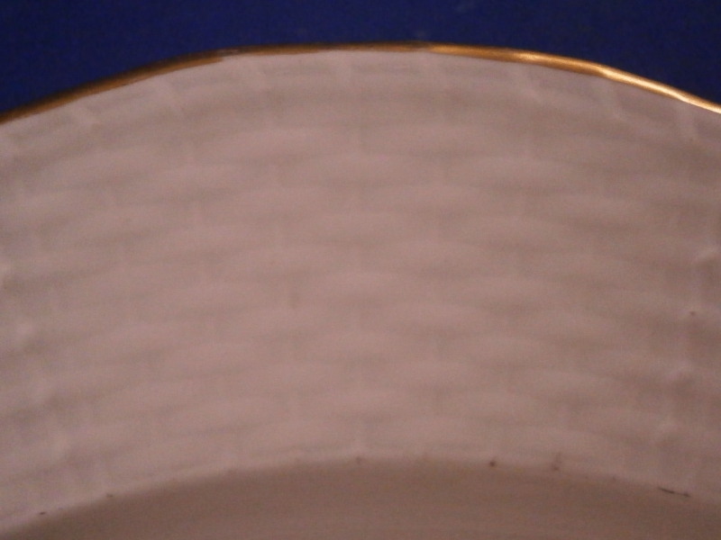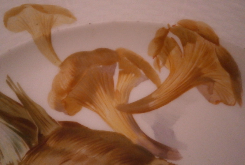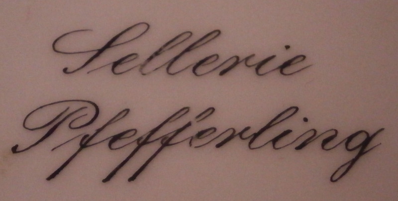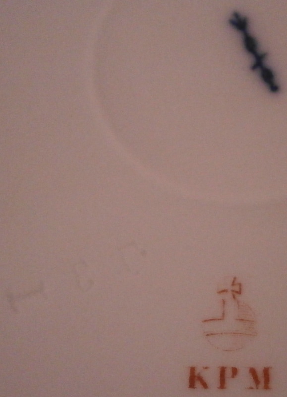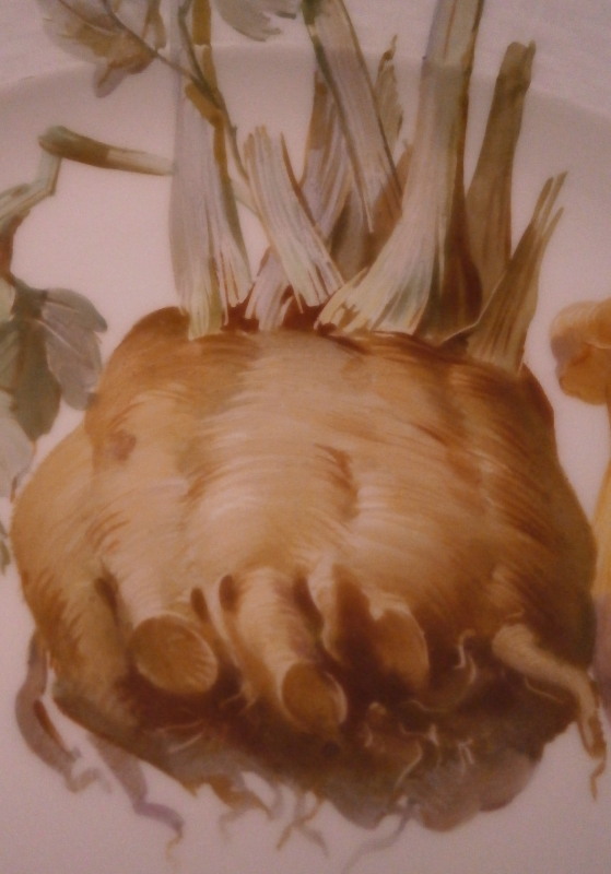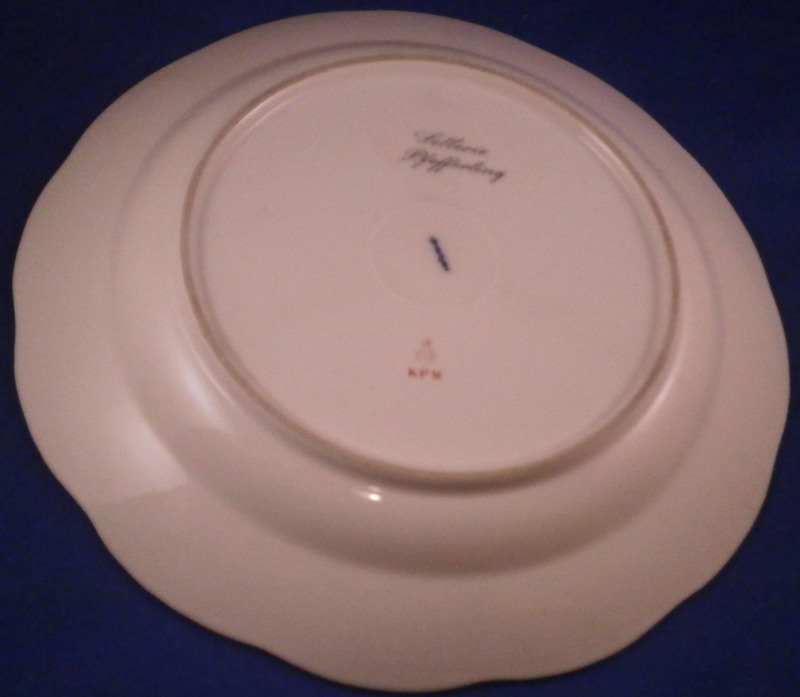 This is a superb vegetable scene plate made by KPM in the early 20th century. I own a set of 6 of these so this one fits right in with those. The plate is completely hand painted with a vegetable scene including some chanterelle mushrooms, celery root and some other things. The rim has a relief basket weave pattern to it with a gold trim to the outside edge. Tthe plate is marked in black on the back as shown with Pfefferling and Sellerie in German which are the main thing painted on the front. It is 1.25 inches tall and about 9.5 inches in diameter. The piece is in great condition as shown and is marked underneath with the under glaze blue scepter as well as the red orb mark and the usual impressed marks. Please email me for more information or other pictures.