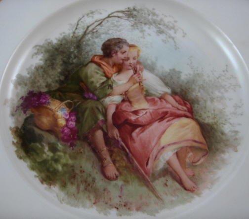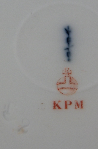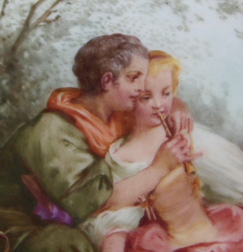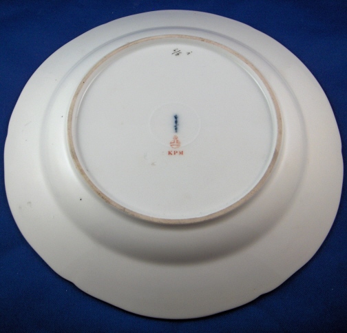 This is a great plate made by KPM in the early 20th century. It is handpainted with an uncommon scene in the center of two lovers playing the flute with a basket of flowers next to them and surrounded by greenery. This scene is unusually large covering the entire center of the plate. I have only seen this style on a cup or two over the years never on a plate so this is quite nice and you won't find it again anytime soon. The colors are of the softer palette in the Weichmalerei style common during this period! Nice edge highlighted with gilding. The plate is in perfect condition with the tiniest of wear. It is 9 inches in diameter and 1.25 inches tall. The piece is marked underneath with the underglaze blue scepter, the red orb mark, some black painter's marks as well as the usual impressed marks one would find during this period on KPM pieces like this. Please email me for more information or other pictures.