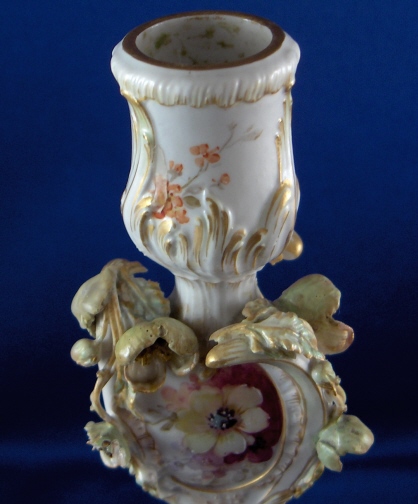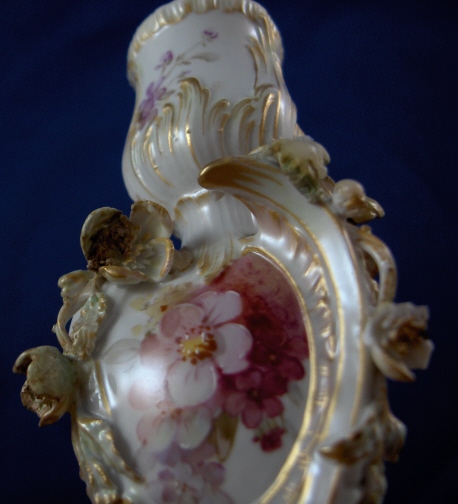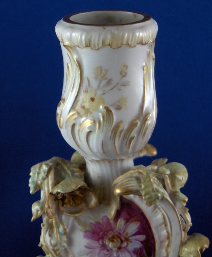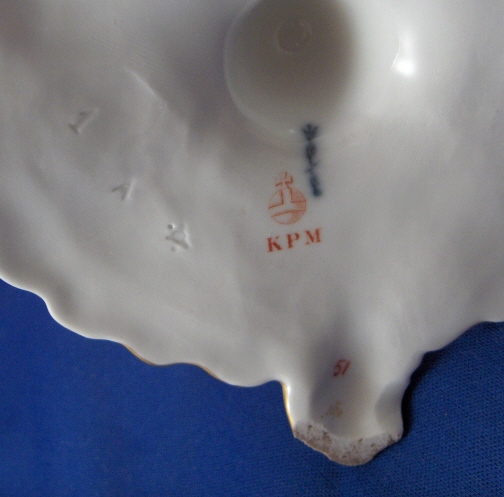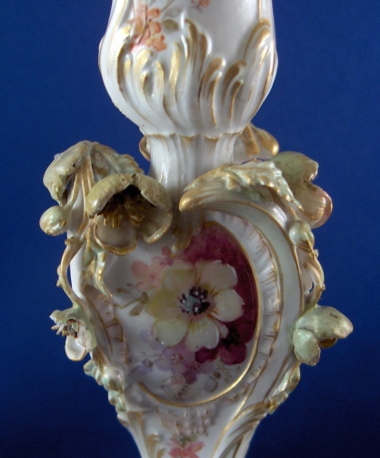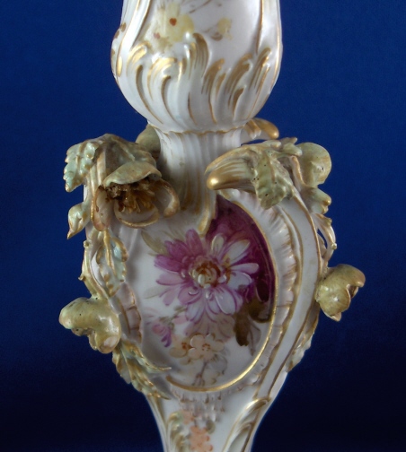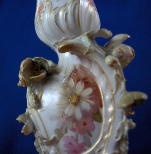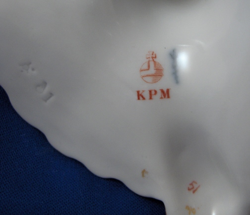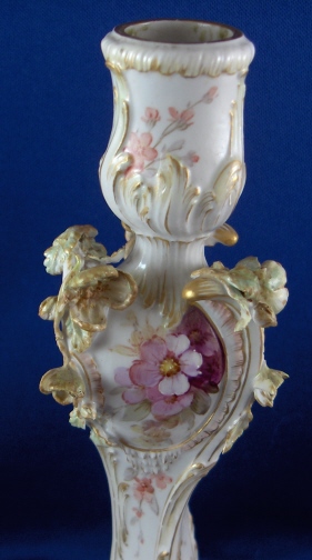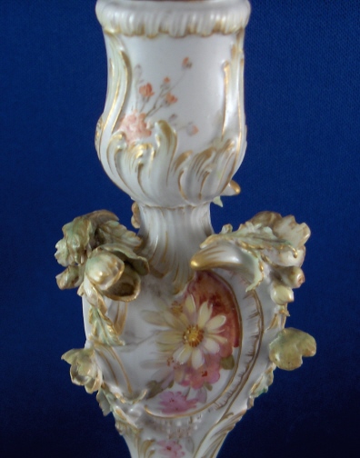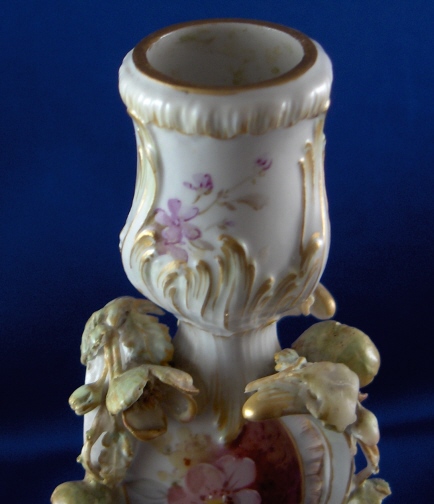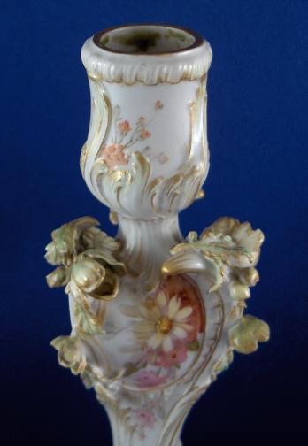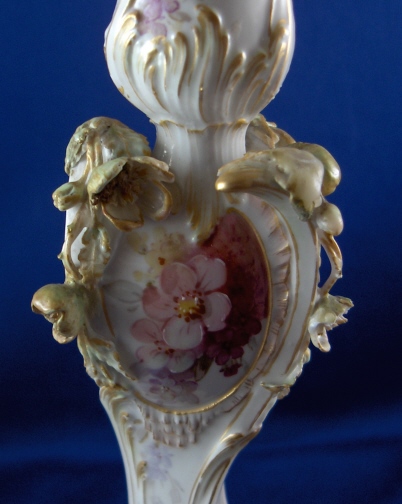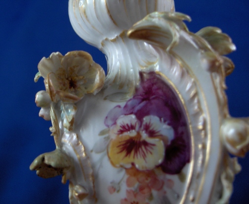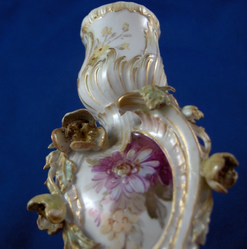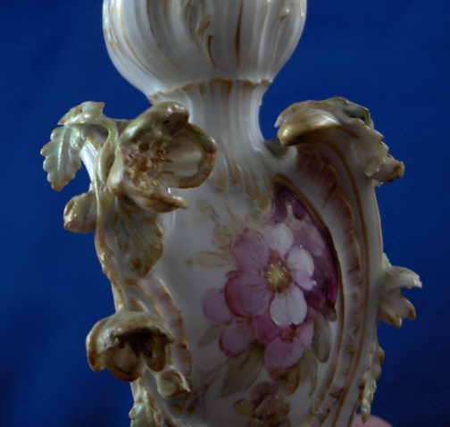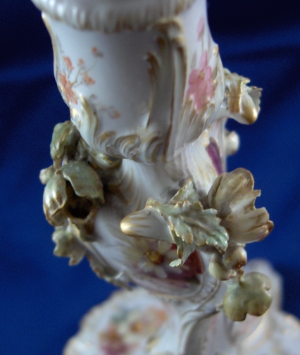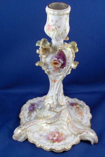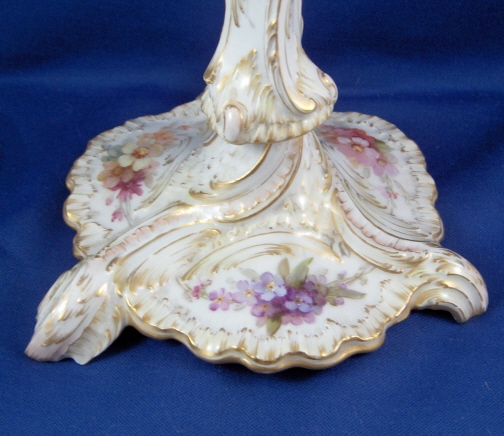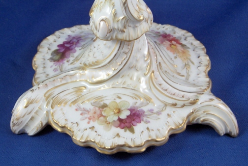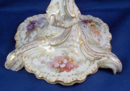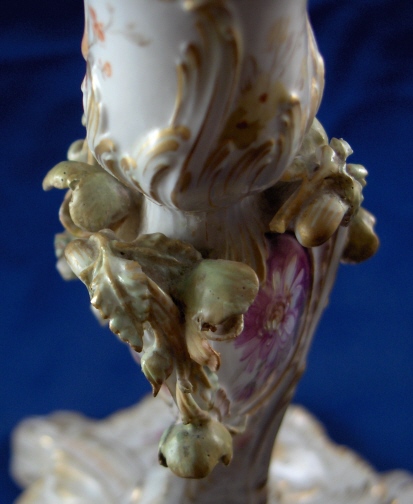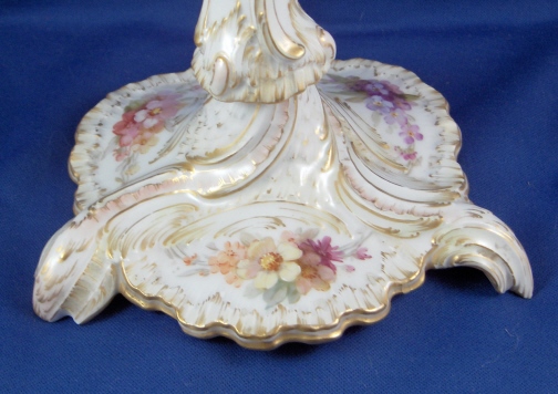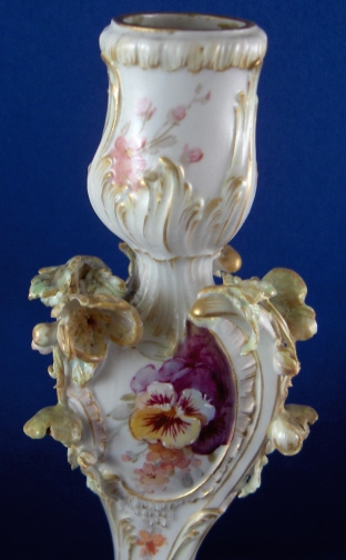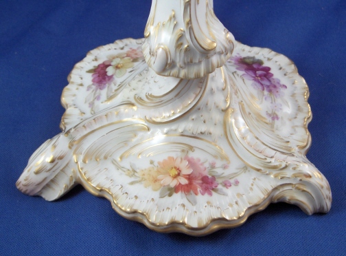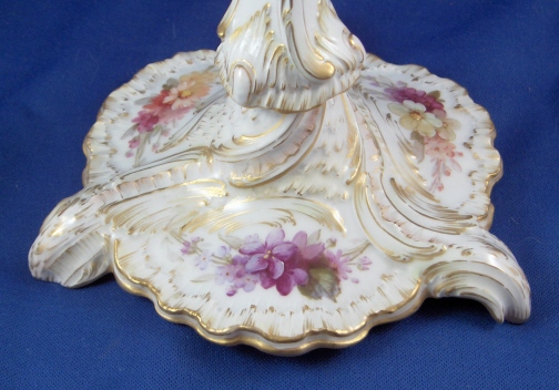 This is a pair of candle sticks made by KPM in about 1901. I have never seen this model by them but it is extremely well done with lots of small applied flowers and leaves as well as lots of handpainted flowers in the Weichmalerei style with nice gilding. The pair of candleholders is in remarkable condition considering the fragile nature and age of them. There is one flower that is damaged and a few have restorations to them but they are very well done and blend in perfectly. The candlesticks are marked underneath with the underglaze blue scepter, the red orb, a set of impressed marks including an A for the year code and a gilders and painters number. The pair is 7.625 inches tall and 4.5 inches in diameter plus the feet. Please email me for more information or other pictures.