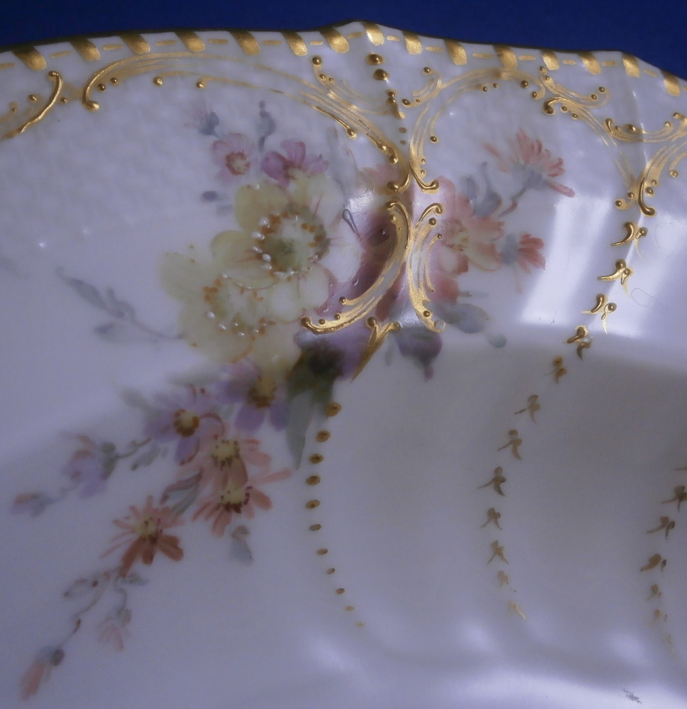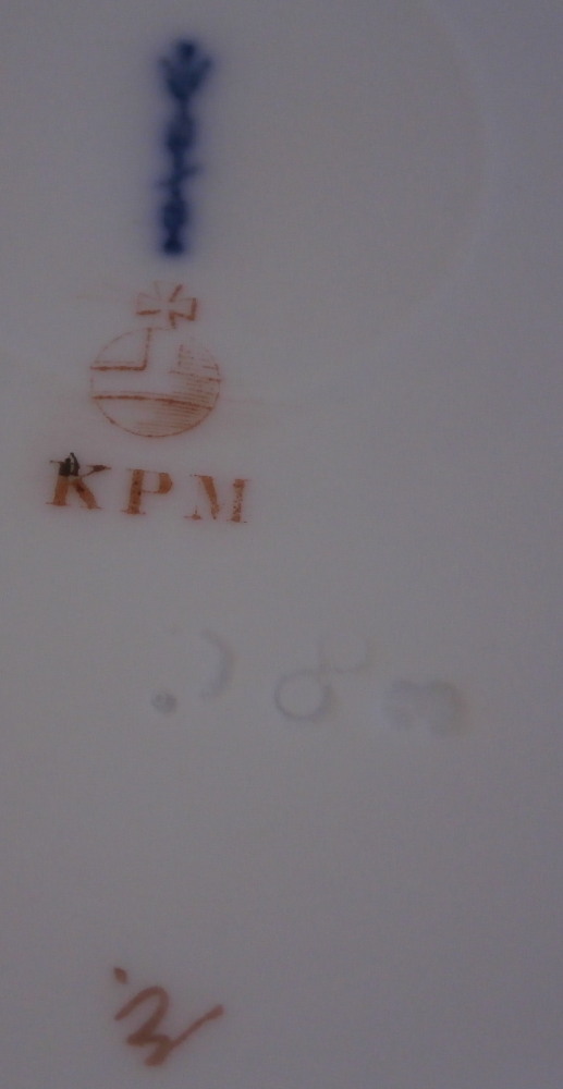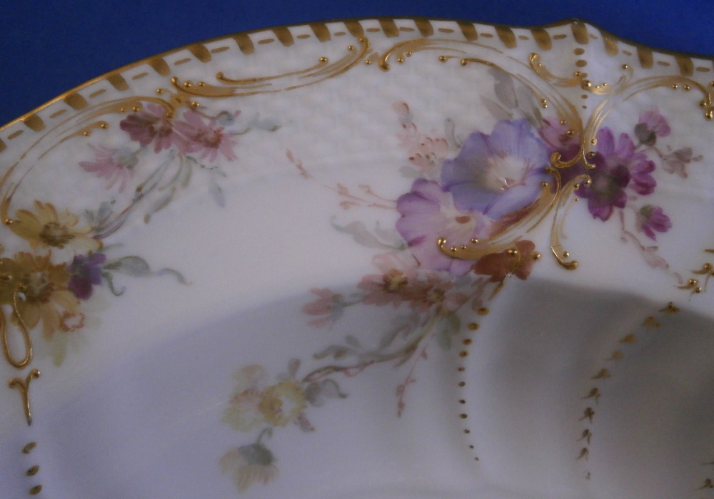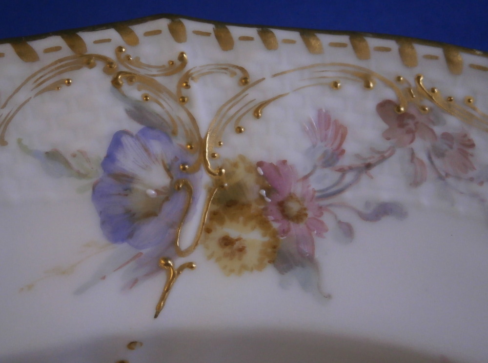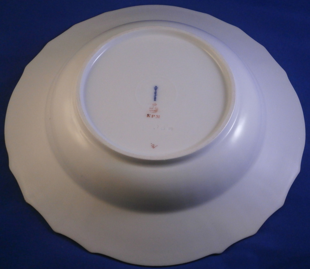 This is a really nice deep / soup plate made by KPM in the early 20th century. The piece is superbly hand paintedwith flowers in the famous Weichmalerei style that are so well liked even today. The center has a larger floral arrangement to it but the rim is what makes this plate! It has a slight relief design highlighted with raised gilding and lots of smaller flowers throughout. Gold trim to the edge. A really nice looking plate! The plate is marked underneath with the under glaze blue scepter mark as well as the red orb and the usual painter's / gilder's and impressed marks. The piece is in perfect condition! The plate 1.75 inches tall and 9.125 inches in diameter. Please email me for more information or other pictures.