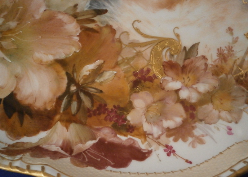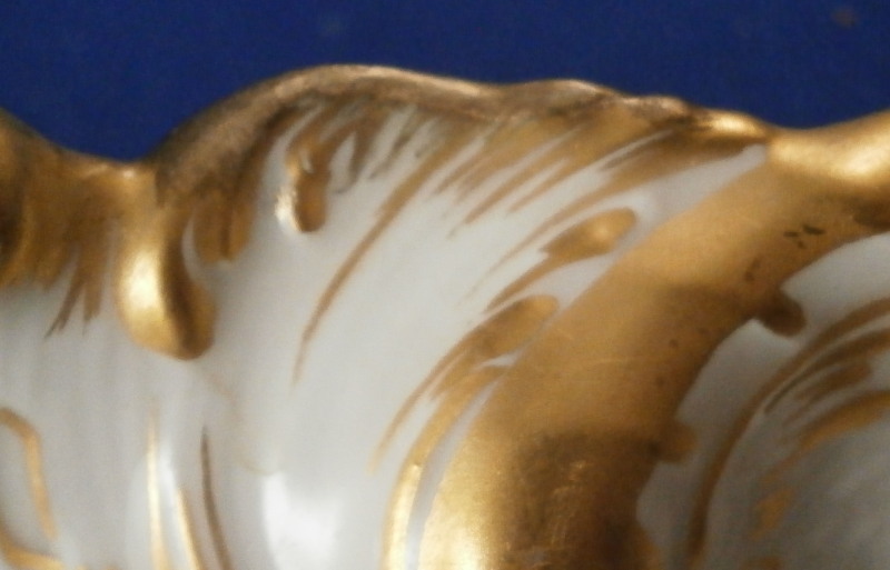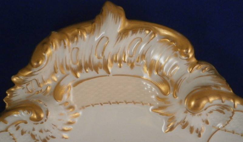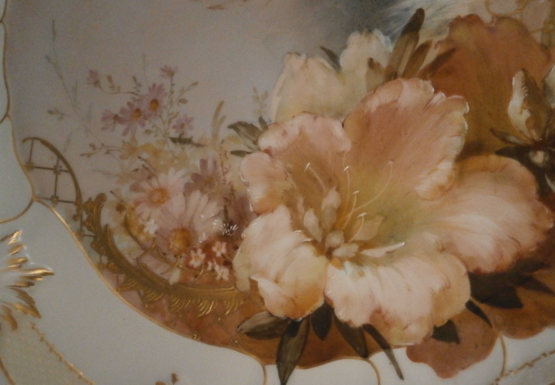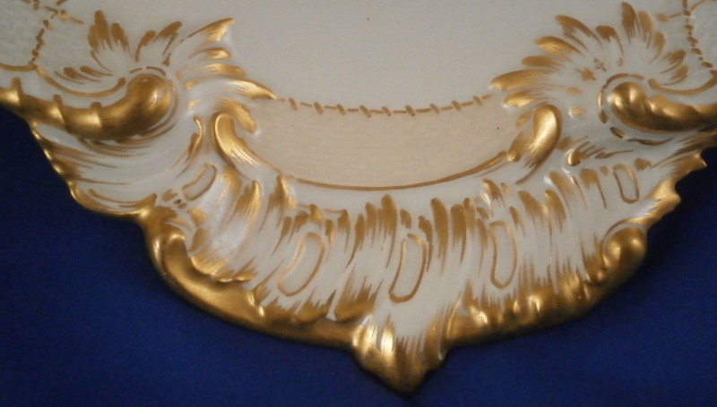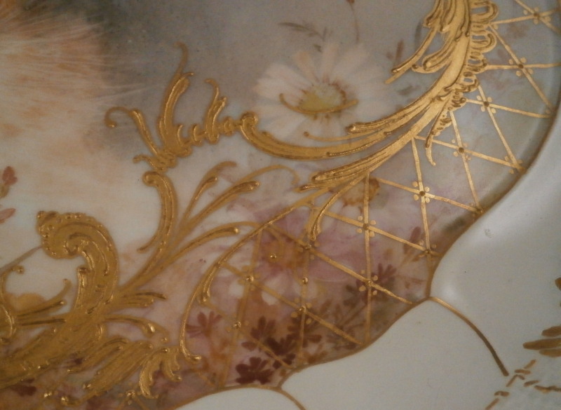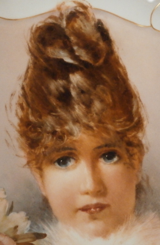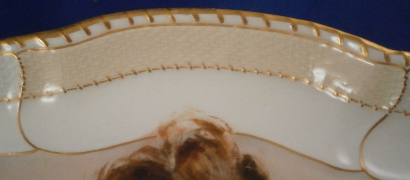 This is an amazing tray meant to be more of a portrait platter or plaque made in the Art Nouveau period by KPM in the early 20thC. The tray is in the Neu Osier style with a nice basket weave edge and lots of gold trim all around but the amazing and rather rare part is the amazing portrait of a young lady / girl with lots of flowers udnerneath in the amazing Weichmalerei style. Some nice gilding - lots of it raised to the sides over the flwoers. Just an amazing piece! The plaque / platter is meant to be shown off hanging on the wall! It is in superb condition with one spot to the left side of the left handle where the glding was touched up. Not a repair - tried to show it from both sides. It displays perfectly and looks stunning and elegant on my wall! The tray is 2 inches tall at the handles. 16.5 inches wide and 12 inches deep. It is marked underneath as shown with the under glaze blue scepter mark, the red orb, a gilder's or painter's mark as well as the usual impressed marks of the period. Please email me for more information or other pictures.