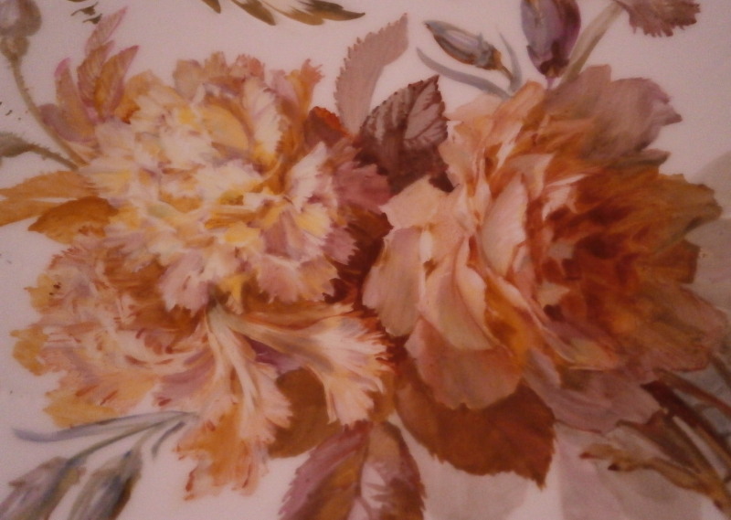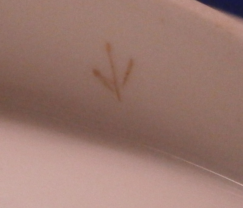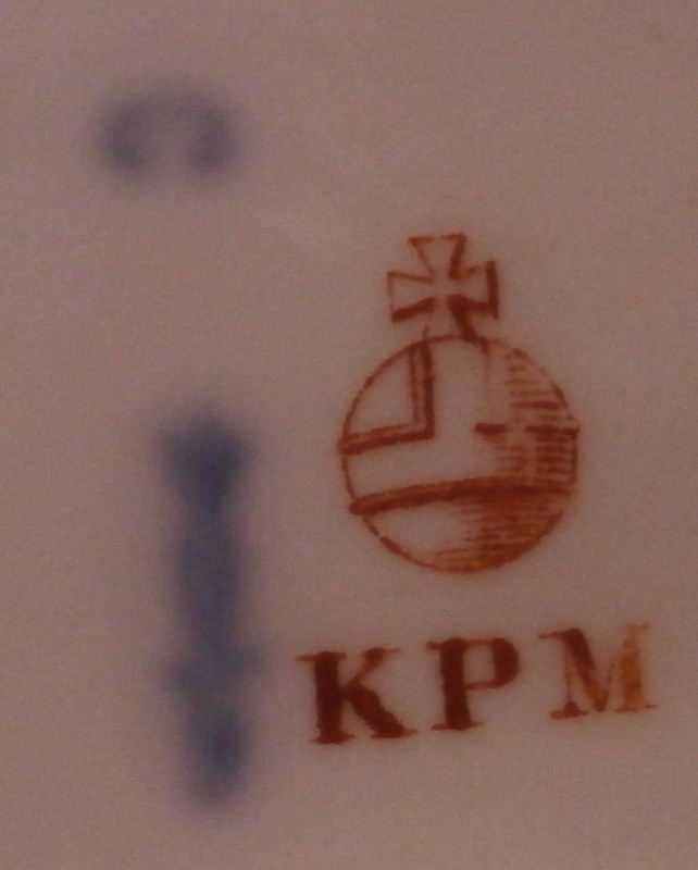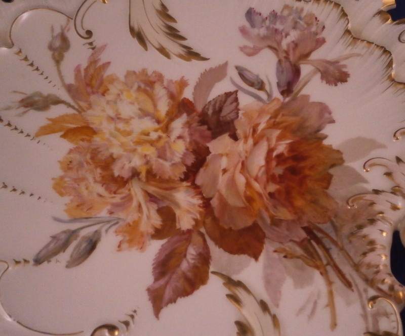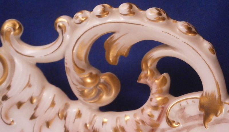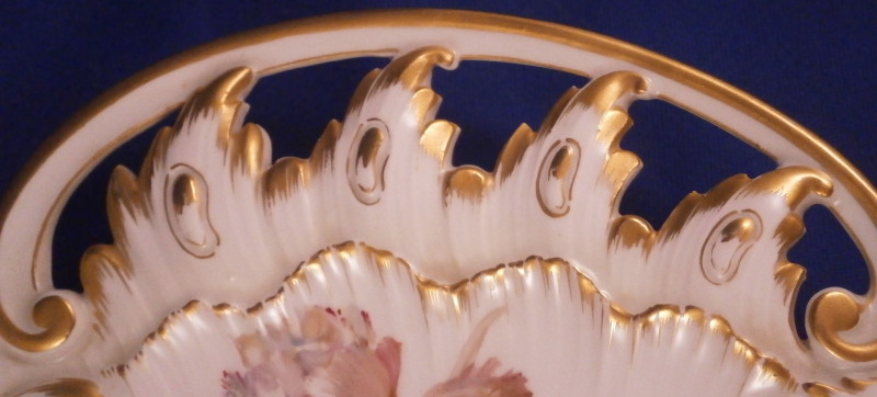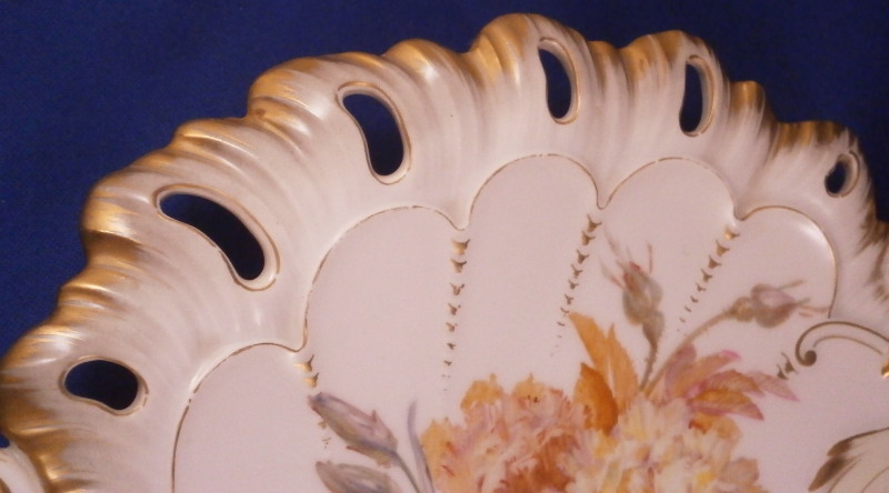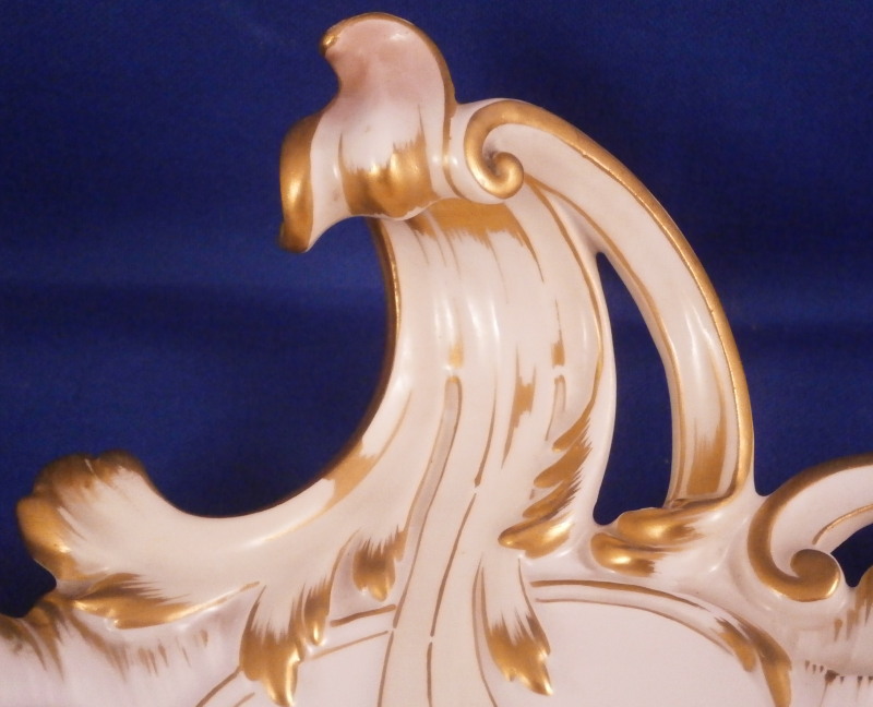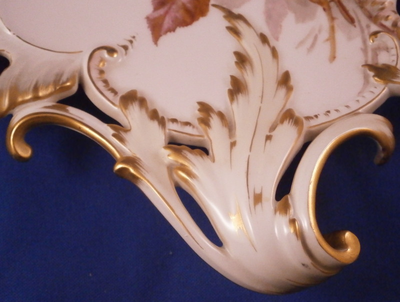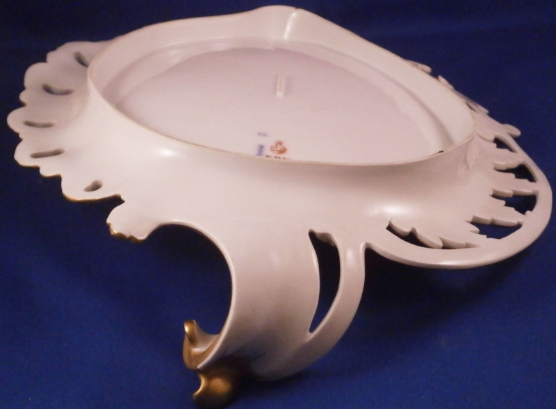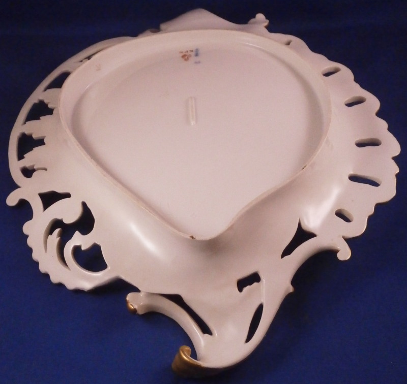 This is a superb piece made by KPM in the early 20th century. These are quite rare and usually referred to as a wall plate or plaque but I think it is more of a leaf dish for serving treats to your company. An amazing design with the sides having elaborate scroll work and cuts outs and each end a handle of sorts that is flowing and bending. Truly a treat and it could not have been easy to fire which might explain why they are so rare. The piece is superbly hand painted with lots of gilding and the center has a large floral design to it in the Weichmalerei colors so sought after by collectors even today. It does not come much nicer than this! In fact the only other one I could find online is an Aullich signed version which is stunning! The plate is in superb condition with one teeny little rough spot to the under side edge as shown. The plate is 11.375 inches long, 9 inches wide and 2.625 inches tall at the one end with the main dish being about 1.125 inches tall. The piece is marked underneath with the under glaze blue scepter, the red orb mark, as well as the usual impressed marks and a painter's or gilders mark as shown. Please email me for more information or other pictures.
