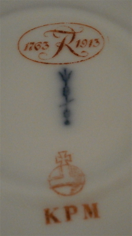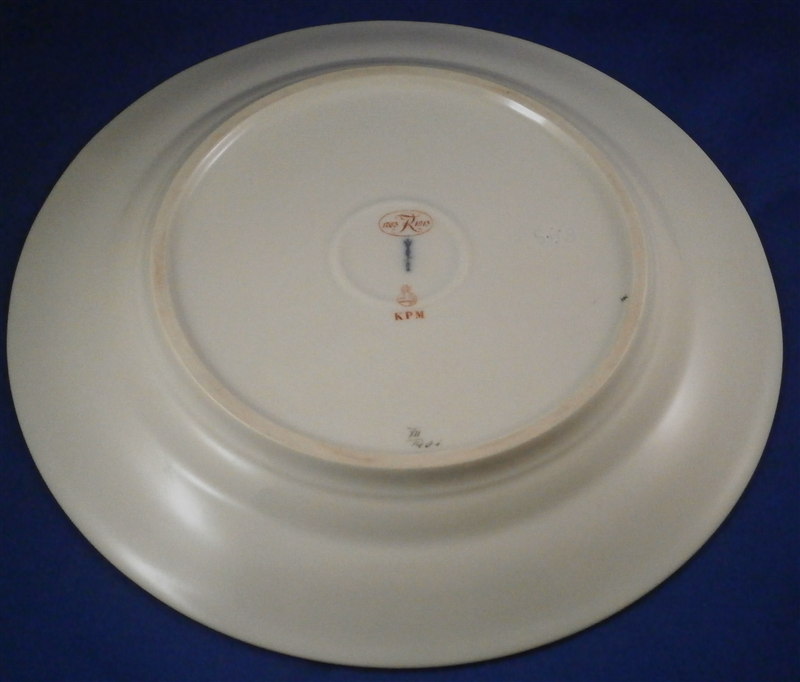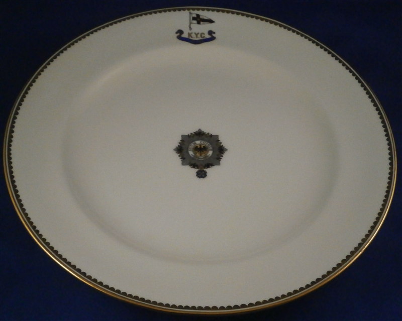 This is a superb plate plate made by KPM in 1913 for the use of Kaiser Wilhelm the Second on his Yacht the Iduna . The dinner plate has a nice gold trim to the edge with the Kaiser's flag to the top over the letters K.Y.C. over a blue banner with the name IDUNA on it. The center has the Prussian order of the black eagle medal on it with the edgle in the center underneath the words SUUM CUIQUE which means To each his own . A stunning plate from the royal yacht service in perfect condition! The piece is 1.125 inches tall and has a diameter of 10 inches. It is marked underneath with the underglaze blue scepter, the red orb, the 150 year anniversary mark in red as well as some black numbers, a black artist's mark and impressed marks common to the early 20th century pieces. Please email me for more information or other pictures.