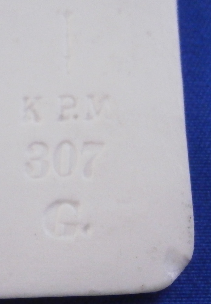 This is a superb lithophane made by KPM in the later 19th century. Simpler in terms of detail compared to many others I have come across but that gives it an Art Nouveau / Jugendstil feel and the scene has a hint of eroticism so it. The plaque is of a beautiful young lady with flowing long hair holding up her shirt just over her breasts. The scene is in an oval but the plaque is rectangular in shape. Lithophanes are not found often made by KPM, most are more modern pieces by lesser quality makers. So having a KPM made piece with a slightly erotic theme is rather unusual. it's a really nice looking piece! It is in great condition with just a tiny chip to the bottom left corner as shown. Small enough to still display perfectly! The piece is marked with the impressed scepter mark over the letters K.P.M and the number 307 and the letter G. underneath as shown. It is of a nice size being just under 6 inches wide and just over 7.25 inches tall. Please email me for more information or other pictures.