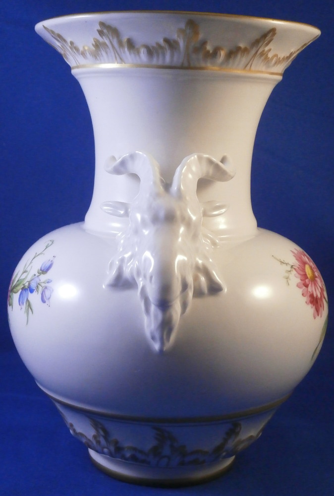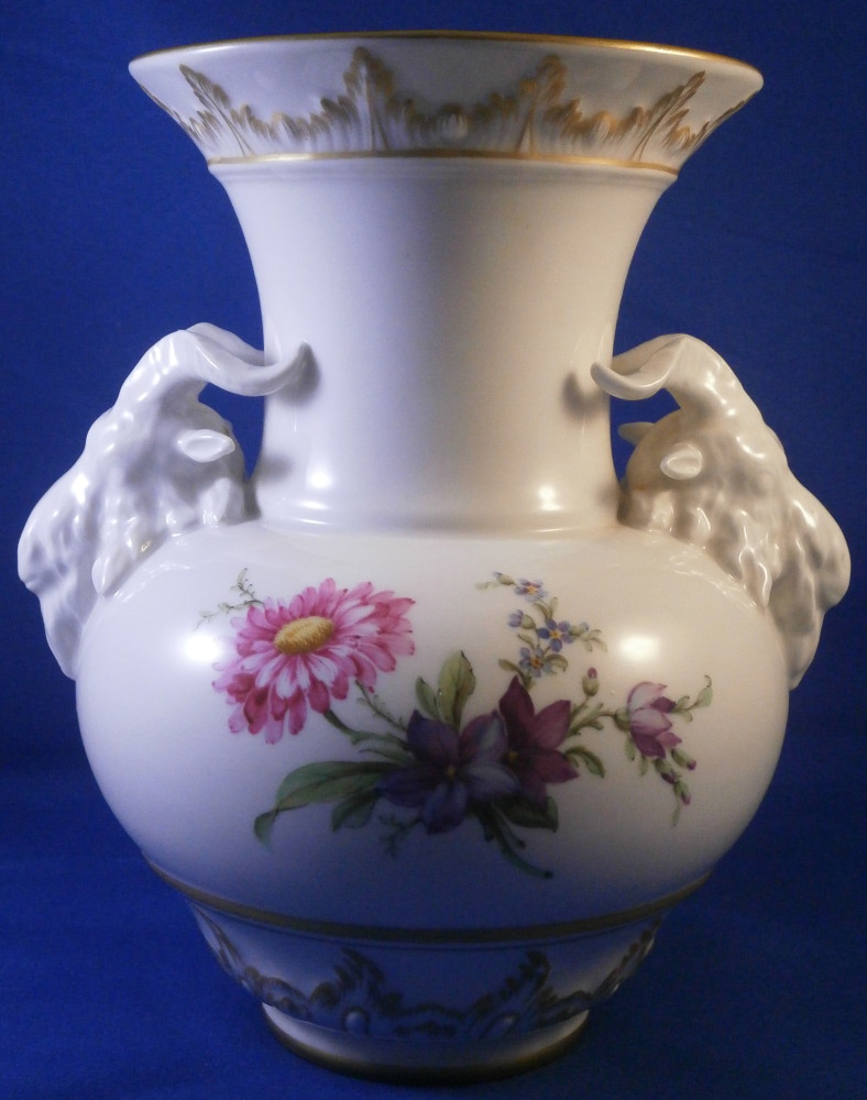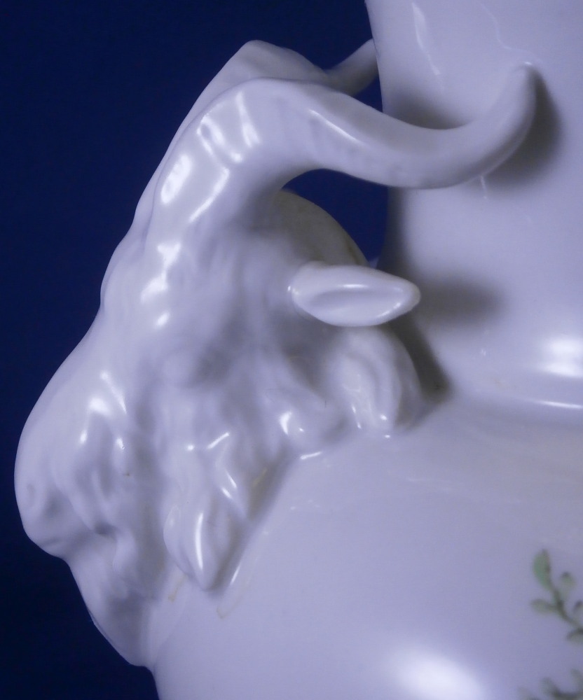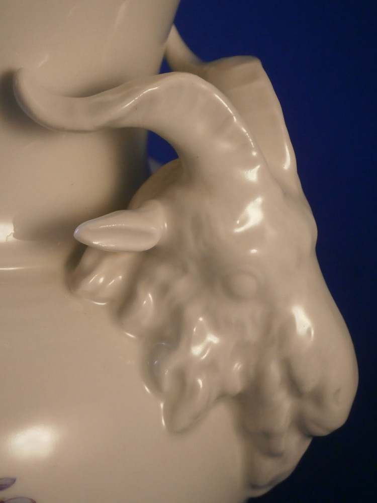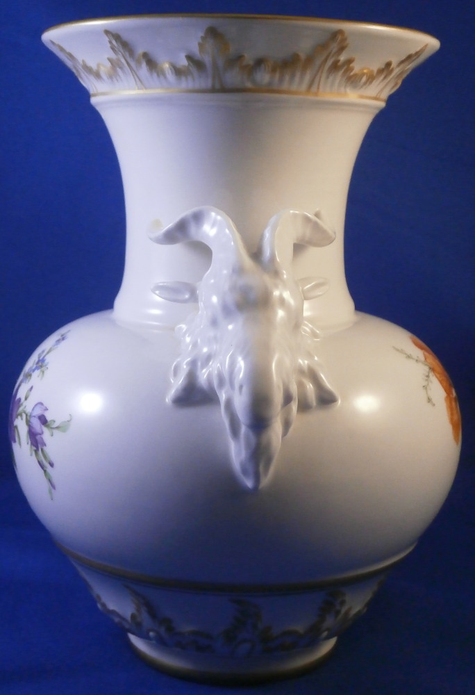 This is a fun vase made by KPM in the early 20th century. It is hand painted with two nice floral arrangements as well as some nice gold trim on a relief design along the top and bottom of the piece. My favorite part being those two amazingly detailed goat / ram heads on either side acting as handles. These are left in the white on this piece here which shows off all those superb modeling! The vase is in perfect condition and is marked underneath with the under glaze blue scepter mark, the red orb as well as usual painter's and gilder's and impressed marks normal to this period as shown. The vase is 6.625 inches tall and 4.75 inches in diameter with the handles sticking out a bit from that. Please email me for more information or other pictures.