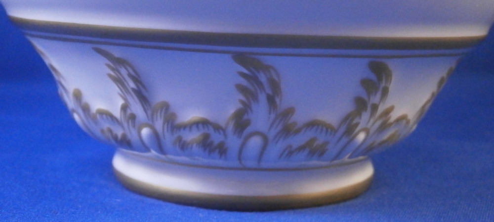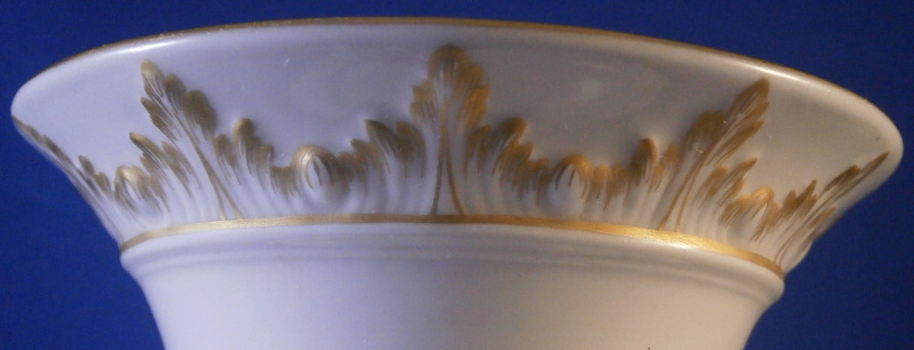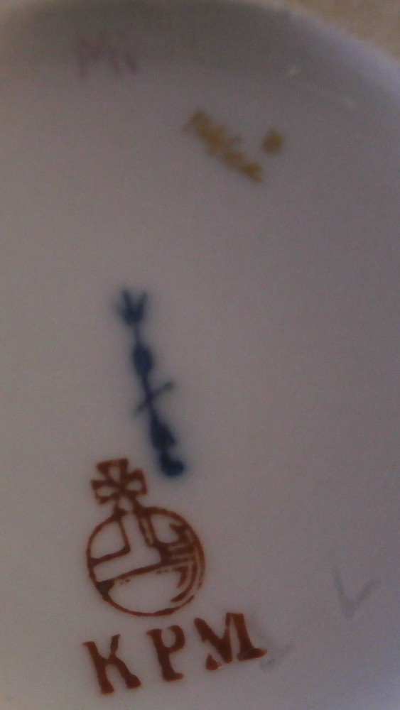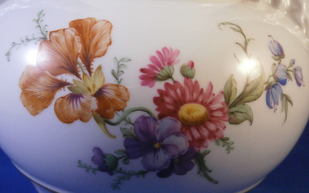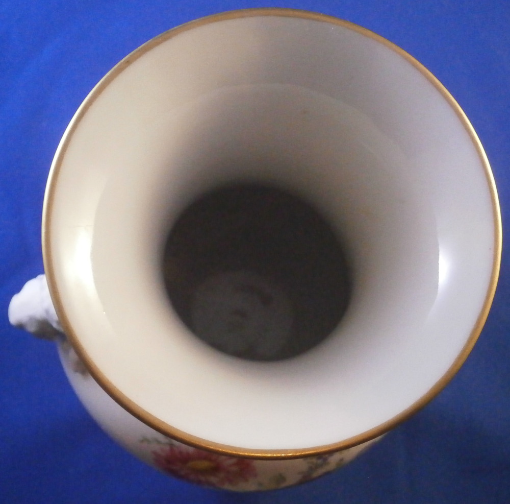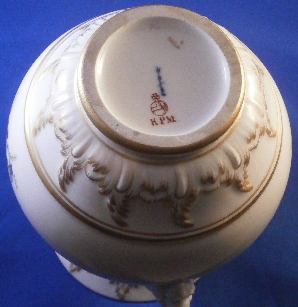 This is a fun vase made by KPM in the early 20th century. It is hand painted with two nice floral arrangements as well as some nice gold trim on a relief design along the top and bottom of the piece. My favorite part being those two amazingly detailed goat / ram heads on either side acting as handles. These are left in the white on this piece here which shows off all those superb modeling! The vase is in perfect condition and is marked underneath with the under glaze blue scepter mark, the red orb as well as usual painter's and gilder's and impressed marks normal to this period as shown. The vase is 6.625 inches tall and 4.75 inches in diameter with the handles sticking out a bit from that. Please email me for more information or other pictures.