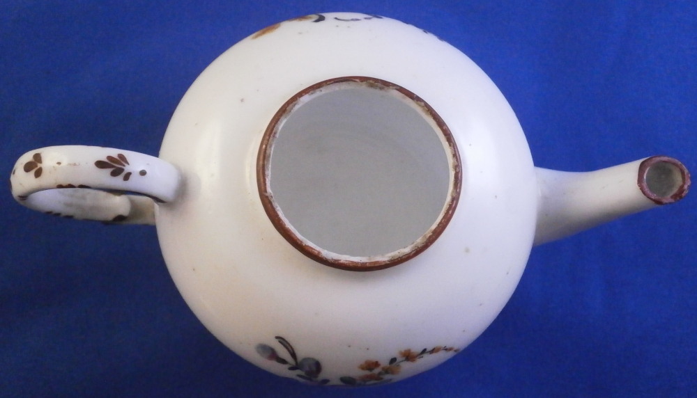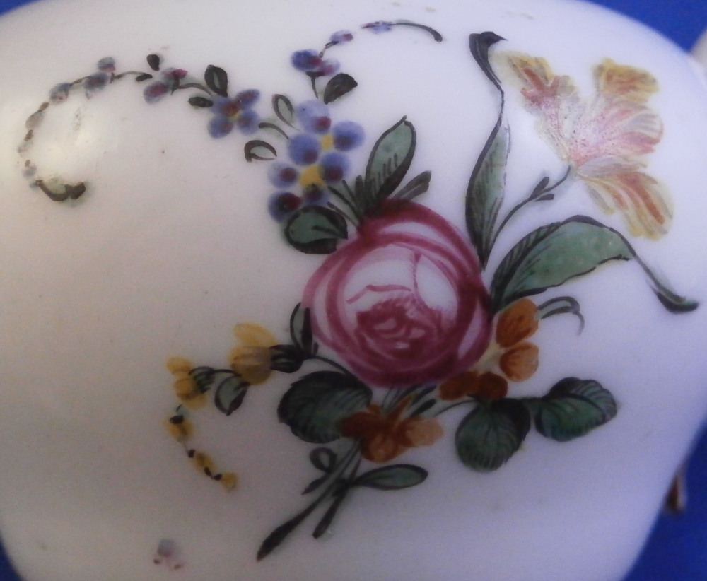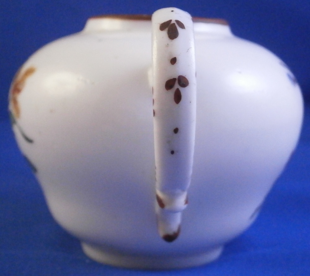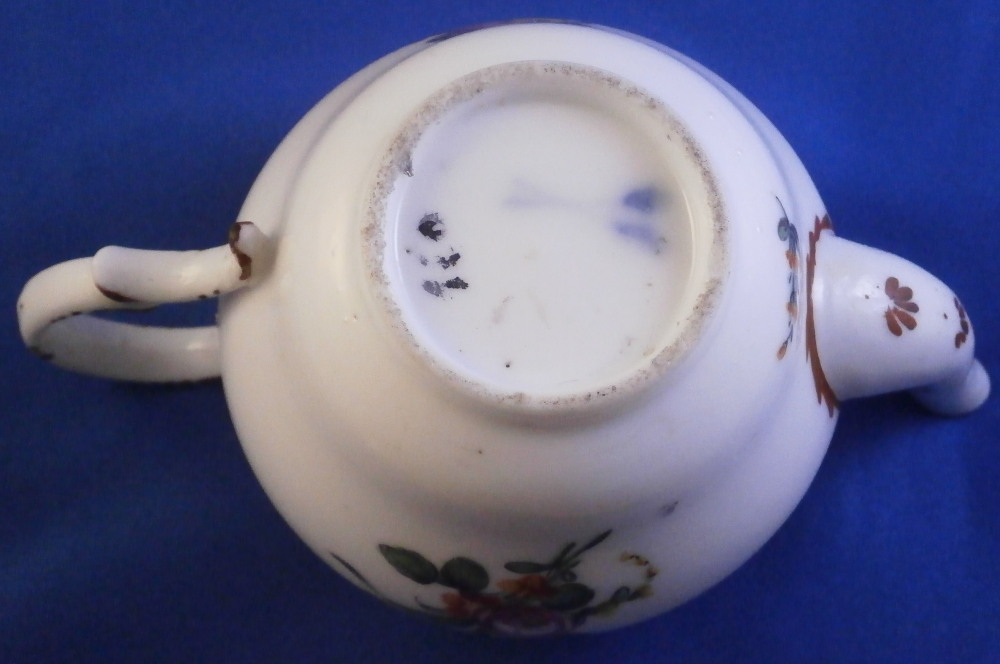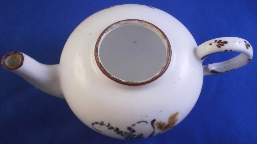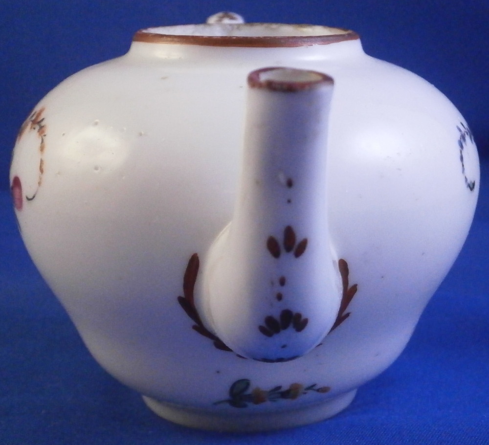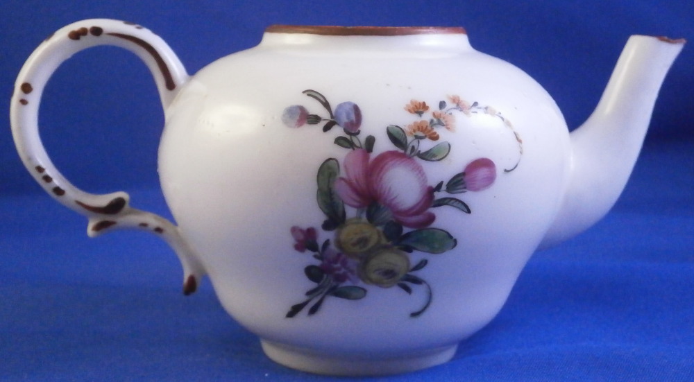 This is a super cute miniature teapot made by Rue de la Fontaine au Roi also known as La Courtille or Locre in the late 18th century. Never seen a little one like this by them. Probably for a solitaire or tete a tete. The piece has a hand painted floral arrangement to both sides with a small single flower under the spout. Reddish brown trim to the nicely shaped handle amd spout. The tea pot is in good condition with some minor damage to the spout tip and some minor roughness to the inside of the top opening but that appears to be from when it was made. The lid is a perfect fit but the brown trim was painted on later so it is a matched piece. It works very well and if the color was fired on one would never know. The finial is damaged a bit as shown. It is marked underneath with the crossed arrows in under glaze blue as shown meant to imiate the top German maker's mark. The little piece is about 3.5 inches tall including the finial, 5.375 inches from handle to spout and 3.25 inches wide. Please email me for more information or other pictures.