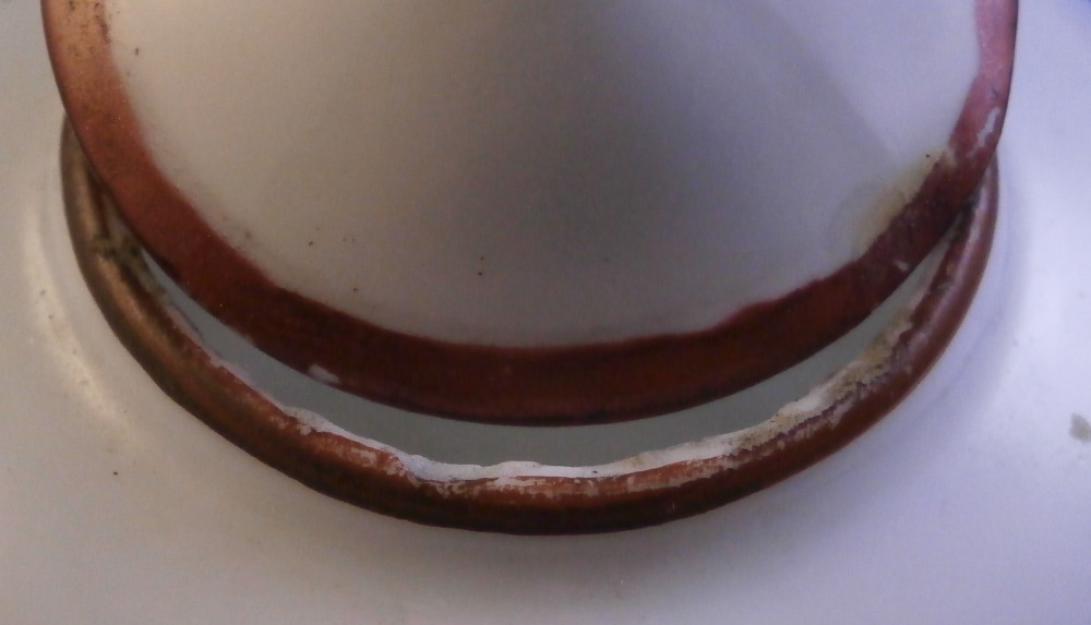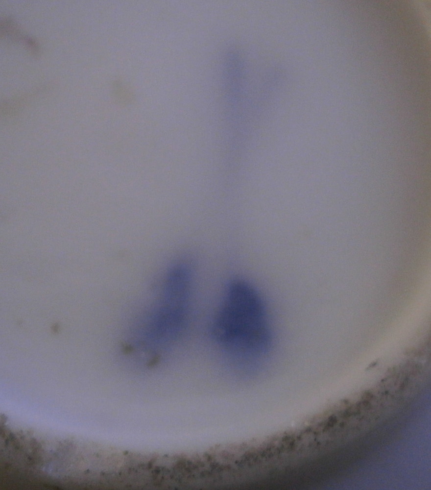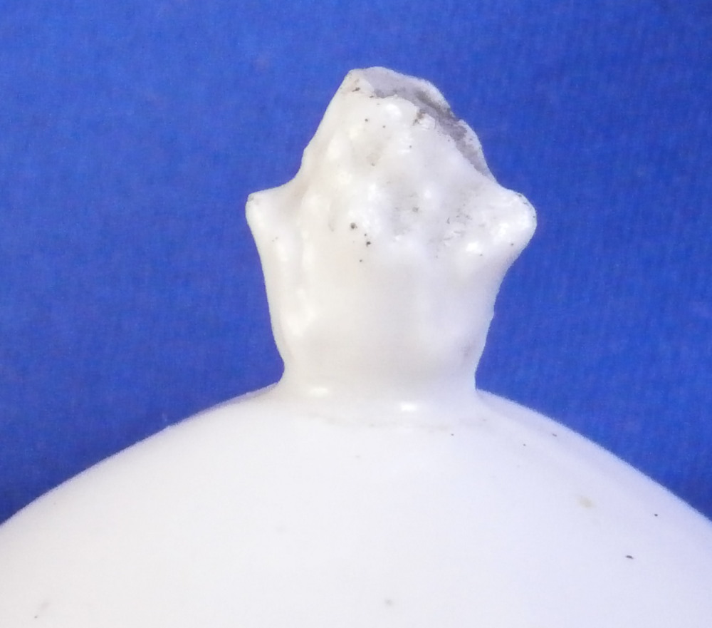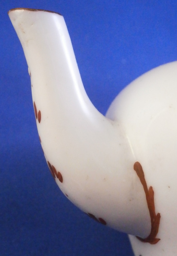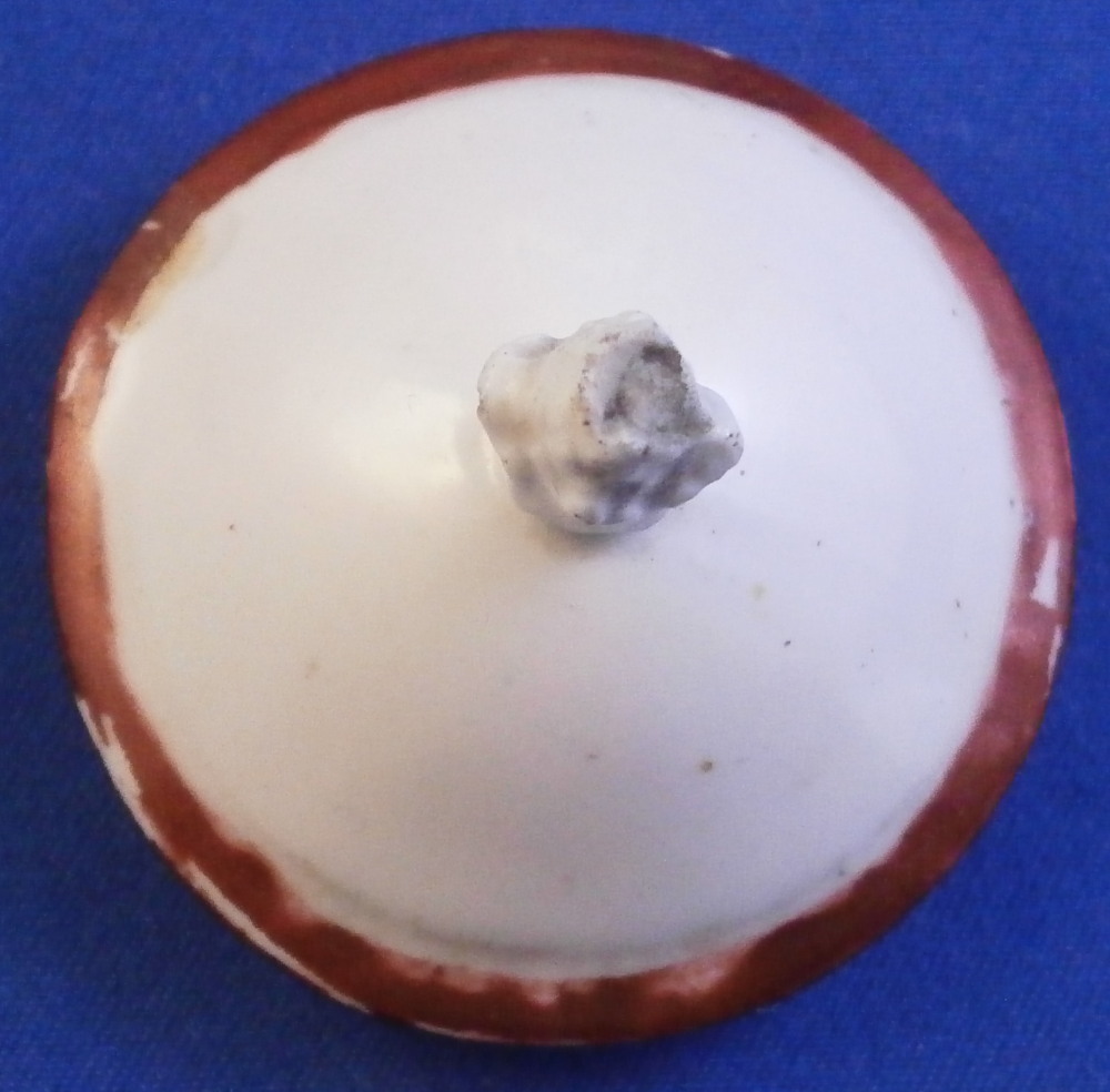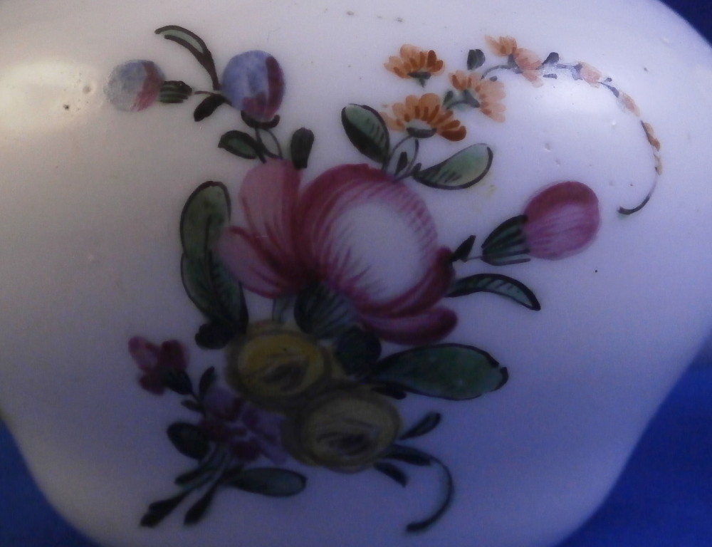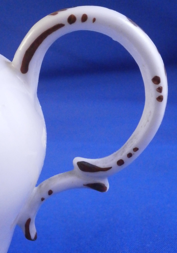This is a super cute miniature teapot made by Rue de la Fontaine au Roi also known as La Courtille or Locre in the late 18th century. Never seen a little one like this by them. Probably for a solitaire or tete a tete. The piece has a hand painted floral arrangement to both sides with a small single flower under the spout. Reddish brown trim to the nicely shaped handle amd spout. The tea pot is in good condition with some minor damage to the spout tip and some minor roughness to the inside of the top opening but that appears to be from when it was made. The lid is a perfect fit but the brown trim was painted on later so it is a matched piece. It works very well and if the color was fired on one would never know. The finial is damaged a bit as shown. It is marked underneath with the crossed arrows in under glaze blue as shown meant to imiate the top German maker's mark. The little piece is about 3.5 inches tall including the finial, 5.375 inches from handle to spout and 3.25 inches wide. Please email me for more information or other pictures.