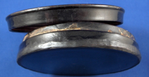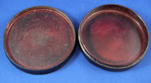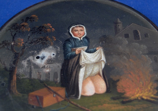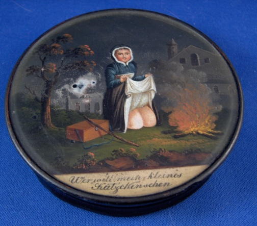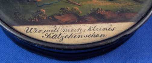 This is a lacquer box made in Germany in the beginning of the 19th century. It is handpainted with an erotic scene in the manner of Stobwasser . The scene is of a lady lifting the front of her skirt to warm up by a fire. Fishing gear and box next to her, two houses and a tree behind her and some rocks and flwoers in the front. German saying underneath - Wer will mein kleines Kaetzchen sehen - translates to - who would like to see my little kitty (substitute kitty for another word for the true meaning). The box is in good condition with a spot of wear to the left of the lady. Also the bottom rim of the box has been overpainted since some of the rim must have chipped over time. One spot on outside rim of lid as well. Some general wear and a wax reside where the lid fits over the box maybe to provide a better seal? Doesn't take away from the piece really. Might even be restored better if need be. A rare theme and quite decorative. Not signed. The box is a bit over 0.75 inches tall and 3.75 inches in diameter. Please email me for more information or other pictures.