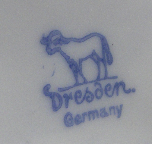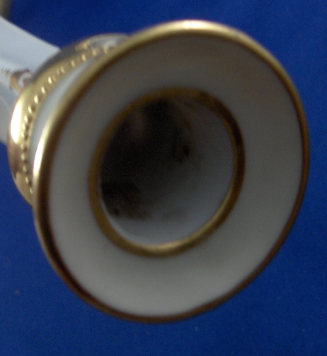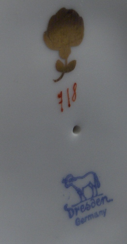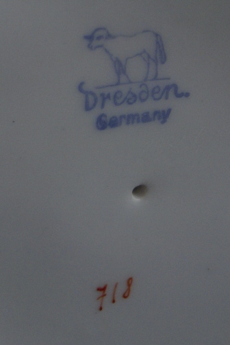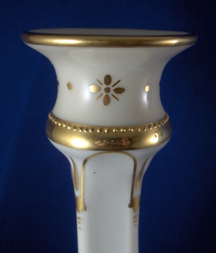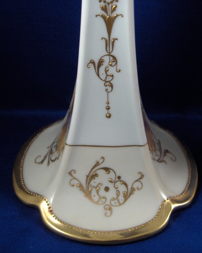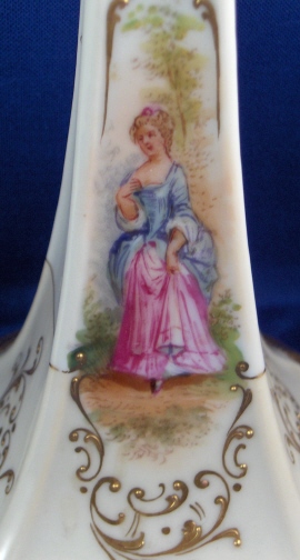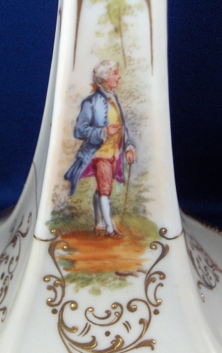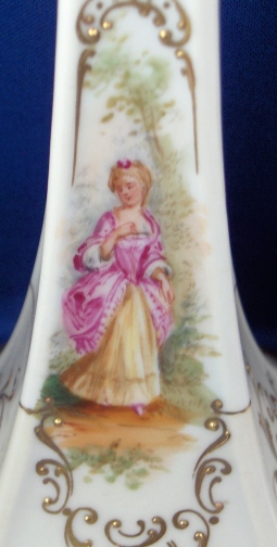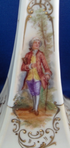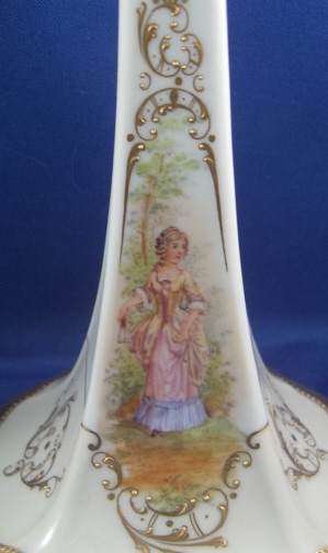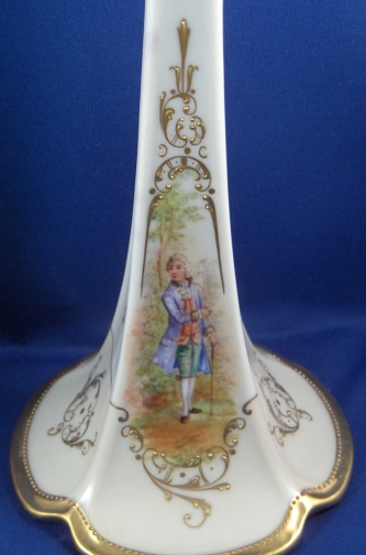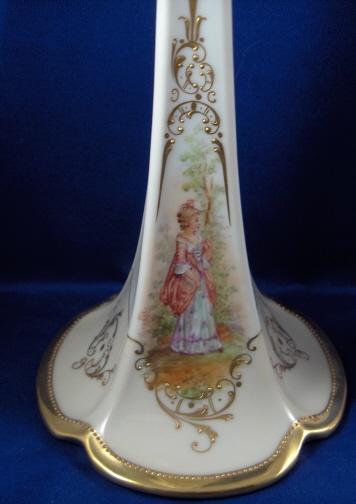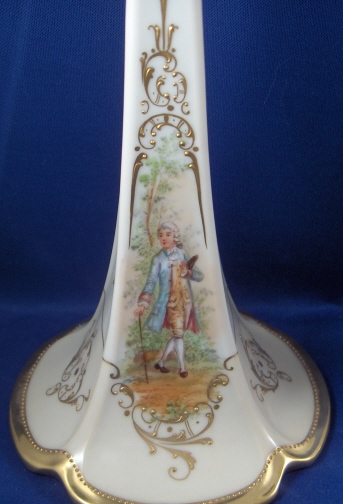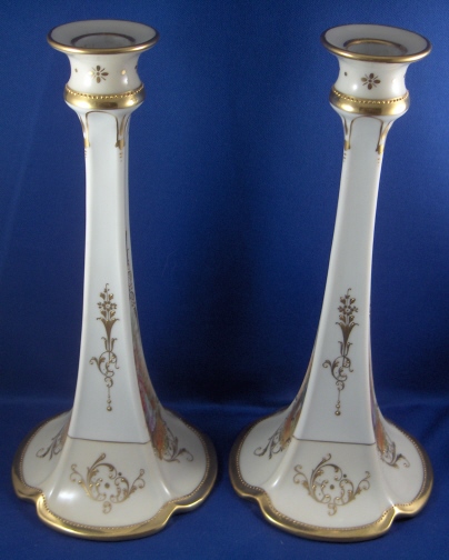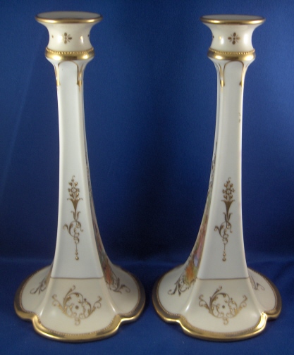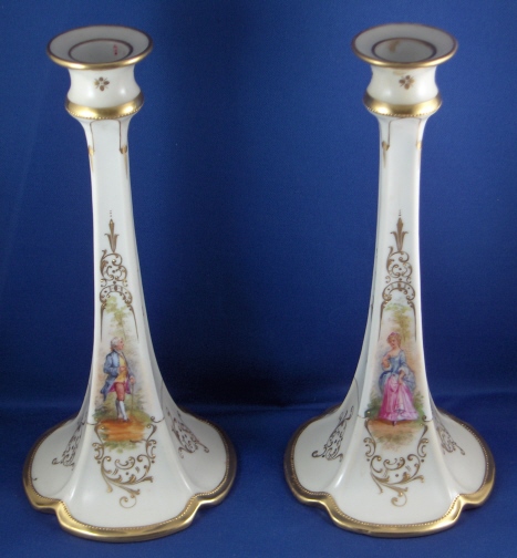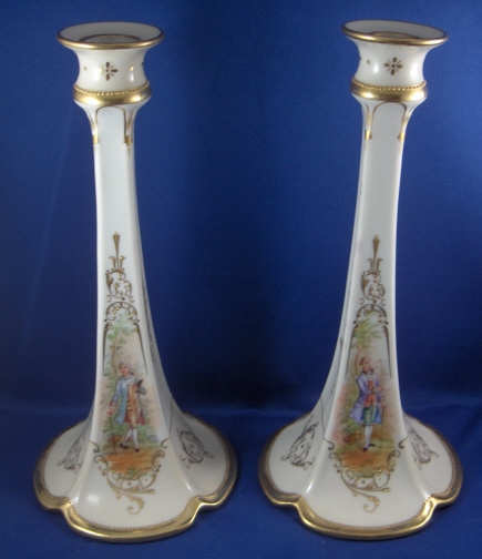 This is a superb set of two pairs of candle holders made by A. Lamm of Dresden around 1920. Actually it was really a decorating studio that painted blanks made at other places which is also the case here. He founded the studio around 1887 and it closed somewhere around the beginning of the second world war. They made very high quality items and these sticks are a good example of that. They are all handpainted with two scenes each - one of a gentleman and one of a lady. Then there is lots of high quality raised gold trim and the if you look very closely at the pictures - especially the ones of the sides - you can see there is a different background color in the bottom and top section of the candleholders. Just enough to make them super elegant. Nice gold trim to top and bottom as well. These are in perfect condition with the tiniest of gold wear. They are of a nice size being 9.5 inches tall and 4.5 inches in diameter. The hole for the candle is 0.875 inches in diameter. Both are marked underneath with the sheep mark with the words Dresden and Germany underneath. Also a gold rose that covers the blank porcelain makers mark and a number 718 in red which is probably a decor number. I will sell the pairs separately if someone just wants one. Please email me for more information or other pictures.