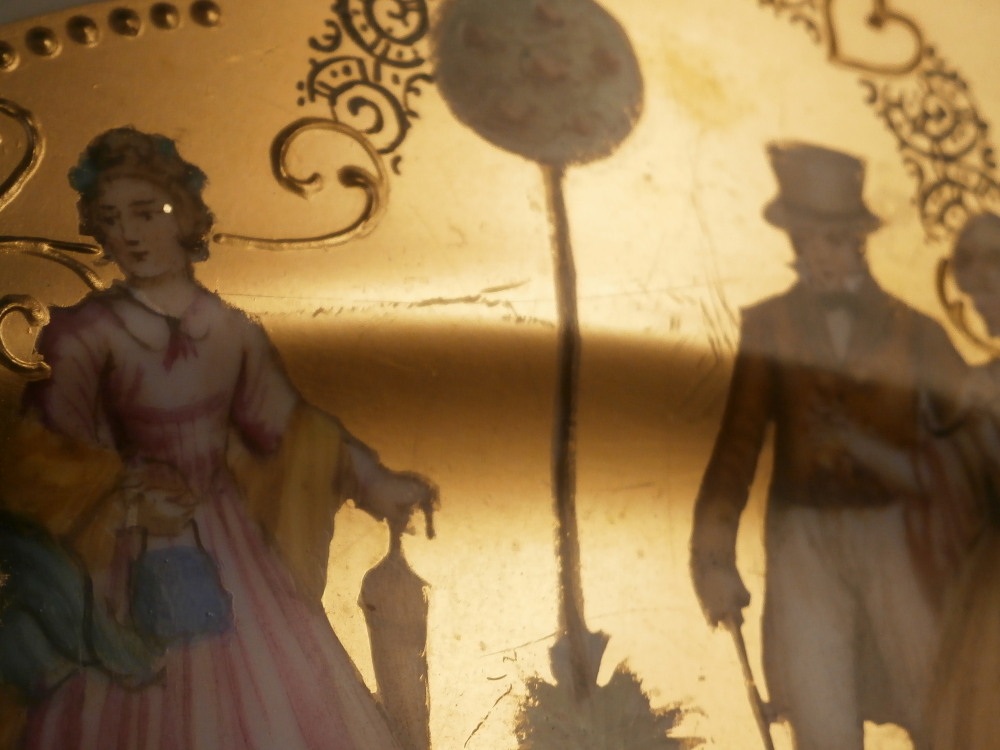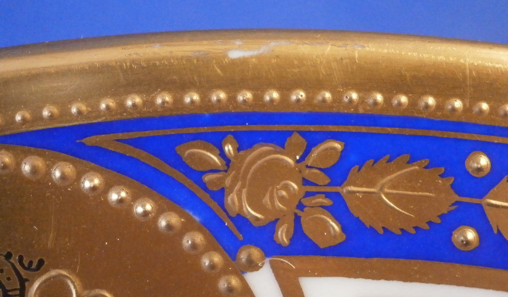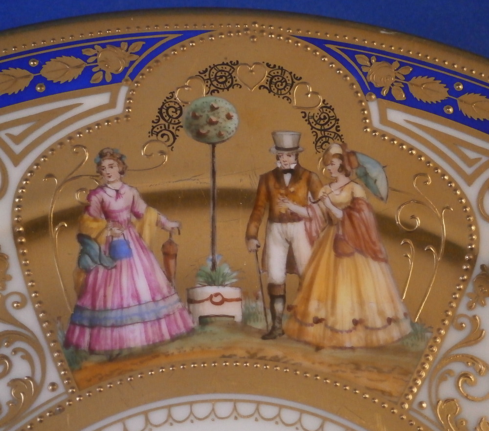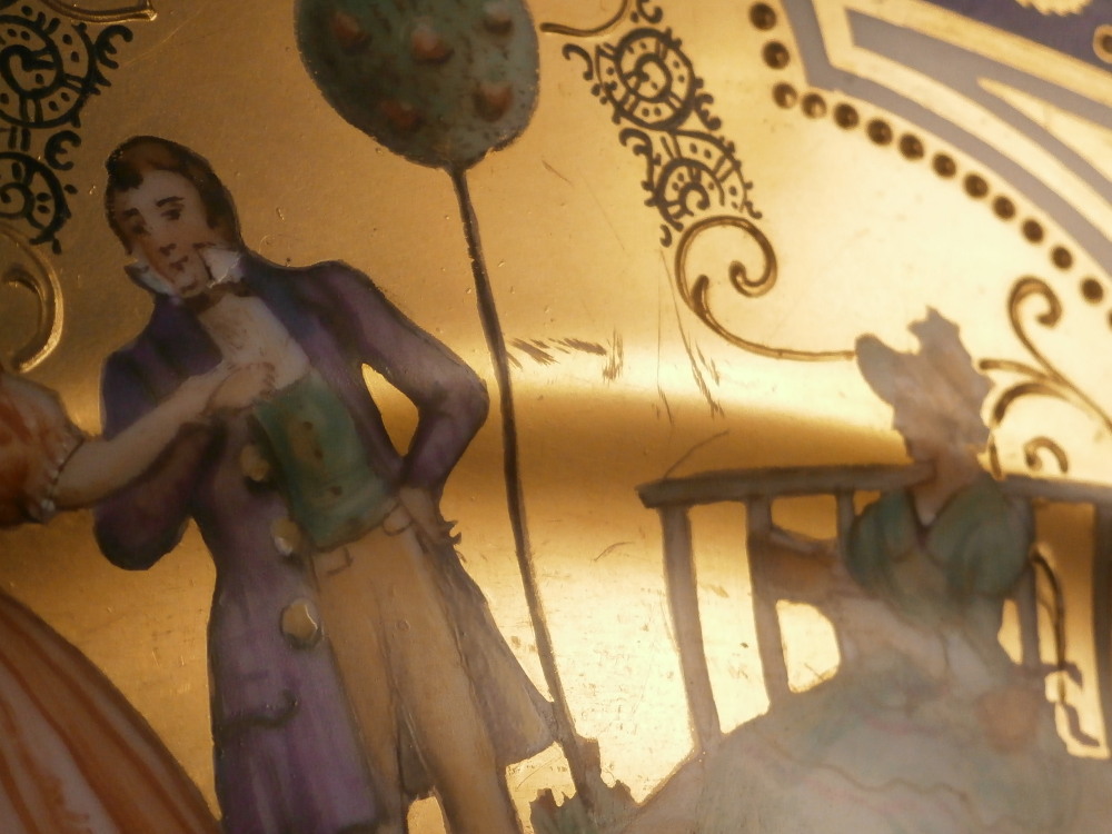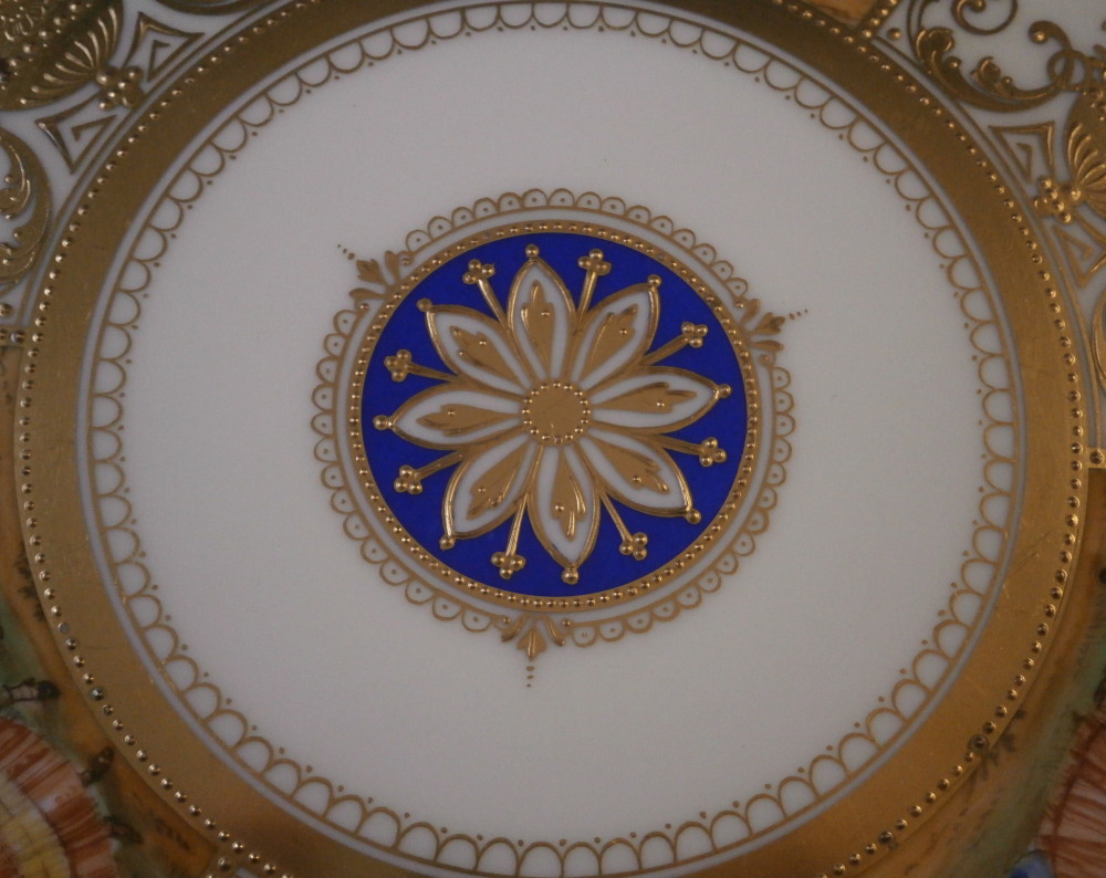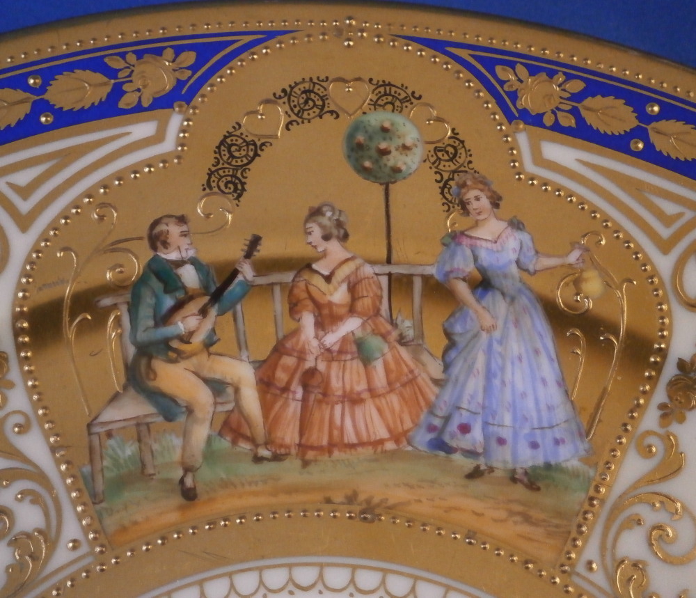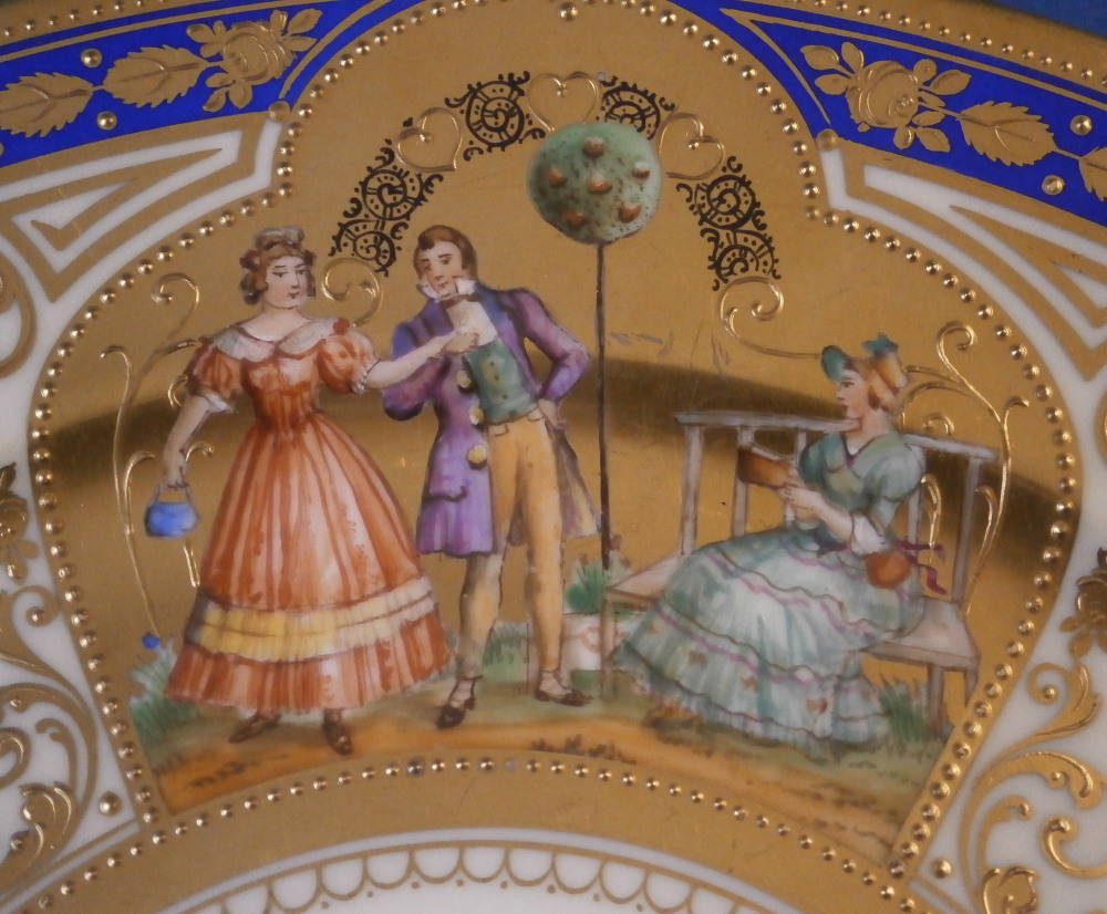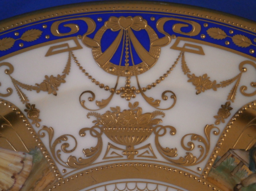 This is a superb plate painted by the Ambrosius Lamm decorating studio in Dresden in the 1930's. He founded the studio around 1887 and it closed somewhere around the beginning of the second world war. They made very high quality items and this plate here is very much a perfect example of that. It is hand painted with three fantastic scenes that include three people doing different things. The polychrome people are surrounded by gold with a bit of a black design to the top part as well as raised elements to the gold including little hearts. In between these panels are three panels with raised gold deisngs on an ivory ground with a blue ground along the rim with more gold deigns to it. Gold trim to the edge with a riased gold dot ring. The center has a blue ground and gold design medallion to it with a gold ring below the scenes. A bit hard to describe all that detail so have a look at the photos. An amzing plate! f It is marked with their lamb mark as well as Dresden and Made in Saxony though these are covered by a leaf design. Also the number 283 and the name of a porcelain retailer this piece was made for. A gold mark and green x as well. The piece is in superb condition with the tiniest of wear / use marks. Displays perfectly. The plate is 1 inch tall and 10.875 inches in diameter so it is rather large. Please email me for more information or other pictures.