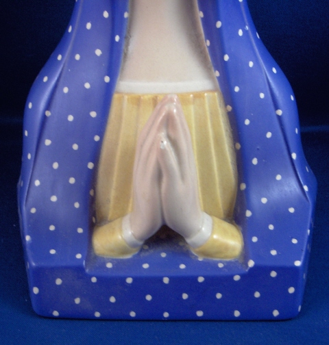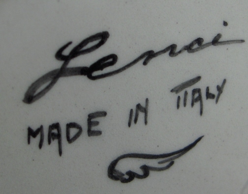 This is a bust of the Madonna made by Lenci around 1930. She is nicely modelled and very well handpainted in bright cheerful colors. The bust is in good condition with a small glaze chip to the front pinky finger which doesn't take away from the piece and would be a quick and cheap fix if need be. Also there is a small glaze line on the bottom of her left side but I don't think it is a hairline but more of a glaze flaw by the look of it. The piece is marked underneath with the word Lenci then Made in Italy and a Wing in black. It is also signed underneath with an incised RB odd looking initials and something I cannot make out. One her right side in the blue she is signed P. Bologna or something like that. Hard to photograph but it is there. The bust is about 8.5 inches tall, 6 inches wide and 5.625 inches deep. Please email me for more information or other pictures.