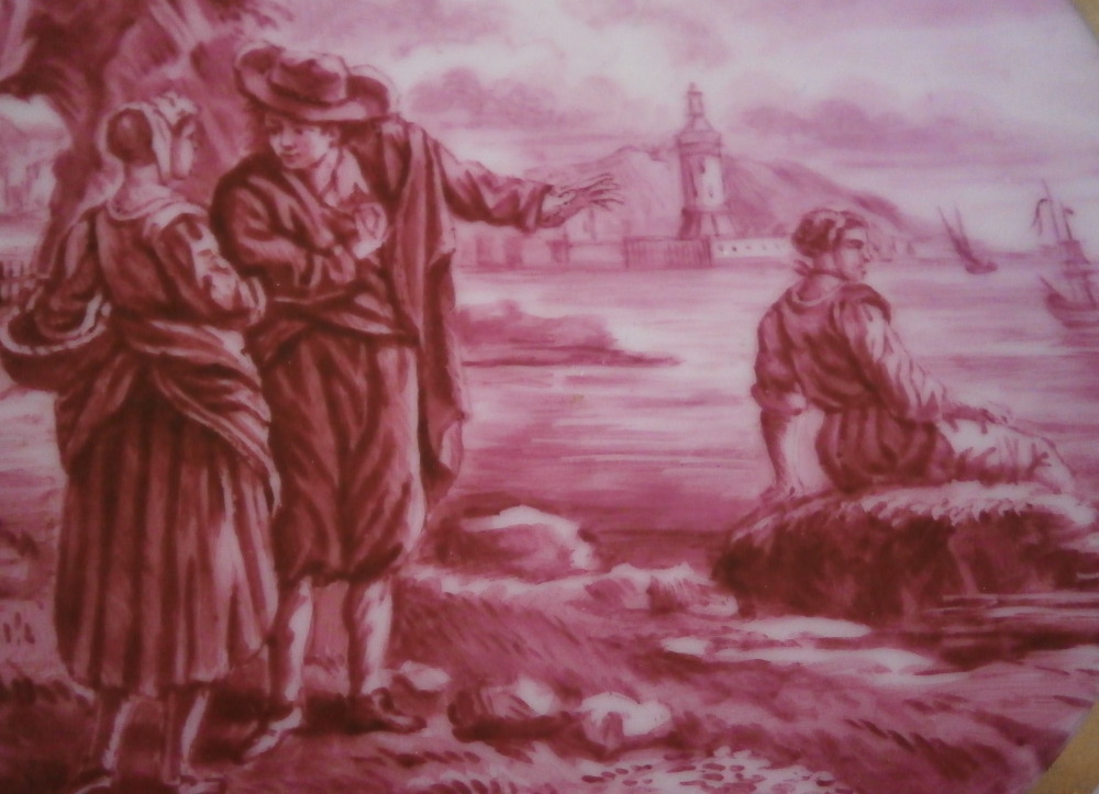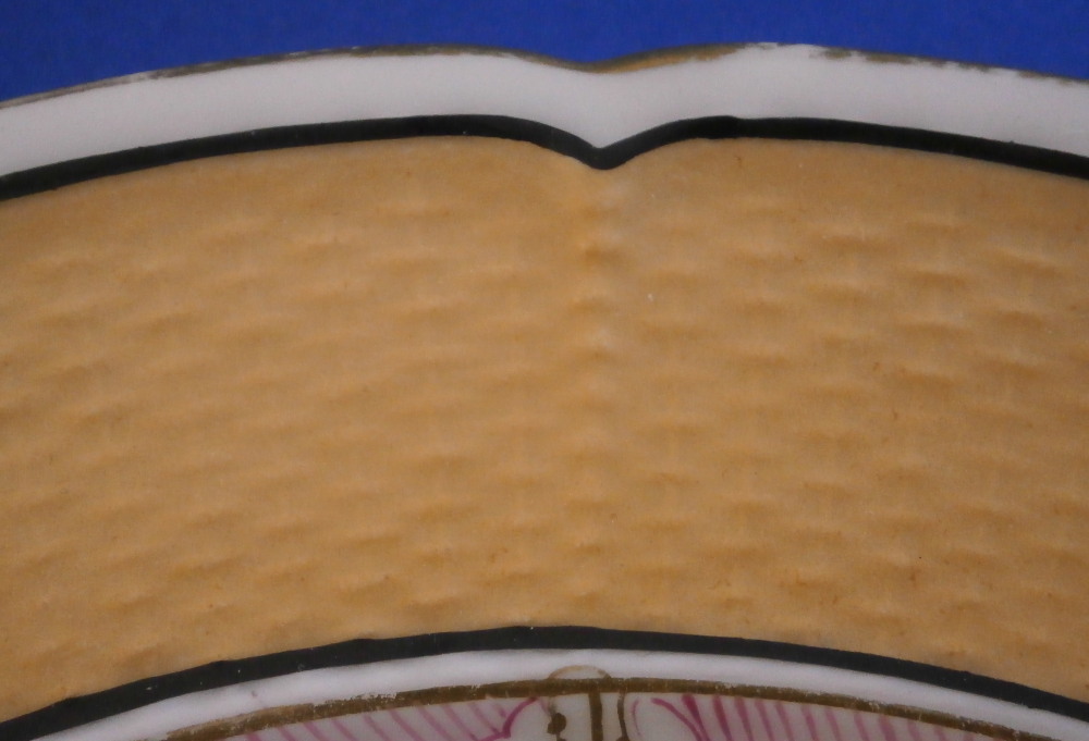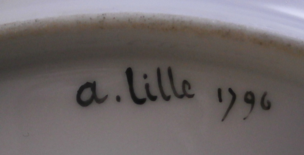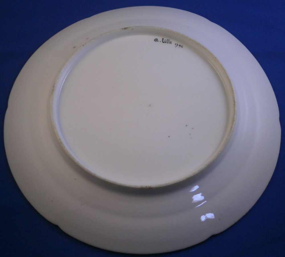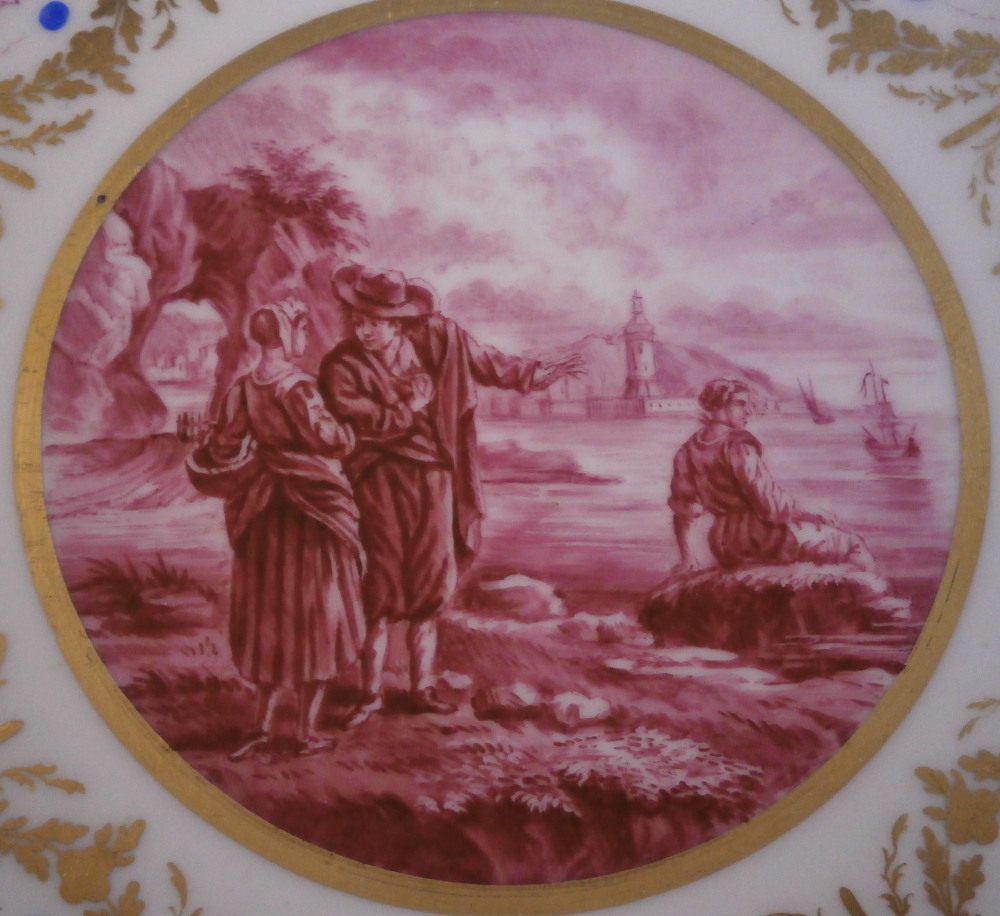 This is a superb plate made by Lille in the early 19th century. The factory was founded in 1784 by Leperre-Durot which was protected by the Dauphin. It closed around 1817 after some changes of ownership over its short existence. Most pieces one finds are painted with flowers so I was excited to find this one here which has a superb hand painted scene in the center in puce of superb quality. There is a couple standing to one side and a lady sitting on a rock on the shore looking out towards the ocean with ships in the background as well as a lighthouse. Nice landscape all around. The scene has a gold band around it with a fancy gold, pink and blue trim to the edge of the well, an orangey ground color to the rim which has a basketweave design to the paste and a thin black line to either side. Gold trim to the edge. The piece is already hard paste and more in the Paris taste than other earlier Lille pieces I own and ahve seen. This piece was made towards the end of the factory when they used the a Lille mark as shown. It's a really nice plate with a very good quality scene in the center. The plate is in superb condition with some minor wear to the golding mainly along the outer edge. It displays perfectly! The plate is marked with the black a. Lille 1796 mark as shown. It is just over 1 inch tall and 9.25 inches in diameter.  Please email me for more information or other pictures.
