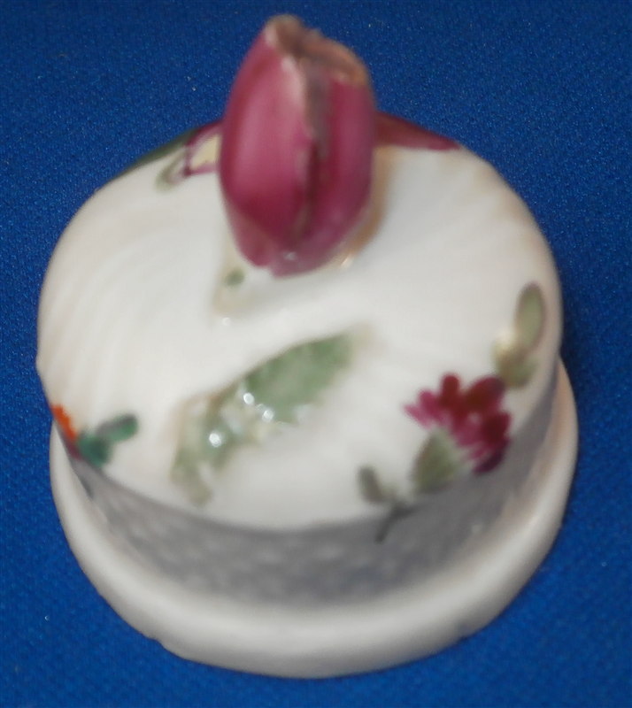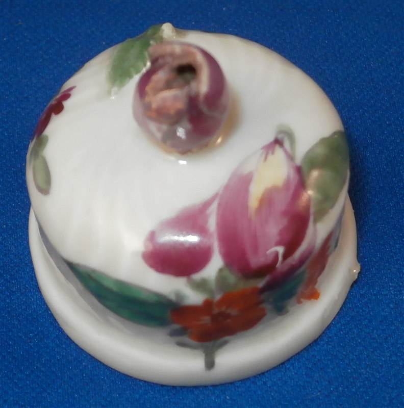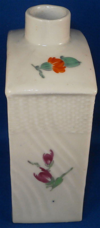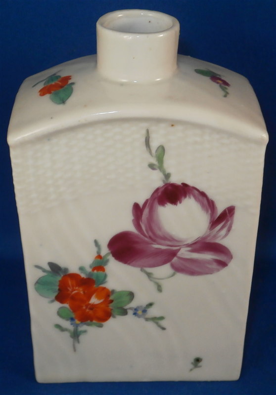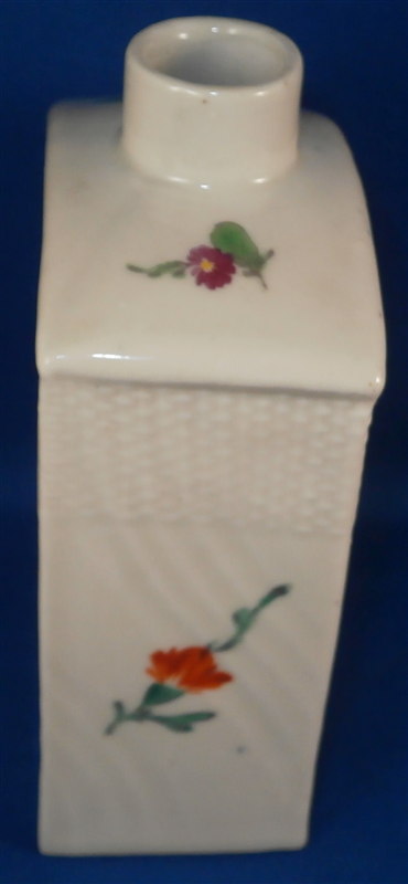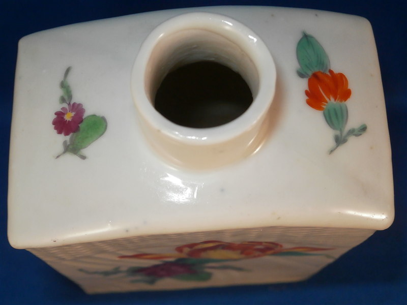 This is a nice tea caddy / jar with its lid made by Limbach around 1775. The piece is hand painted with a nice floral arrangement on both the front and the back, a small flower to either side as well as the top and more flowers on the lid. The paste has a relief basket weave design to it and the lid has a flower finial. The shape of the finial is quite typical for Limbach! The teacaddy is not marked but I am certain it was made by them. It is in great condition with a little damage to the flower finial and the stem from the leaf to the flower is missing but it is nice to have the original lid! The piece is 5.25 inches tall, 2.75 inches wide and about 1.625 inches deep. Please email me for more information or photos.