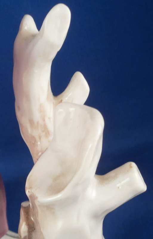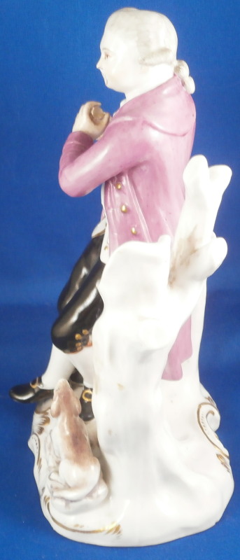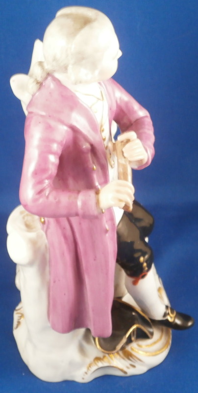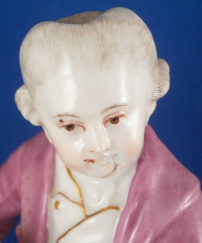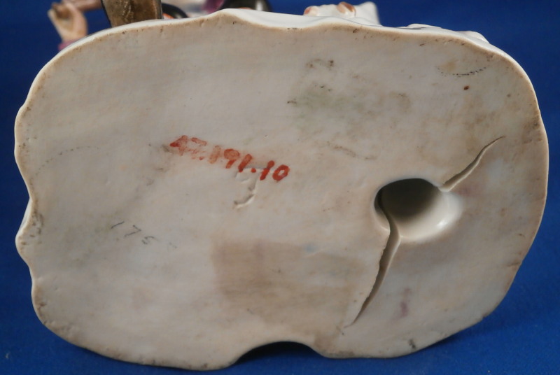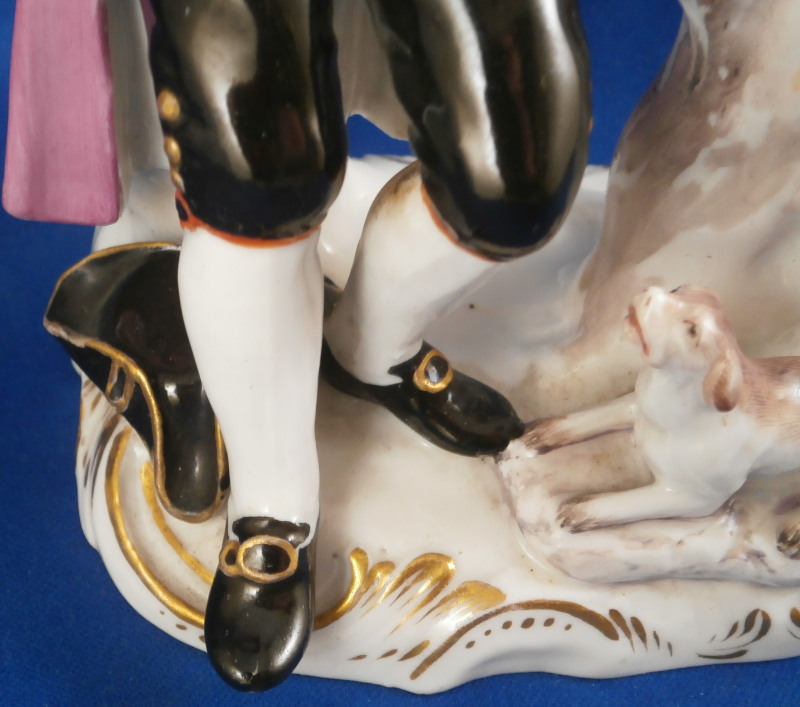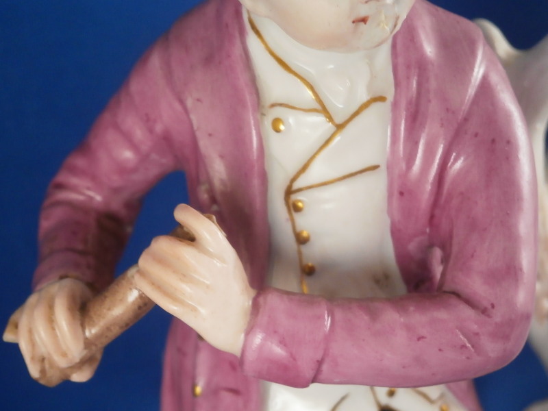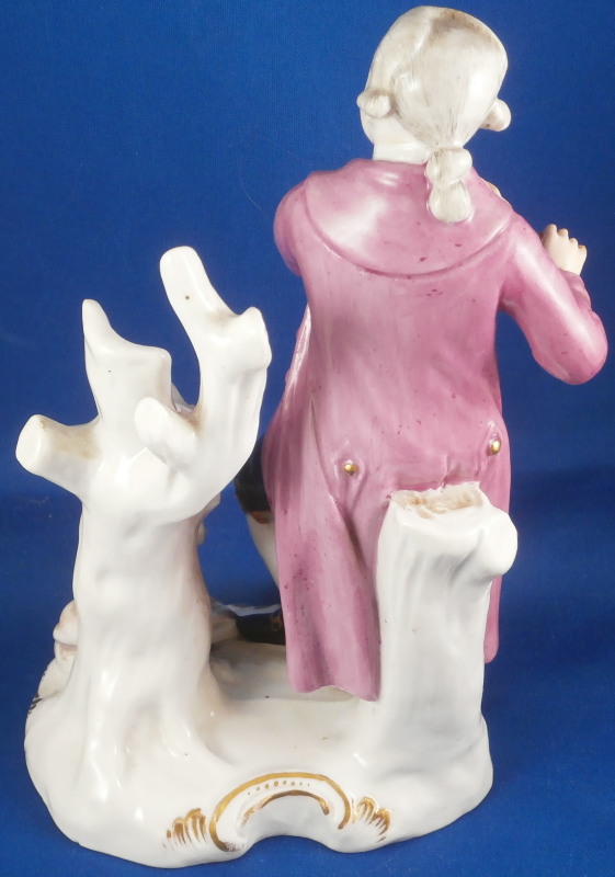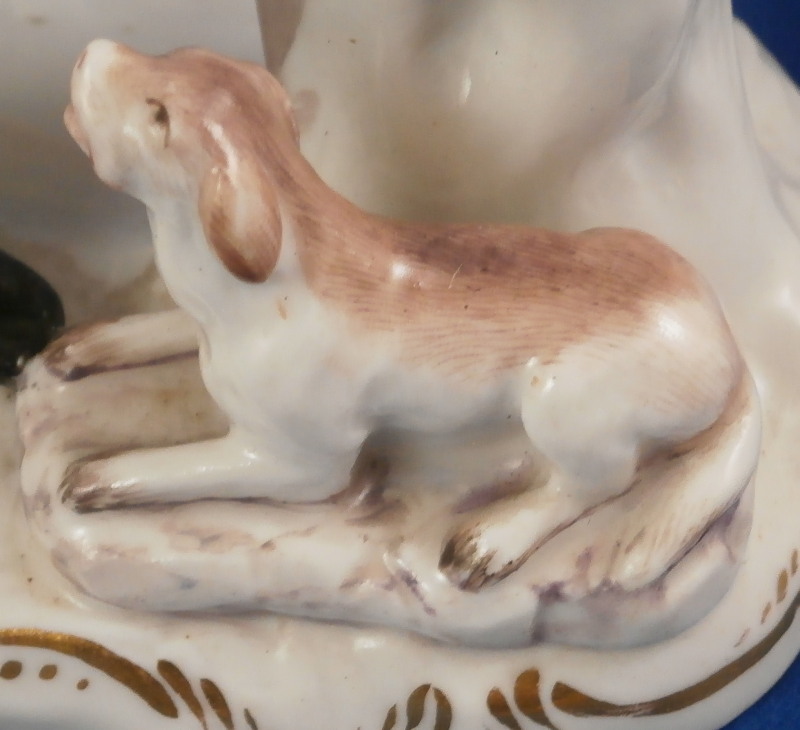 This is a superb figurine made by Limbach around 1780. The figure is larger than the others I have owned and the addition of the dog super cute! The piece is of a gentleman playing the flute with a dead tree stump with some branches still attached next to him, his hat by his feet and the little dog looking up to him. The piece is very well modeled and hand painted with lot of detail. The coloring simpler than some other makers but I think that makes it very elegant. Nice scroll work along the edge of the base highlighted with gilding. It is of two cherubs holding a garland of flowers. One is sitting on a rock the other leaning on a stump of a tree. The figurine is in great condition with the only issue being that the flute is mostly gone and that has left a chip to his mouth area whereit would have been attached and the pinky on his right hand is missing to top half. Firing crack to the underside only. Other than that the piece is in perfect condition. The figure is 6.75 inches tall, 4.25 inches wide and 3.25 inches deep. There is only an incised F on the udnerside but unmarked pieces are normal for this maker. There is an old museum ID on the underside as well. Please email me for more information or photos.