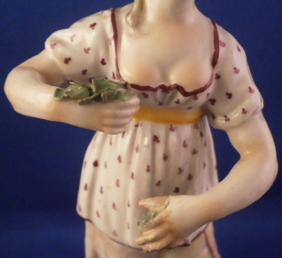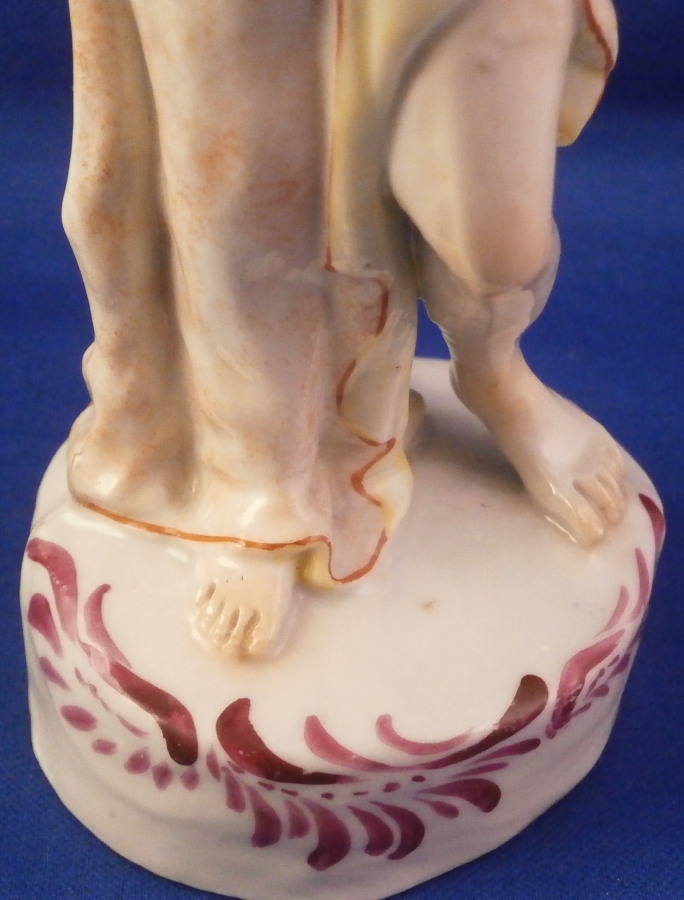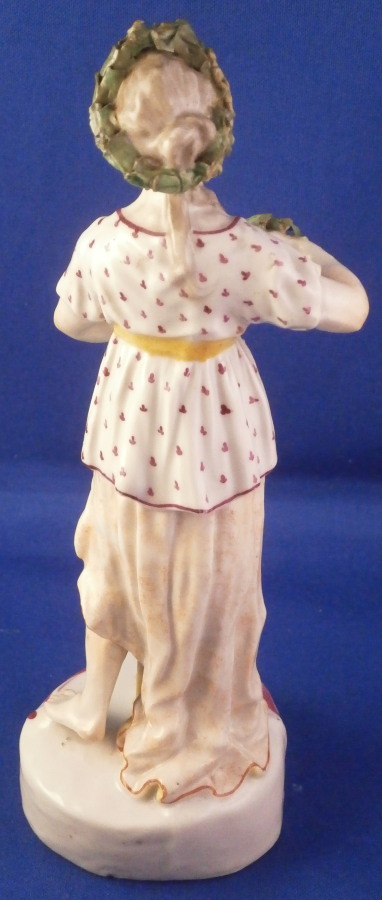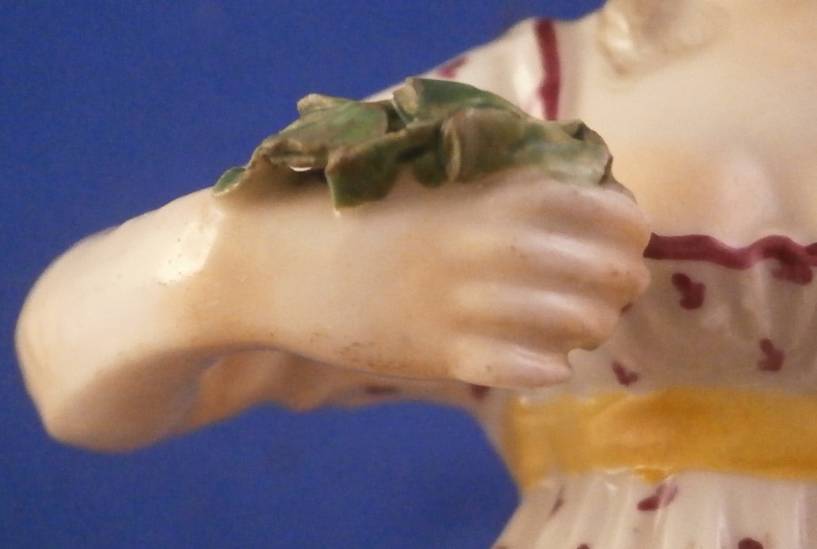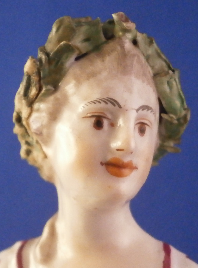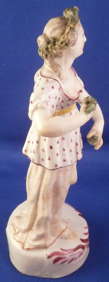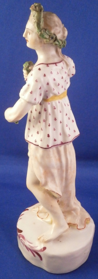 This is a figurine made by Limbach in about 1780. It is of a lady wearing a long skirt with a nice top, has a leaf garland in her hair and pieces of leaf garland in her hands. Typical base with puce scrolls to the front. The figure is unmarked but quite typical for them. There is a very similar one of almost the same lady holding a baby chick. The figurine displays superbly with some issues on the right side of the leaf garland in her hair, damage to the leaves in her hands and her left fingers have been worked on as well. Still a rare piece worthy of owning. The figurine is not marked underneath which is fairly common. She is 7 inches tall and the base is about 2.5 inches in diameter. Please email me for more information or photos.