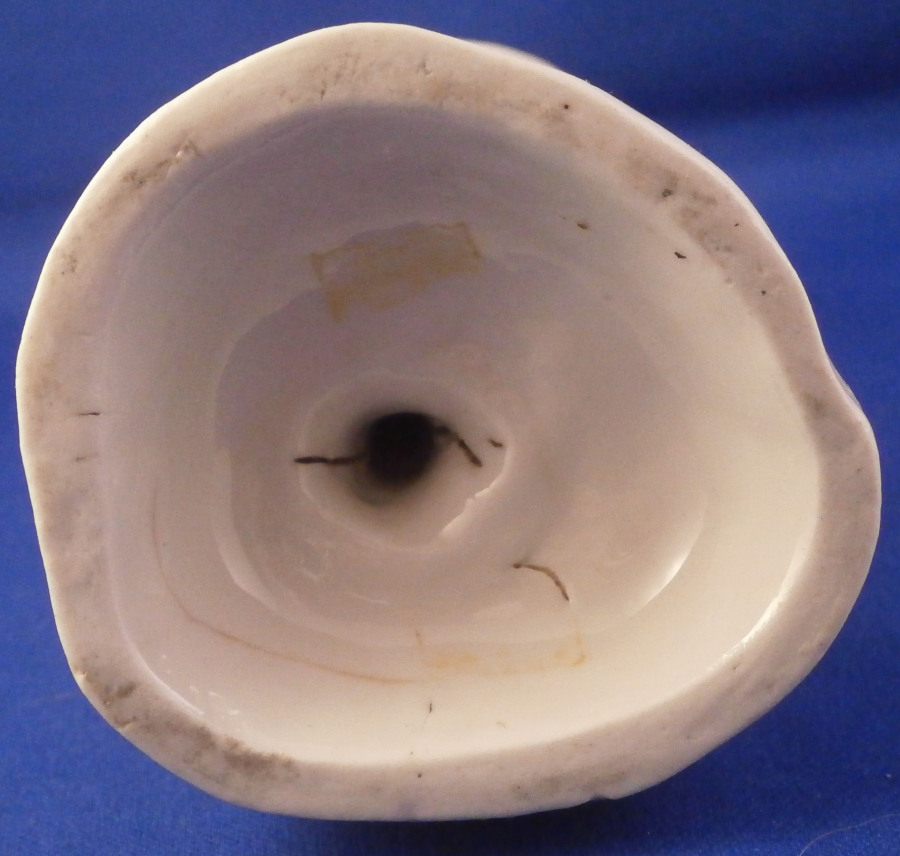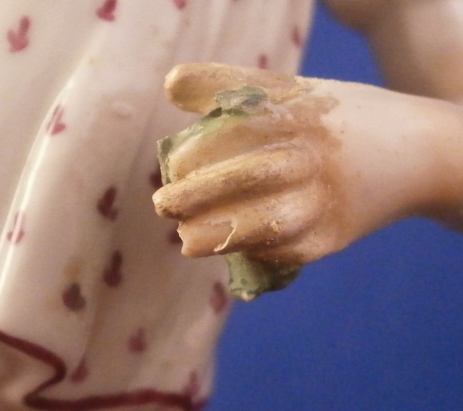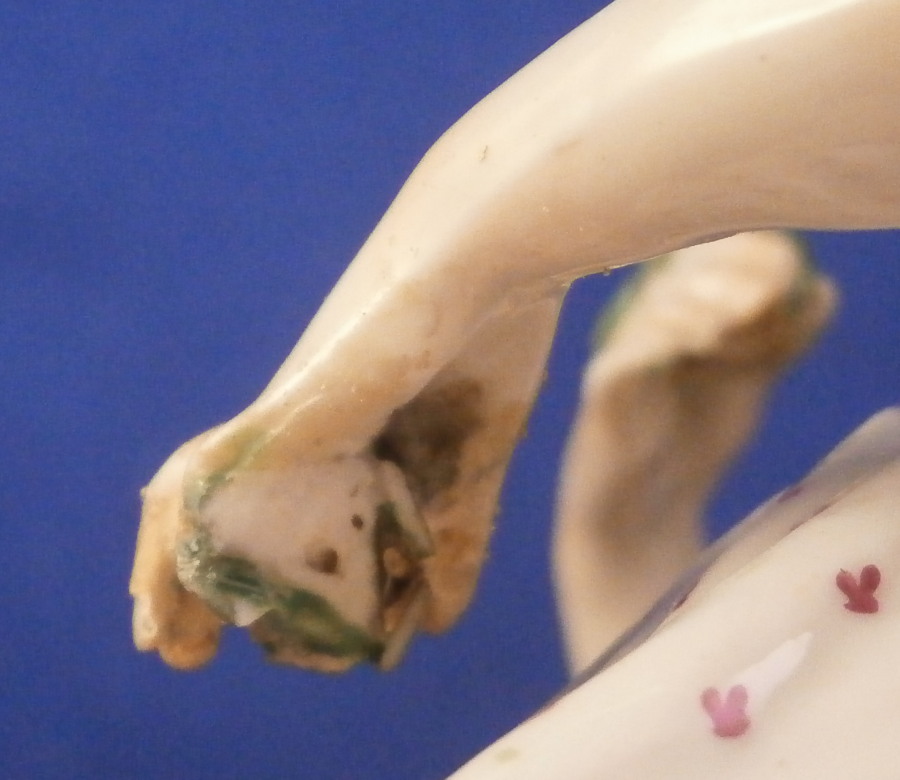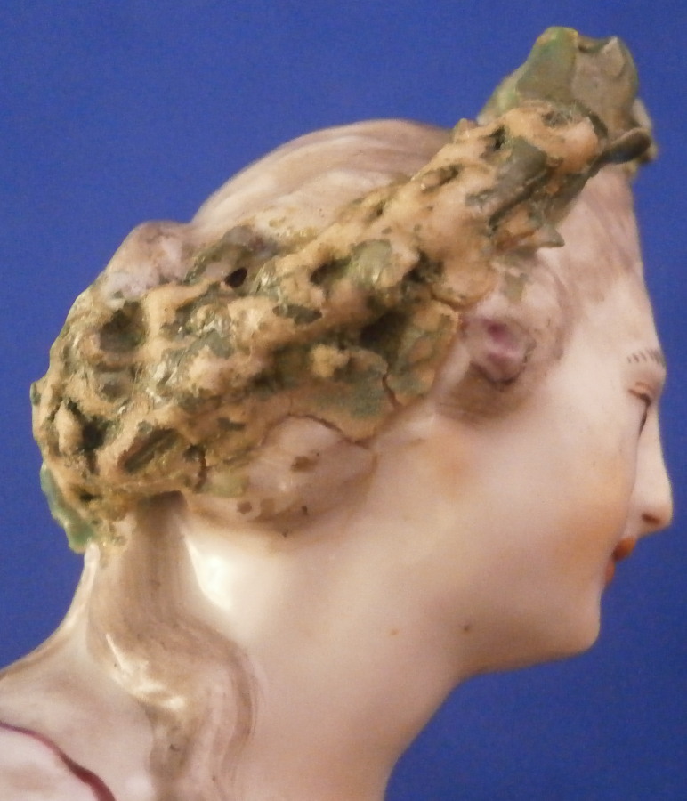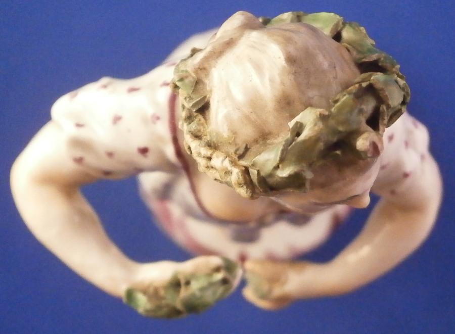 This is a figurine made by Limbach in about 1780. It is of a lady wearing a long skirt with a nice top, has a leaf garland in her hair and pieces of leaf garland in her hands. Typical base with puce scrolls to the front. The figure is unmarked but quite typical for them. There is a very similar one of almost the same lady holding a baby chick. The figurine displays superbly with some issues on the right side of the leaf garland in her hair, damage to the leaves in her hands and her left fingers have been worked on as well. Still a rare piece worthy of owning. The figurine is not marked underneath which is fairly common. She is 7 inches tall and the base is about 2.5 inches in diameter. Please email me for more information or photos.