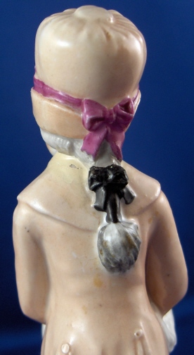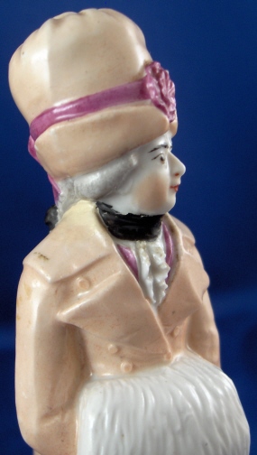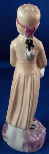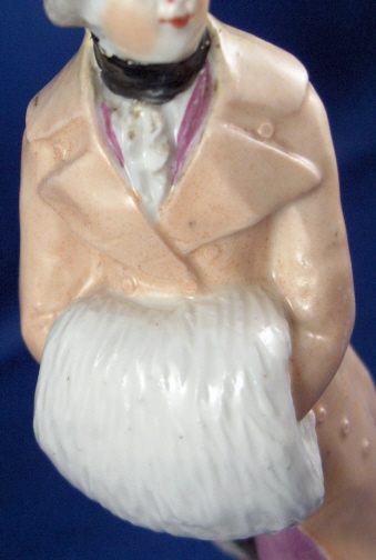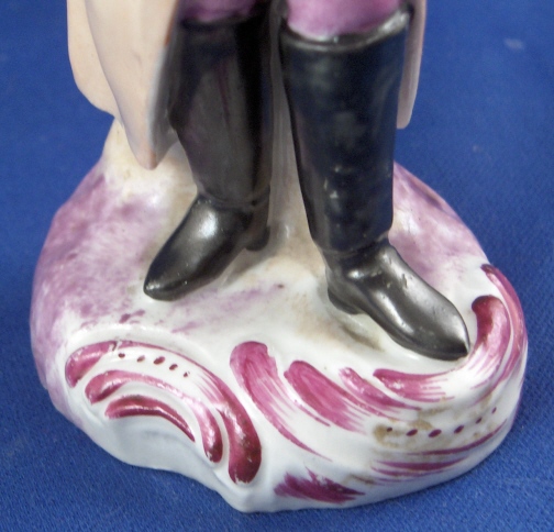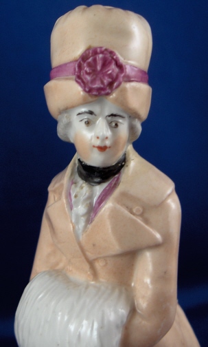 This is a figurine made by Limbach in about 1780. It is of a lady wearing a tall winter hat with both her hands in a muff in front of her. She is wearing a long winter coat and is standing on a nice base with the typical scroll work highlighted in puce. The piece is unmarked but quite typical for them and I found her in one of my books as well. The figurine displays superbly but her head was off at some point and restored with a thin crack in the cover paint on one side showing this now. The figurine is not marked underneath which is fairly common. It is 5.5 inches tall, 1.75 inches wide and 2.125 inches deep. Please email me for more information or photos.
