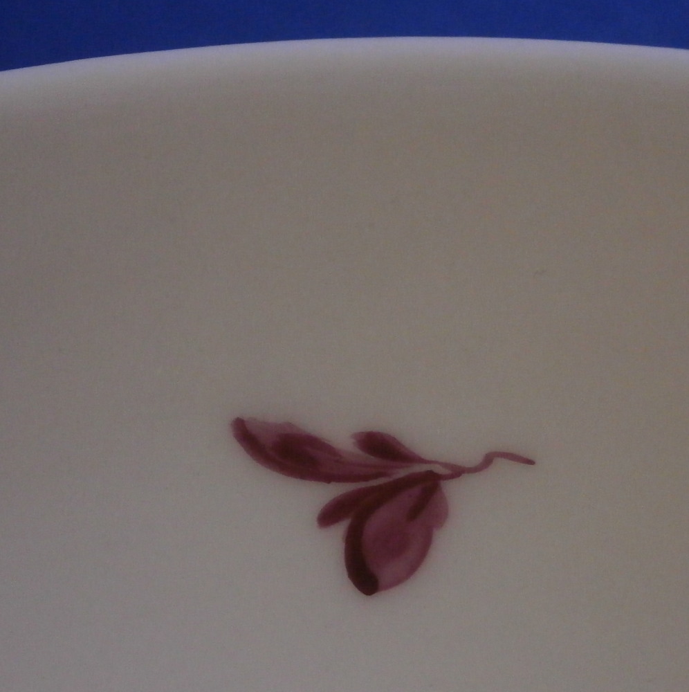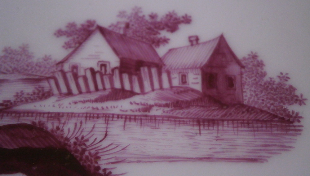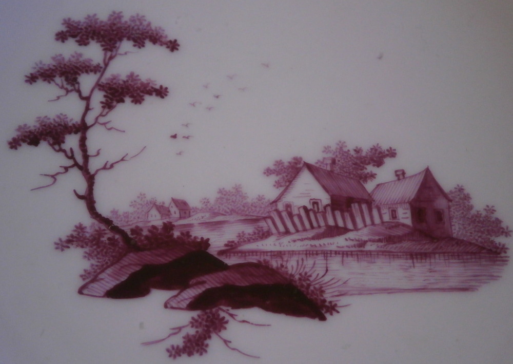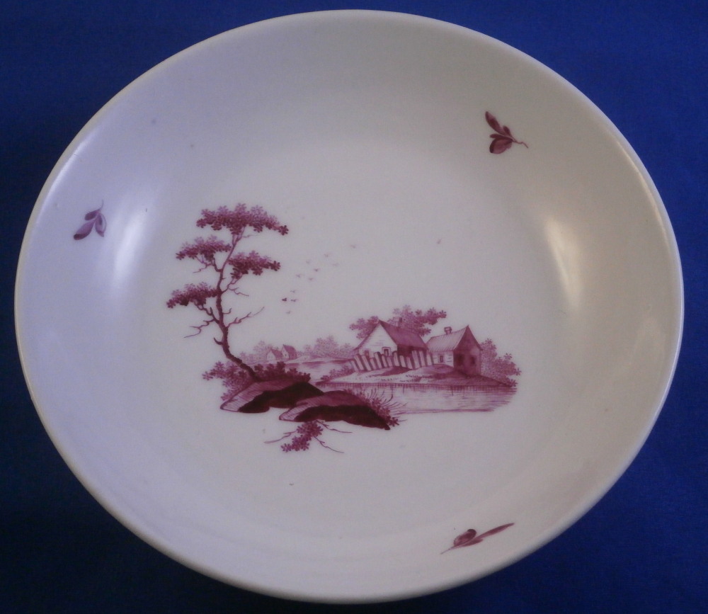 This is a nice cup and saucer set made by Limbach around 1780. Limbach was founded in 1762 and made porcelain until about 1850. Both pieces have a hand painted scene in puce of a couple of buildings in a nice landscape surrounding with three little leaves filling in the rest of the space. Both scenes include the same two larger buildings which is neat. They are both in perfect condition as shown. The saucer is marked underneath with the under glaze blue crossed L mark meant to imitate the Meissen crossed swords mark while the cup is unmarked. The cup is 1.875 inches tall and 3 inches in diameter. The saucer is 1.25 inches tall and 5.25 inches in diameter. A great set by one of the nicer smaller makers! Please e-mail me for more information or photos.