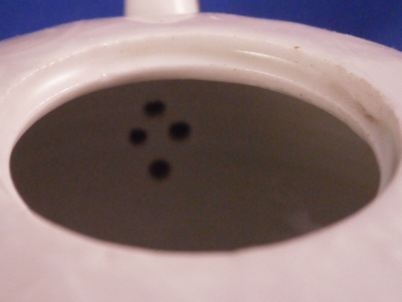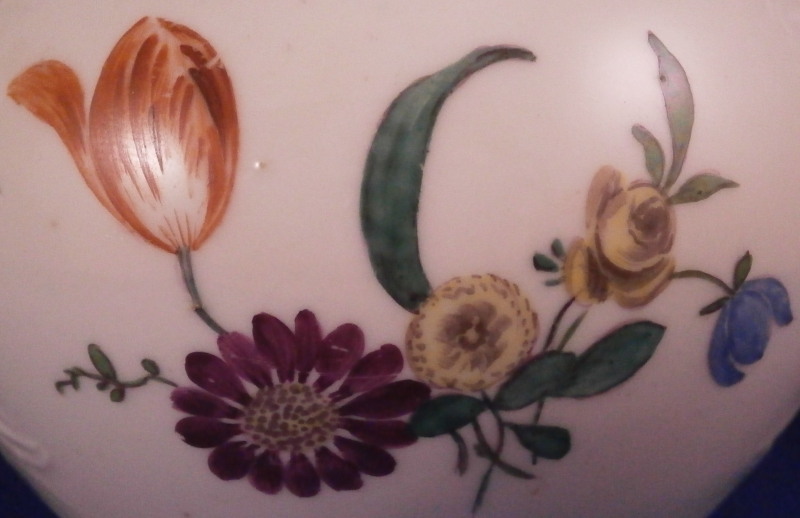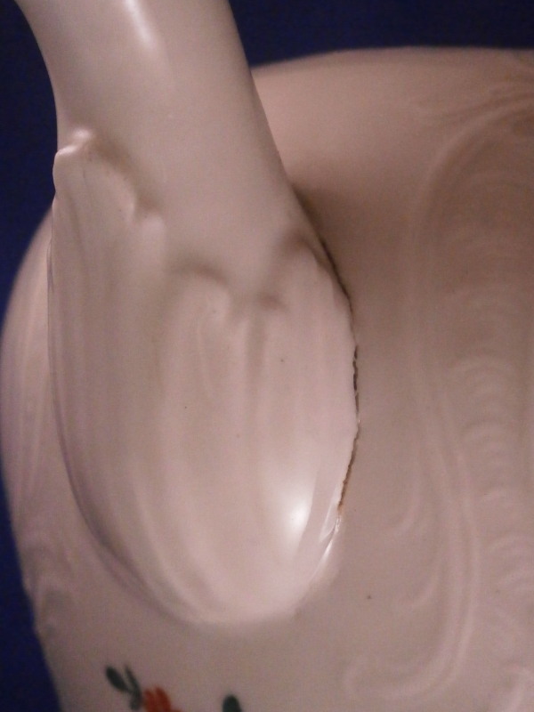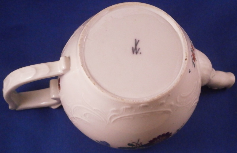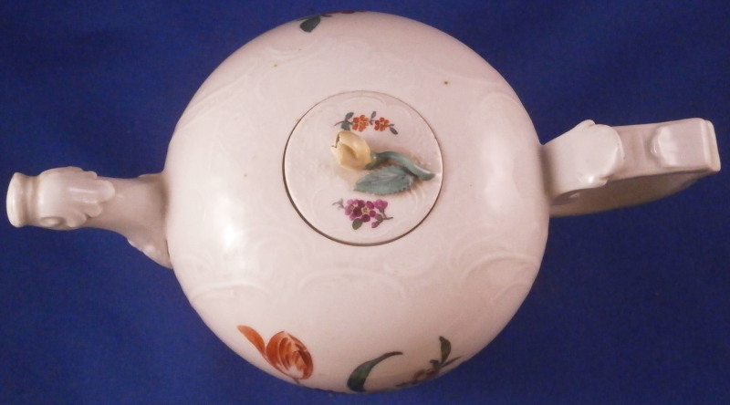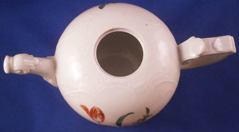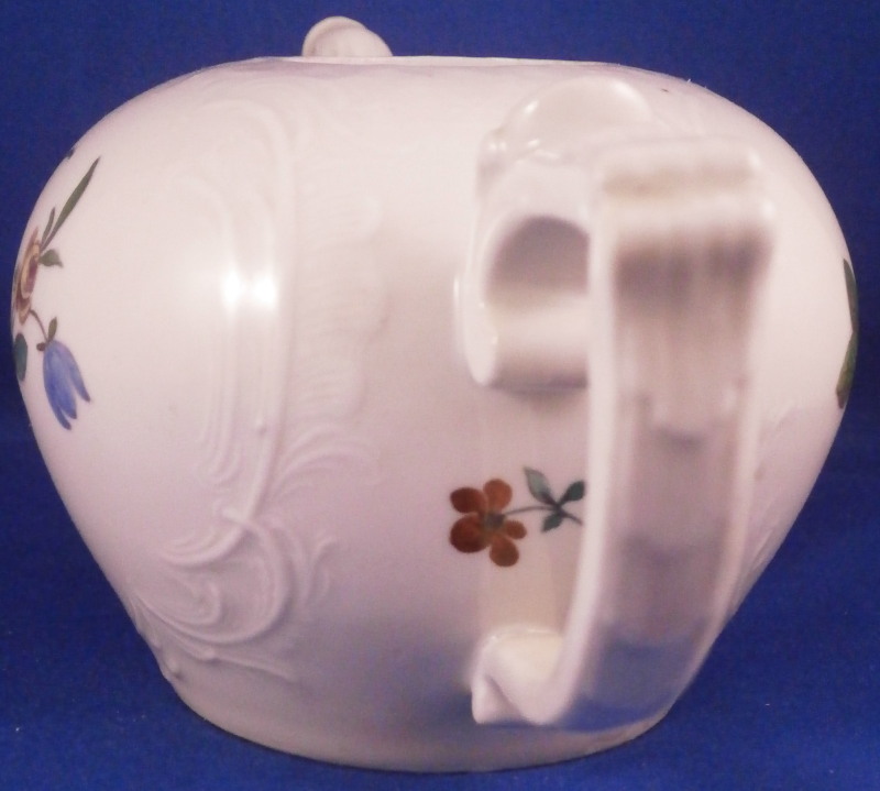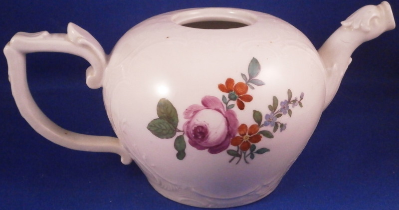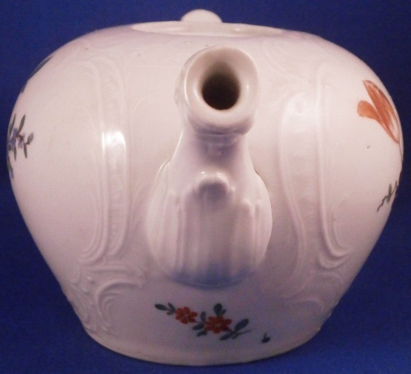This is a really fun tea pot made by Limbach about 1775. The teapot is hand painted with a nice polychrome floral arrangement on both sides, has some nice relief design all around with a matching relief design to the lid and an animal shaped spout. Typical handle shape which gives this maker away fairly easily. The lid has two tiny hand painted flowers to it as well as a nice floral finial. The main pot is marked with an under glaze blue crossed L mark with a dot meants to imitate the Meissen crossed swords mark. The teapot is in great condition with a chip to a petal of the finial, a firing crack to one side where the spout meets the body as shown and some chipping to the inside edge of the foot which must have been done when it was made and does not affect it when on display. All in all about as nice an example as you will be able to find and in great condition. Plus the teapots are much harder to find than their coffee pots. The tea pot is 3.5 inches tall, 7 inches from spout to the handle and about 4 inches in diameter. Please email me for more information or photos.
