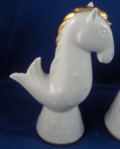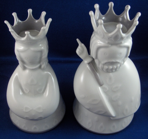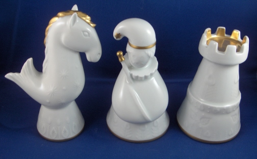 This is a rare complete chess set (32 pieces) made by Haviland Limoges in 1962. It was designed by Jean Jacques Prolongeau and is just superb. What makes this set very rare is that it is the large version meaning it is oversized with the king being 6 inches tall and having a diameter of 3.375 inches. The smaller set is 3 inches tall I believe and a bit more common. Both sides are the same type of figures but one side is highlighted with gilding while the other with a grey color. All have a very cheerful design with lots of relief detail. The entire set is in perfect condition and they are marked underneath with the Haviland Limoges France stamp shown in the pictures as well as Ex.No.63. It was probably originally a limited edition of 100 or less but it could mean something else. The smallest piece is the pawn being 4.375 inches tall and 2.125 inches in diameter. Please email me for more information or other pictures.