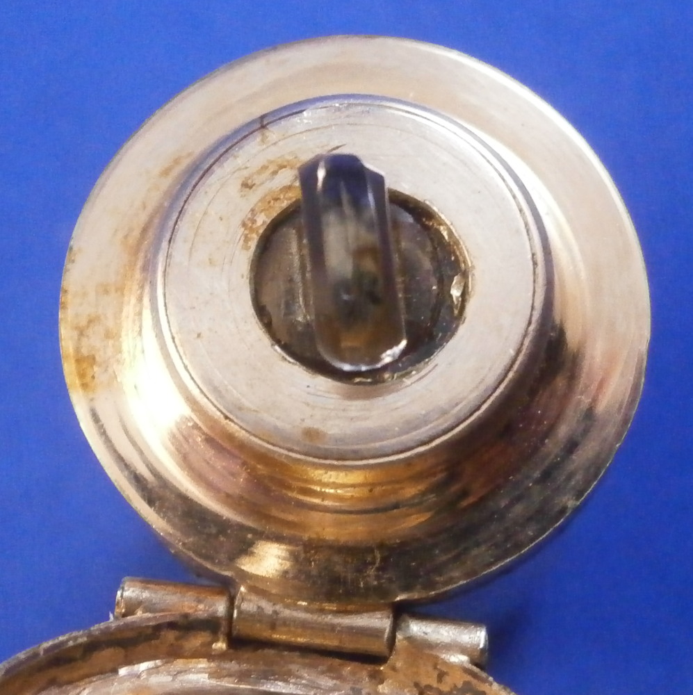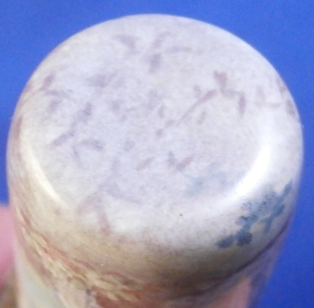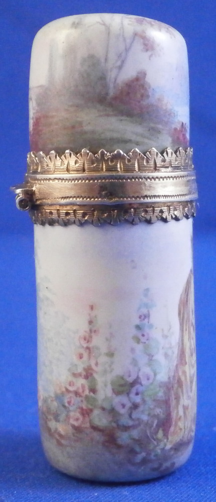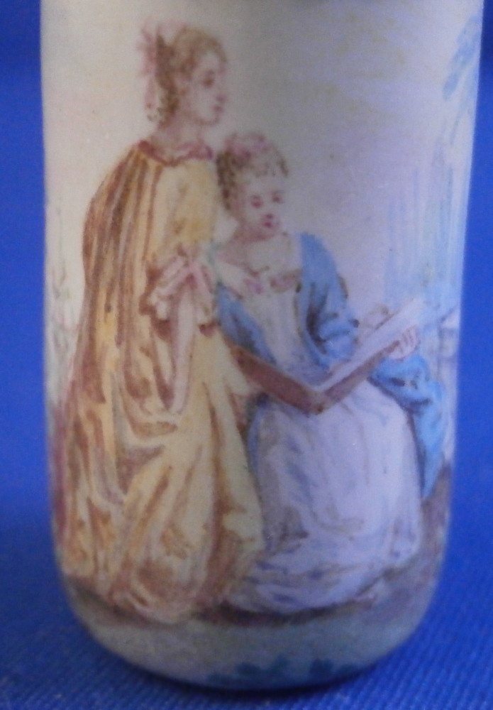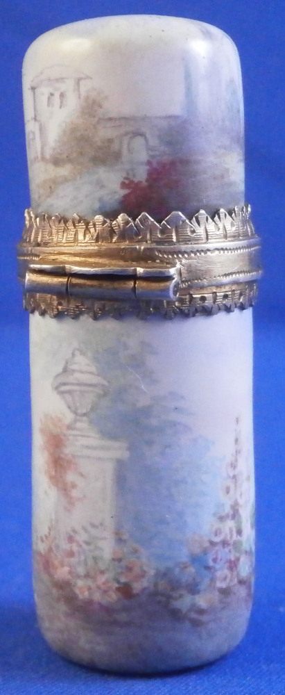 This is a rare small scent / perfume bottle made in the Limoges area of France around the mid 19th century. It is made of enamel on silver and is of stunning quality! The bottom as well as the lid are hand painted with a superb polychrome scenic decoration with a couple in a landscape surrounding on the main body with a column on the other side and a little landscape scene including a building on the lid. The mounts are nicely decorated silver. The piece is quite heavy for its size. An amzing piece of the highest quality! The piece is not marked but the style is typical for this area and period. I thought the tiny indent on the side might be a mark but it does not look like it. The perfume is in great condition with the original glass stopper and the lid closes very tightly. The flask is 2 inches tall with a diameter of 0.75 inches. Please email me for more information or photos.