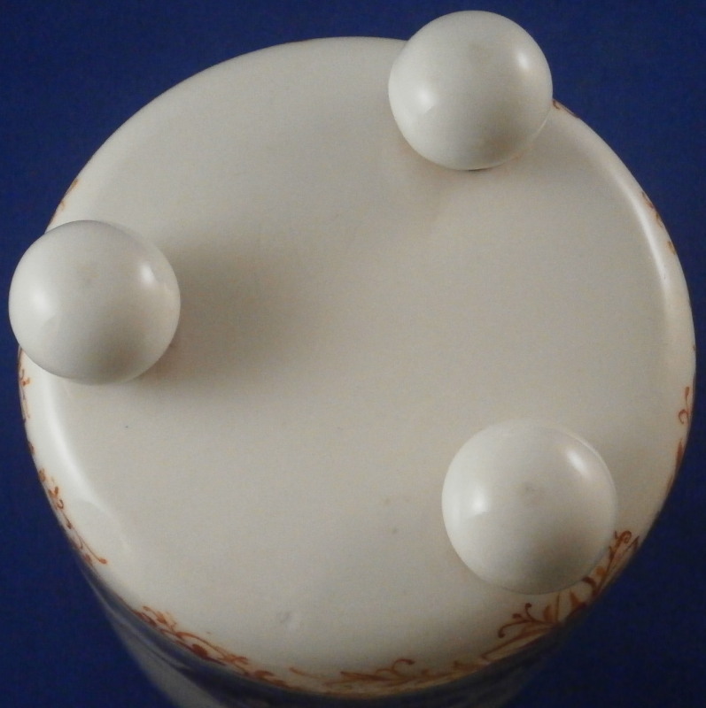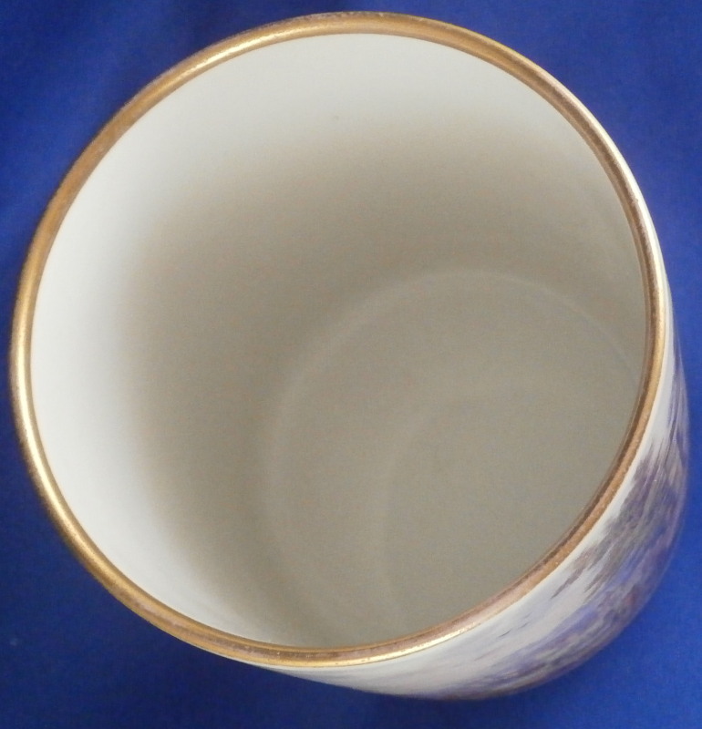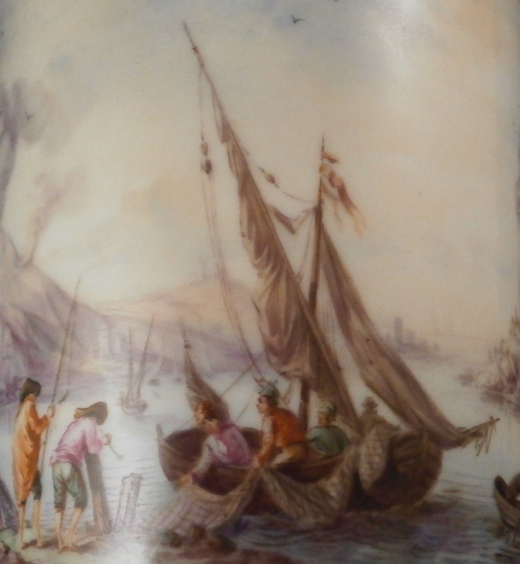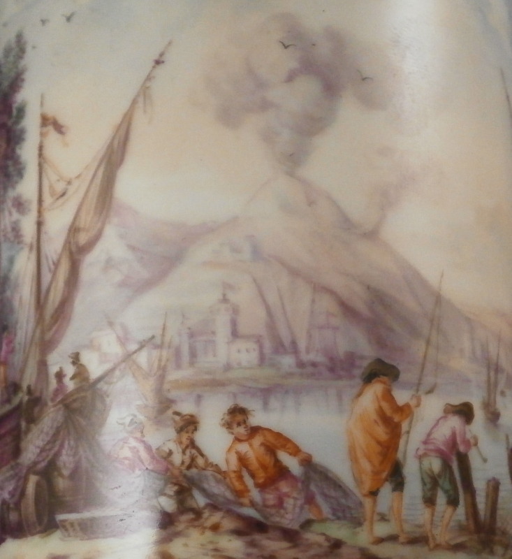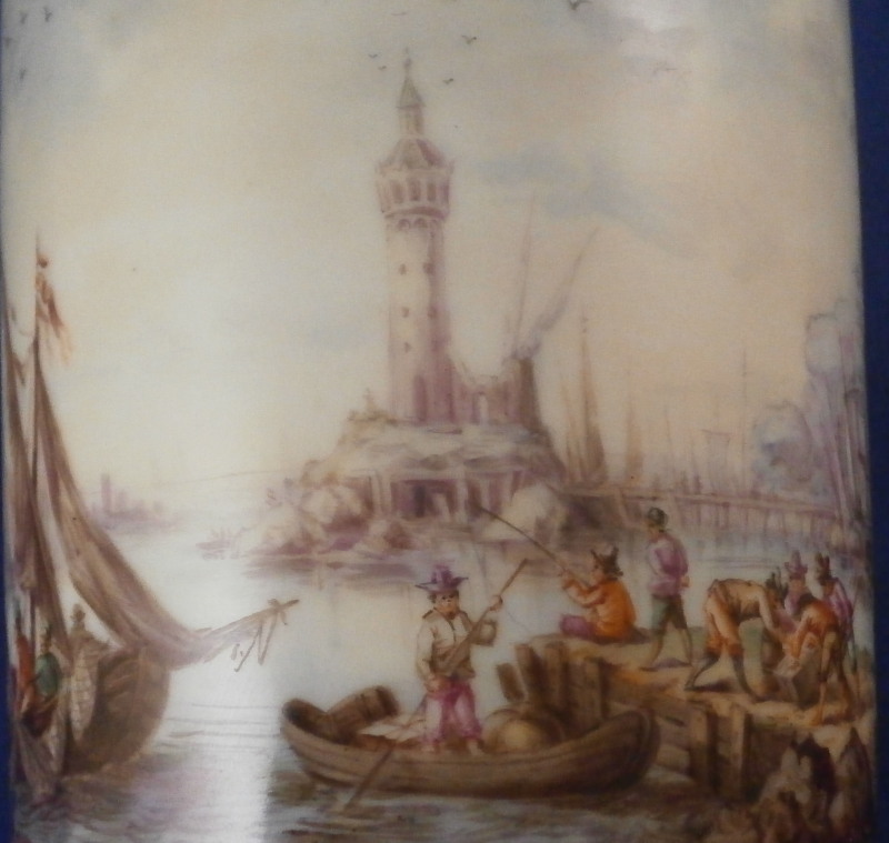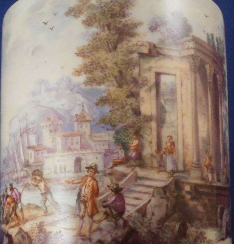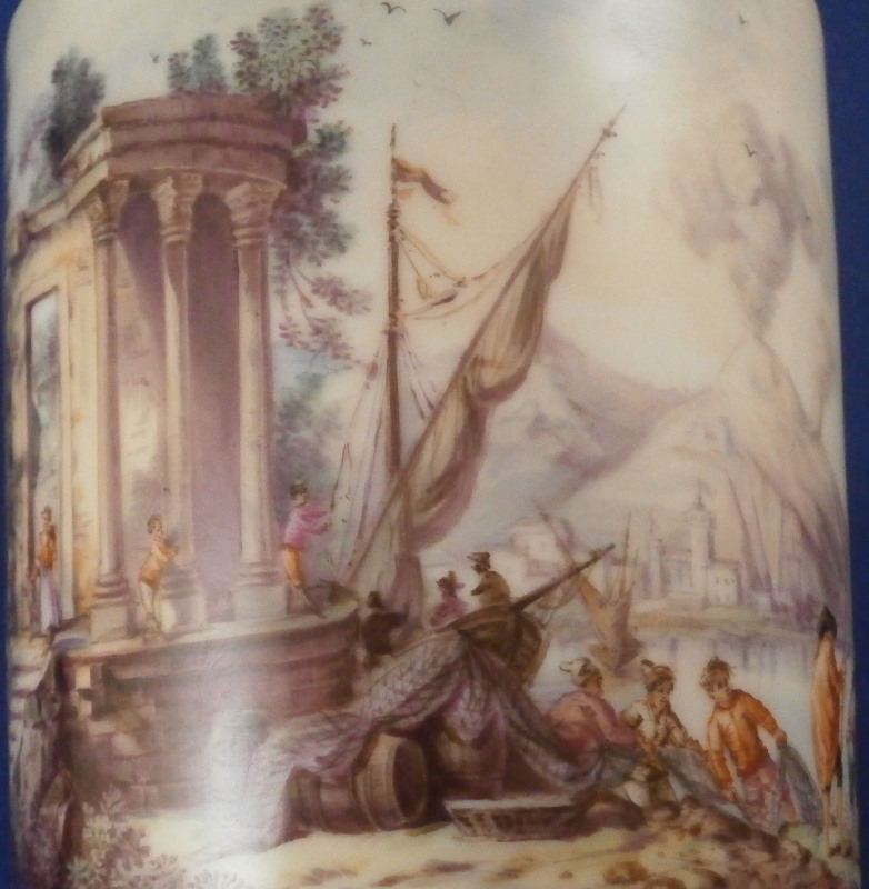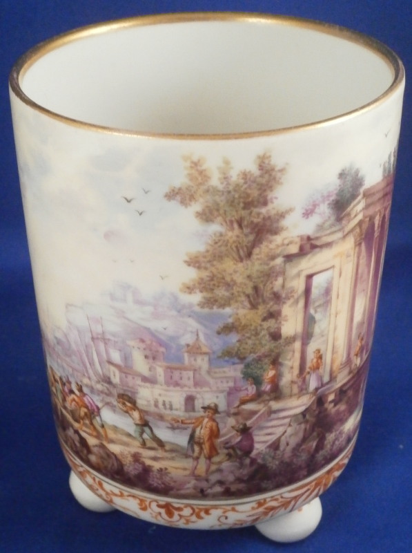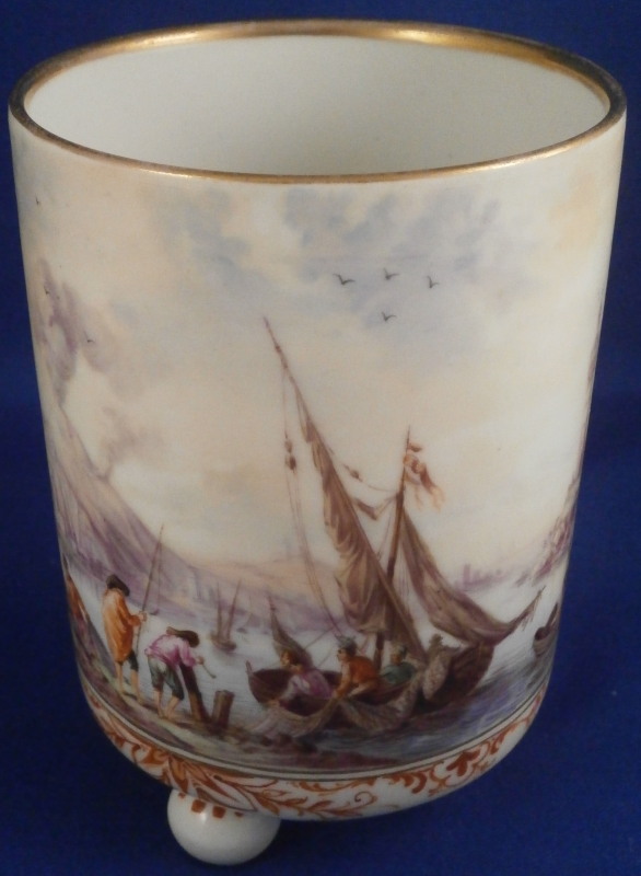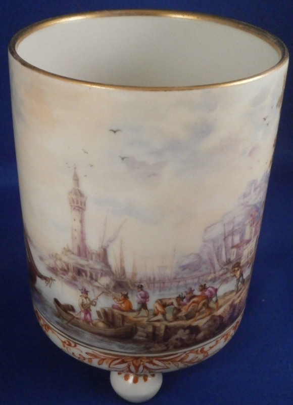This is a great little vase made in France - probably in the Limoges area - in the mid 19th century. It is superbly hand painted with a harbor / merchant scene that goes all around with lots of nice detail - there is a volcano in the background, a ruin with people walking around it as well as an insland with a lighthouse type building on it. Underneath the scene there is a gold trim and under that a nice orange leaf design. Gold trim to the very top and the vase sits on three nice little balls as feet which is a nice touch. One of the nicest quality piece I ahve seen from this area in quite a while. Very much reminiscent of early Doccia (which it was sold for by the seller I bought it from - but very obviously is not). The quality is superb and the vase is in great condition with one foot having been off and reattched perfectly. The piece is only marked with some incised letters that are very hard to see. The vase is 4.5 inches tall and 3.125 inches in diameter. Please email me for more information or other pictures.