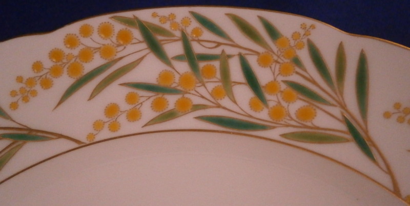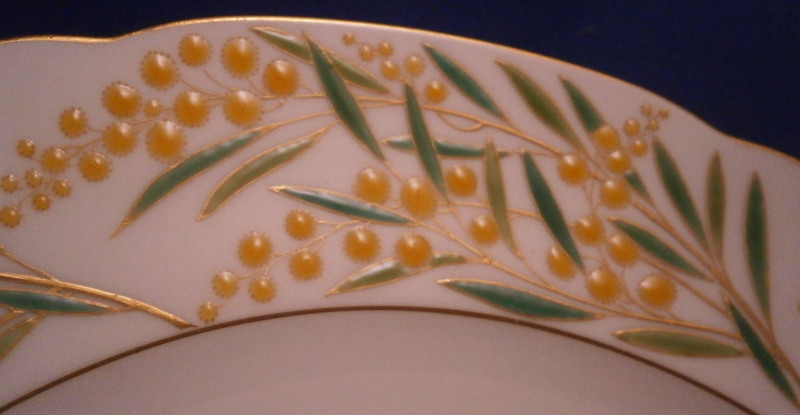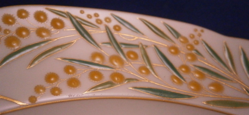 This is a superb plate made by Camille Naudot around 1900. The son of a porcelain merchant, Camille Naudot trained at the Ecole de Sèvres and succeeded his father in about 1889. In order to carry on his research into soft-paste porcelain, he set up a business at Le Raincy in 1893 and a store at 10 rue Auber, Paris. He did some amazing work on Chinese rice grain techniques, copies of 18th century pieces as well as jewelled pieces of which this plate here is a great example! Not something one comes across often at all! The plate is decorated with a gold plant design with the flowers and leaves both being painted in enamel colors that are very raised and translucent kind of like the Seger jewels or the decoration on gold foil on Sevres cup of the 18th century, This gives it a stunning look that is almost 3D in nature. The plate has a very Art Nouveau period feel to it and looks superb. The plate is in great condition with just some use marks to the white center area. It displays perfectly! The piece is marked with an incised mark near a hole in the foot for hanging during the firing that looks to be CN 999. Also an incised Sevres interlaced double L mark with the letters A and B into the glaze and an area where a gilt mark was scratches away as shown. I am certain it is from the Limoges area and one of the better makers as the quality is superb! The plate is 1.125 inches tall and just under 9.5 inches in diameter. Please email me for more information or other pictures.