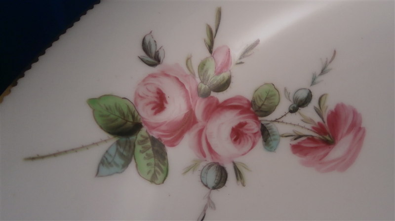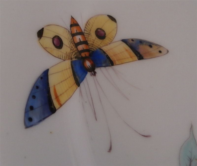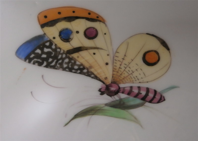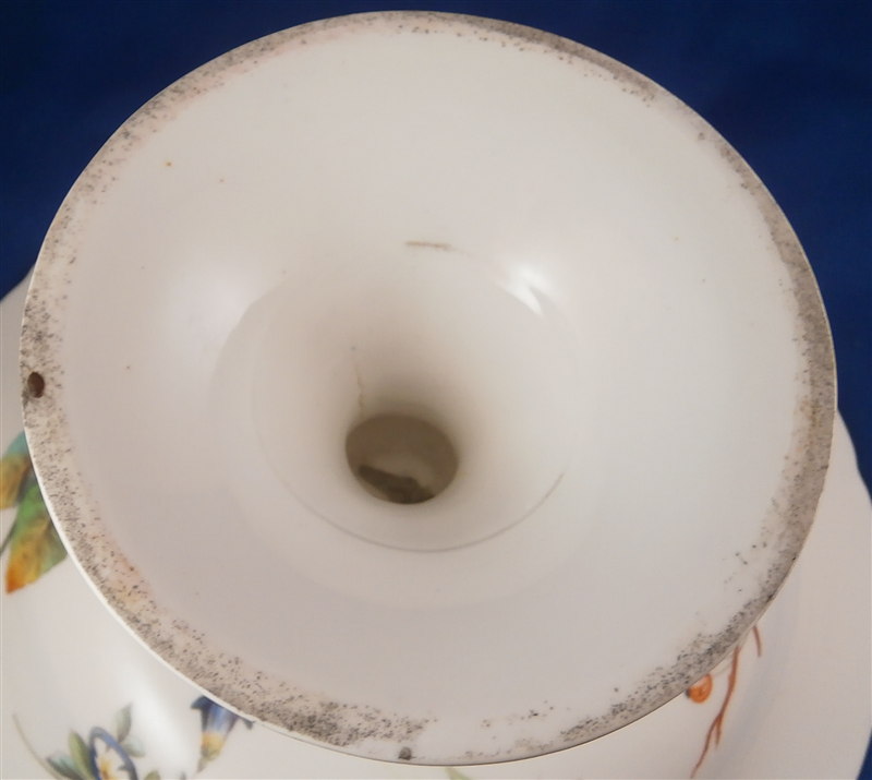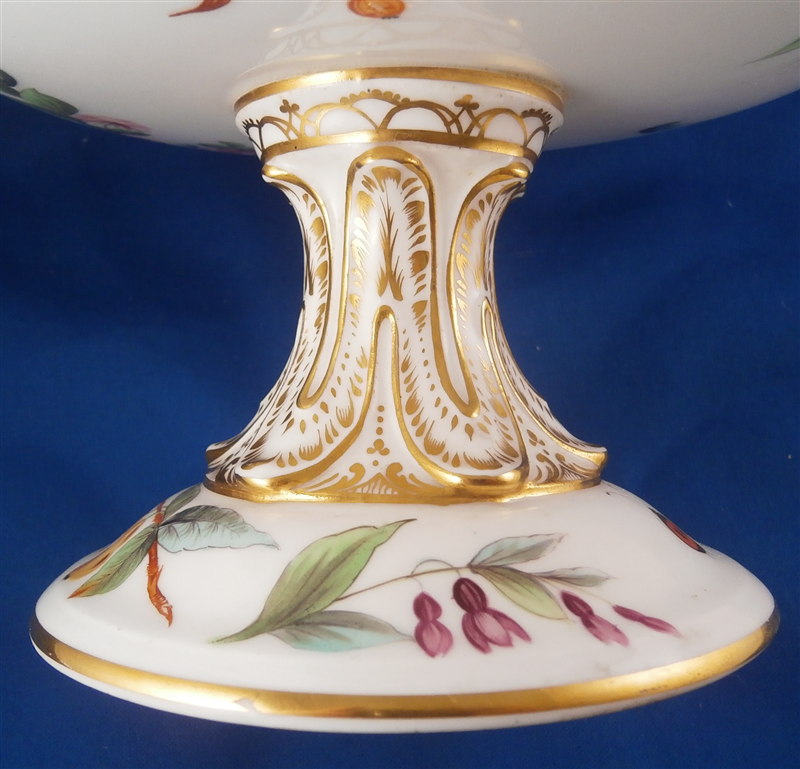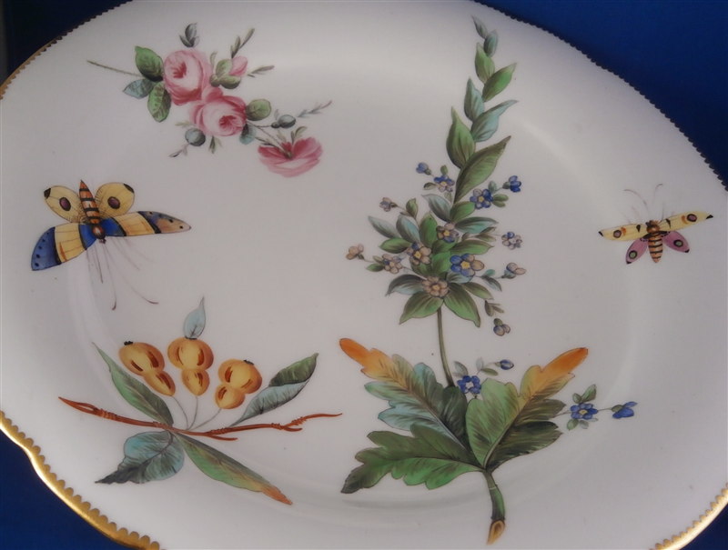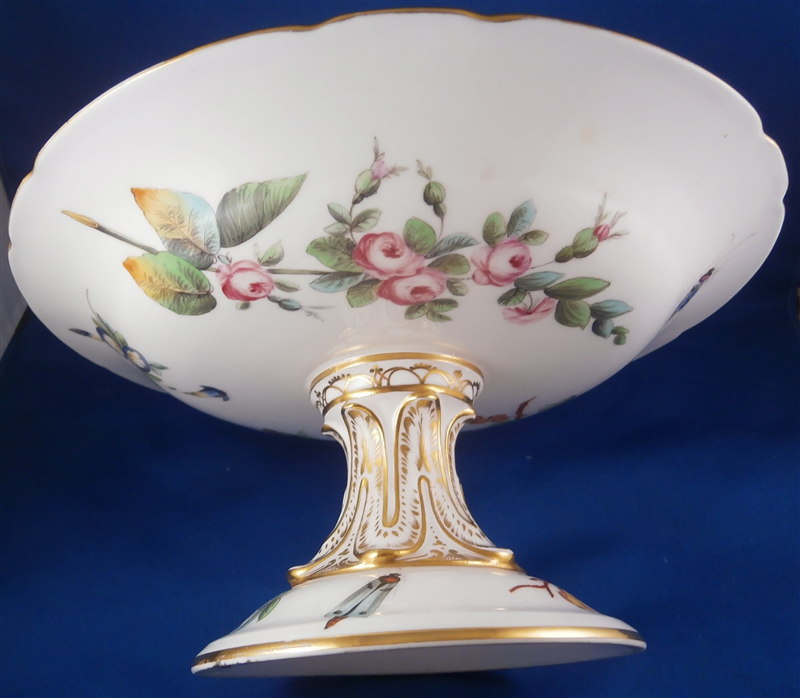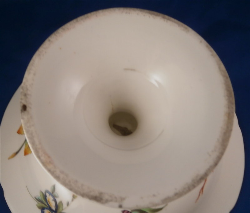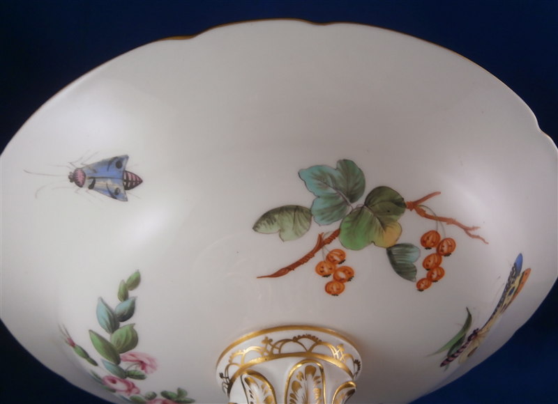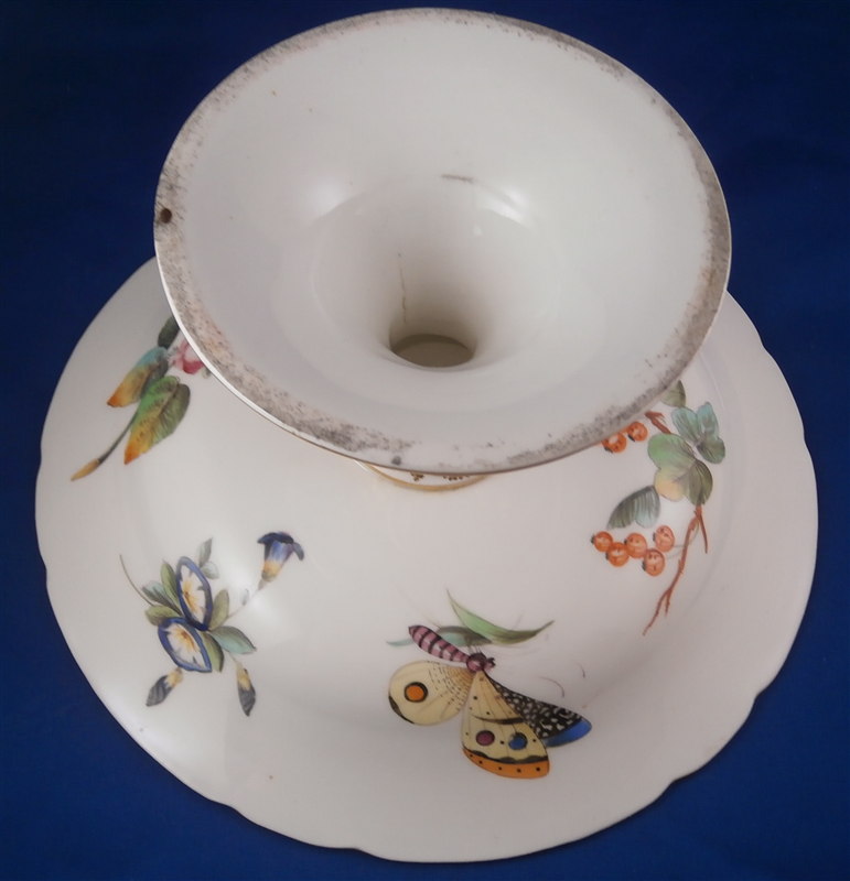This is a really nice compote or cake / cookie stand made by one of the Limoges area makers I think but could be an English maker like Spode as well. Not sure at all. Made in the early to mid 19th century. What I am sure about is that is is one top quality piece and really fun to look at. It is handpainted with lots of flowers, leaves, berries and butterflies and even a lady bug with a nice gold trim to the edges and to the foot which also has a nice design to the paste itself. The painting is of the best quality and the colors quite nice! The piece is in perfect condition with pretty much no wear at all. Sadly this piece has no mark on the underside to determine the exact maker but it is a good quality piece for sure. I always wonder why they don't mark their pieces to show off a bit. The dish is 4.625 inches tall, the top plate has a diameter of 9.25 inches and the bottom foot has a diameter of 4.75 inches. Please email me for more information or other pictures.