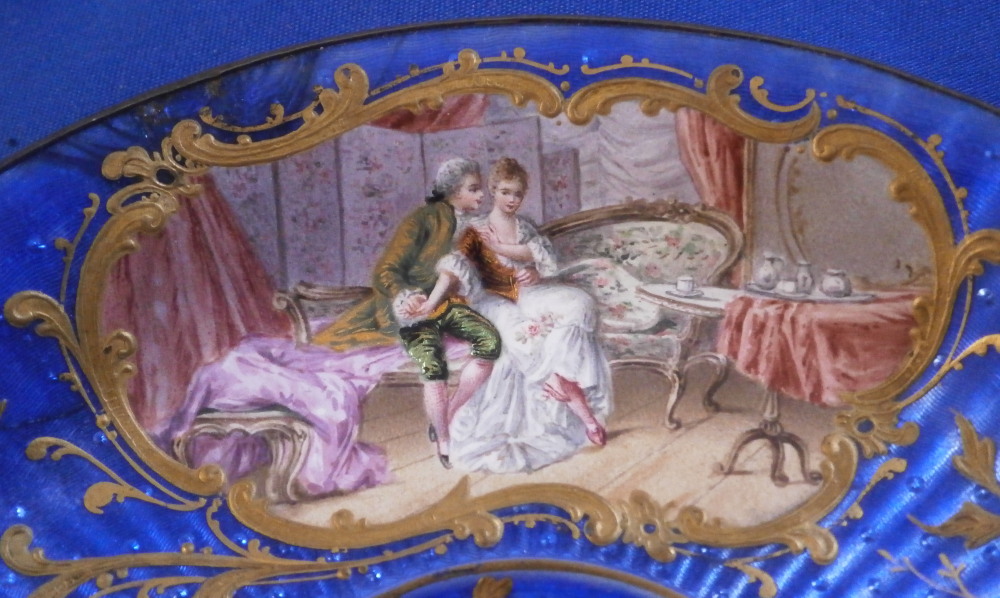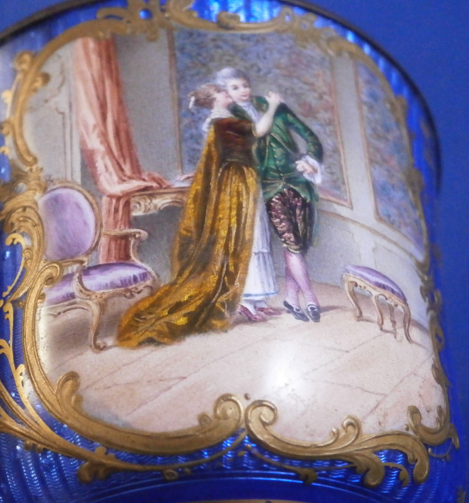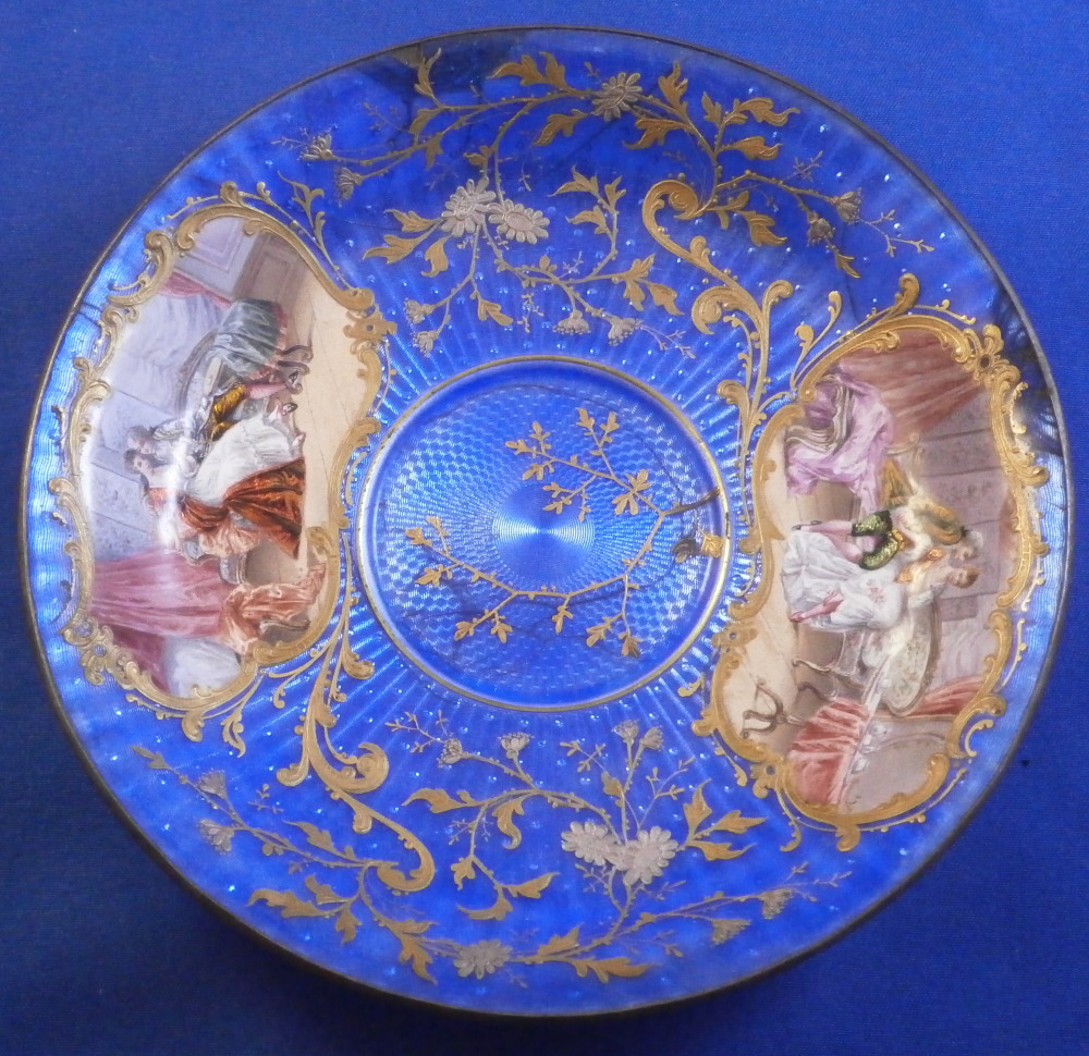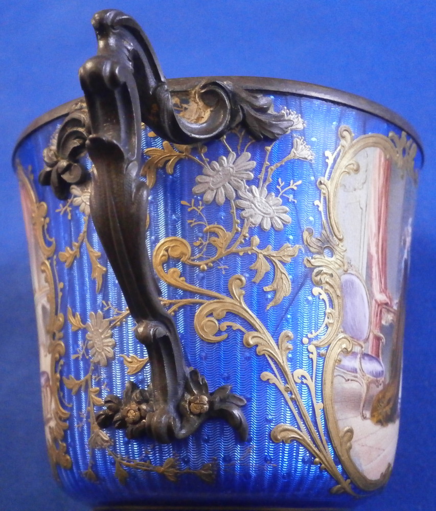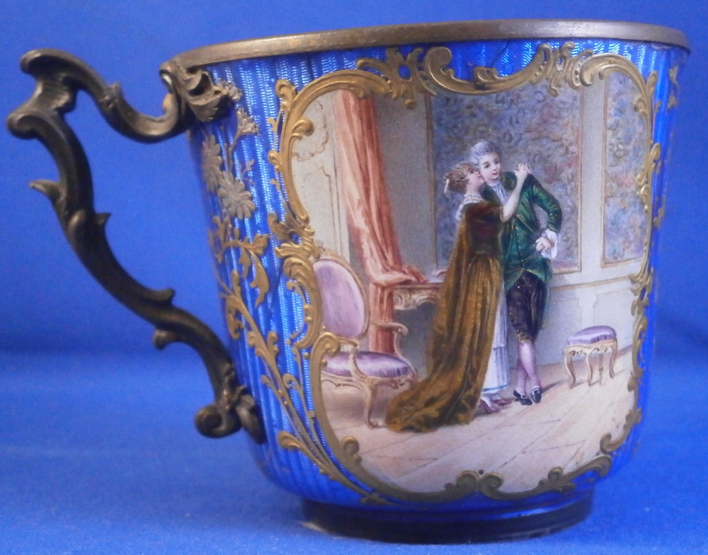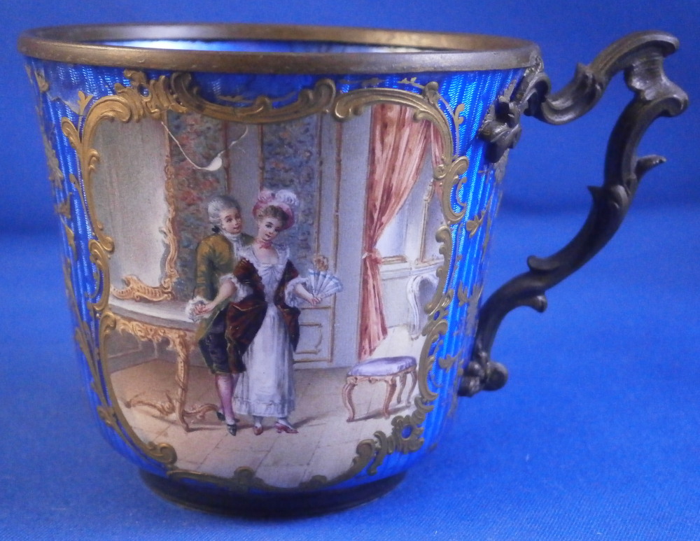 This is an absolutely incredible cup and saucer set made in France in the 19th century - likely in the Limoges area. One finds little trinkets in this sort of enamel like compacts, pill boxes, scent bottles, pendants but I have never seen nor could I now find anything like this set! It's spectacular to say the least! Hard to describe the detail so have a look at the photos. It is a cup & saucer set that has a translucent guilloche enamel in blue on silver, some nice silver and platinum flower design on top of that and each piece has two regular enamel scenes of the best quality. Each scene includes a couple in a room with a ton of details. The enamel is mostly the typical Limoges enamel except for some part of the clothes have that amazing shiny foil enamel as a highlight as shown. Look at the quality of those scenes! Does not come any better!! The handle on the cup is stunning as well. It must have been the best of the best when it was made. Now for the not so good news - there is the obvious damage to the guilloche enamel but I am hoping a restorer I found can fix that. Not an easy task but well worth it! The main damage is to two spots on top of the saucer by the edge and some in the center of the piece. That will be the hardest. The underside of the saucer is simpler due to no decoration on top of that. The inside of the cup is the same. The outside of the cup has one area over one of the scenes and a crack to one of the scenes that are the worst of it. Otherwise it is in great shape. Imagine this piece when it was new? I love porcelain but this set is way beyond even that. I think the silver handle and rim used to be gold washed as well but I am not sure. Small spots seem to indicate that but it is almost all gone. Oddly enough neither piece is marked at all. No silver hallmarks, nothing. That seems strange with this sort of quality and age. The cup is just over 2.375 inches tall with a top diameter of 2.75 inches. The saucer is 0.875 inches tall with a diameter of 5 inches. Please email me for more information or photos.
