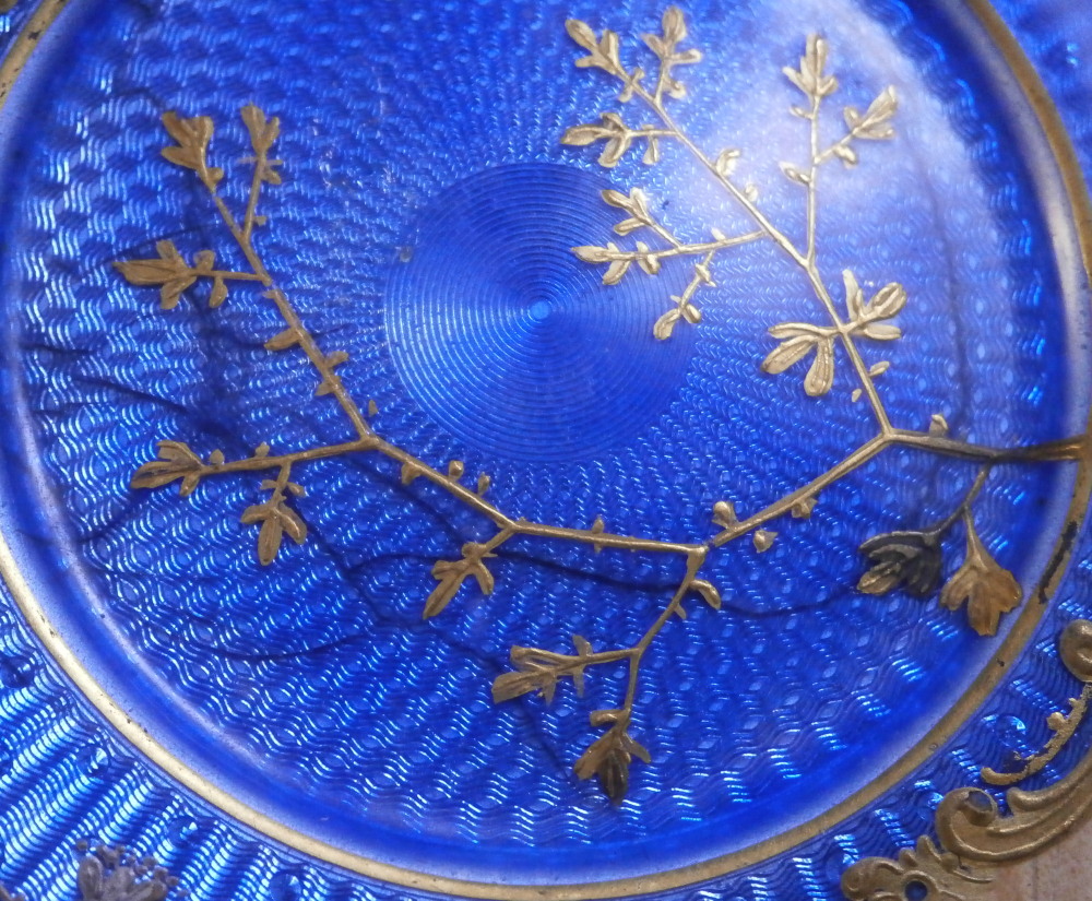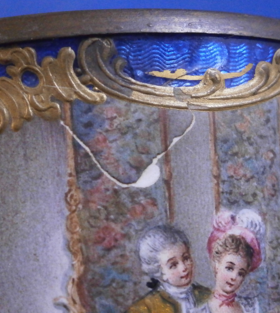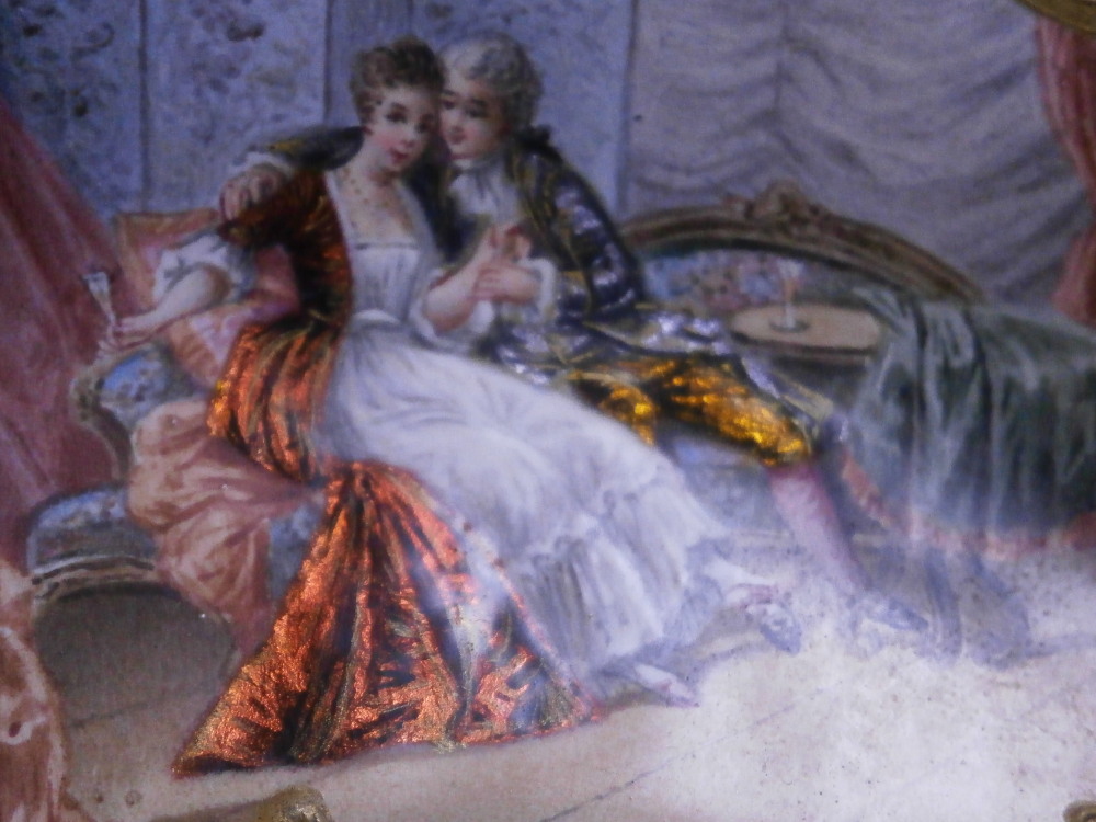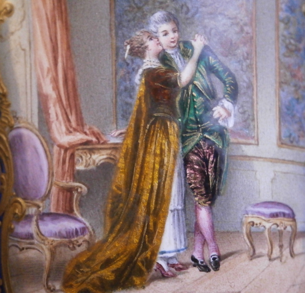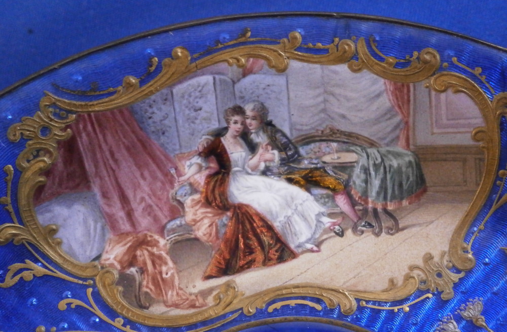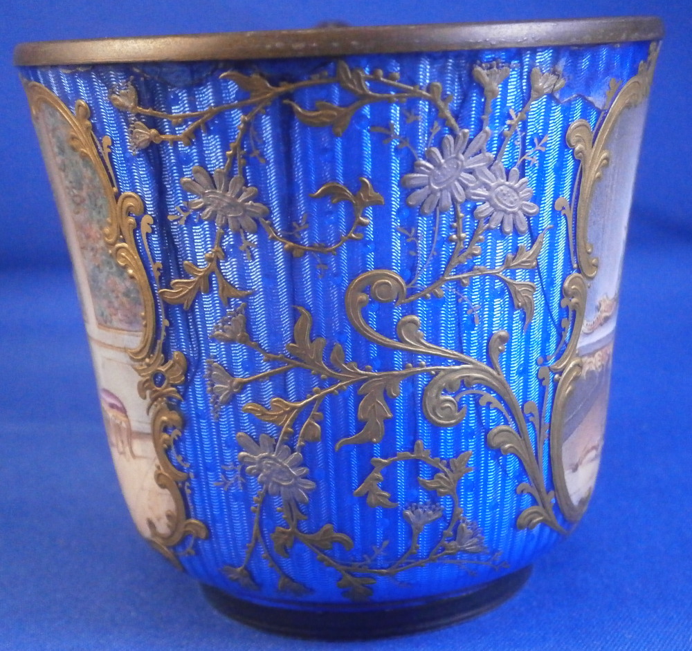This is an absolutely incredible cup and saucer set made in France in the 19th century - likely in the Limoges area. One finds little trinkets in this sort of enamel like compacts, pill boxes, scent bottles, pendants but I have never seen nor could I now find anything like this set! It's spectacular to say the least! Hard to describe the detail so have a look at the photos. It is a cup & saucer set that has a translucent guilloche enamel in blue on silver, some nice silver and platinum flower design on top of that and each piece has two regular enamel scenes of the best quality. Each scene includes a couple in a room with a ton of details. The enamel is mostly the typical Limoges enamel except for some part of the clothes have that amazing shiny foil enamel as a highlight as shown. Look at the quality of those scenes! Does not come any better!! The handle on the cup is stunning as well. It must have been the best of the best when it was made. Now for the not so good news - there is the obvious damage to the guilloche enamel but I am hoping a restorer I found can fix that. Not an easy task but well worth it! The main damage is to two spots on top of the saucer by the edge and some in the center of the piece. That will be the hardest. The underside of the saucer is simpler due to no decoration on top of that. The inside of the cup is the same. The outside of the cup has one area over one of the scenes and a crack to one of the scenes that are the worst of it. Otherwise it is in great shape. Imagine this piece when it was new? I love porcelain but this set is way beyond even that. I think the silver handle and rim used to be gold washed as well but I am not sure. Small spots seem to indicate that but it is almost all gone. Oddly enough neither piece is marked at all. No silver hallmarks, nothing. That seems strange with this sort of quality and age. The cup is just over 2.375 inches tall with a top diameter of 2.75 inches. The saucer is 0.875 inches tall with a diameter of 5 inches. Please email me for more information or photos.