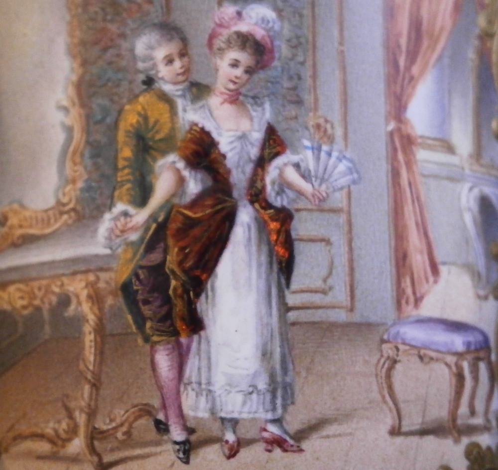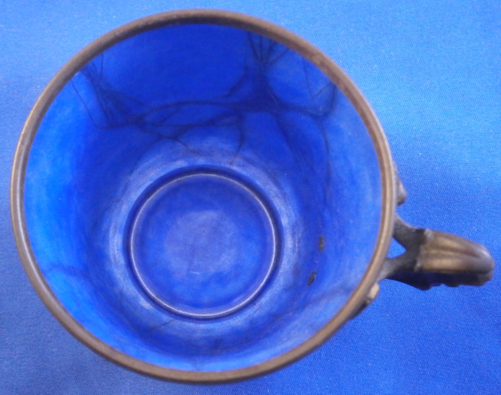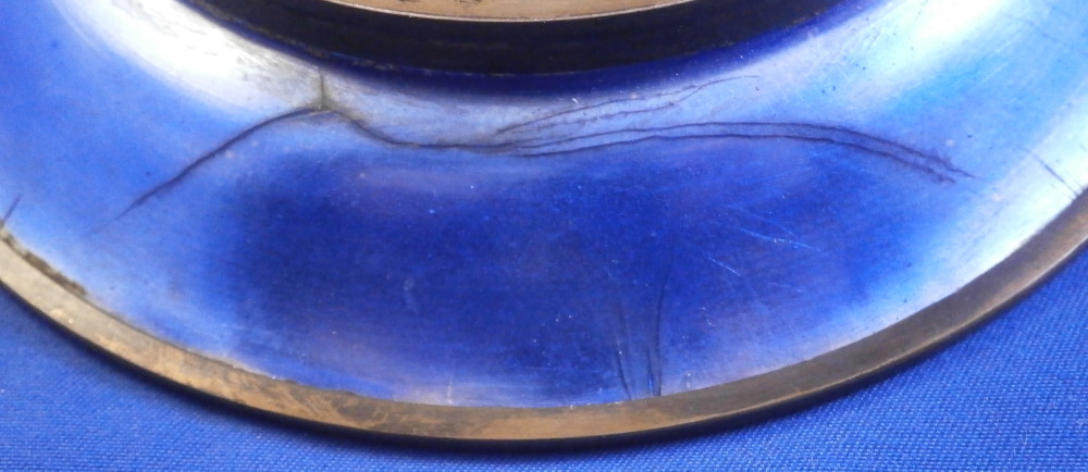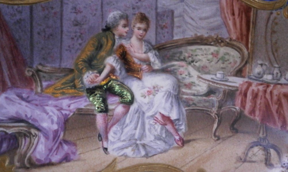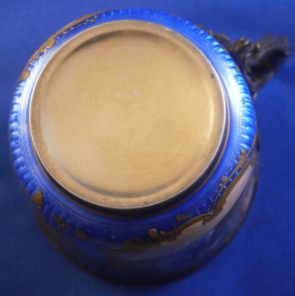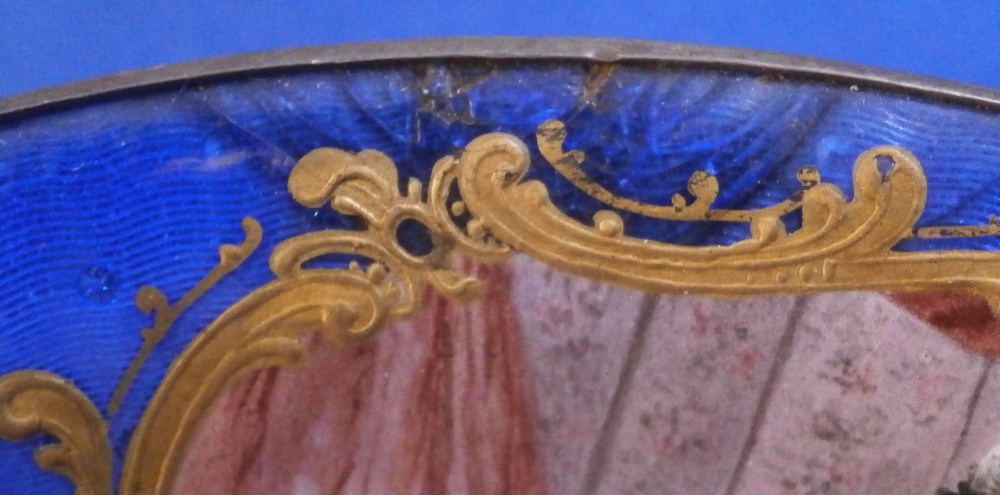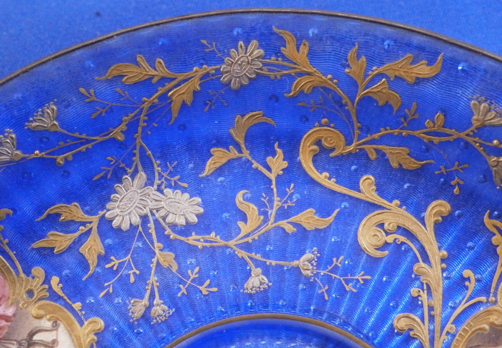 This is an absolutely incredible cup and saucer set made in France in the 19th century - likely in the Limoges area. One finds little trinkets in this sort of enamel like compacts, pill boxes, scent bottles, pendants but I have never seen nor could I now find anything like this set! It's spectacular to say the least! Hard to describe the detail so have a look at the photos. It is a cup & saucer set that has a translucent guilloche enamel in blue on silver, some nice silver and platinum flower design on top of that and each piece has two regular enamel scenes of the best quality. Each scene includes a couple in a room with a ton of details. The enamel is mostly the typical Limoges enamel except for some part of the clothes have that amazing shiny foil enamel as a highlight as shown. Look at the quality of those scenes! Does not come any better!! The handle on the cup is stunning as well. It must have been the best of the best when it was made. Now for the not so good news - there is the obvious damage to the guilloche enamel but I am hoping a restorer I found can fix that. Not an easy task but well worth it! The main damage is to two spots on top of the saucer by the edge and some in the center of the piece. That will be the hardest. The underside of the saucer is simpler due to no decoration on top of that. The inside of the cup is the same. The outside of the cup has one area over one of the scenes and a crack to one of the scenes that are the worst of it. Otherwise it is in great shape. Imagine this piece when it was new? I love porcelain but this set is way beyond even that. I think the silver handle and rim used to be gold washed as well but I am not sure. Small spots seem to indicate that but it is almost all gone. Oddly enough neither piece is marked at all. No silver hallmarks, nothing. That seems strange with this sort of quality and age. The cup is just over 2.375 inches tall with a top diameter of 2.75 inches. The saucer is 0.875 inches tall with a diameter of 5 inches. Please email me for more information or photos.