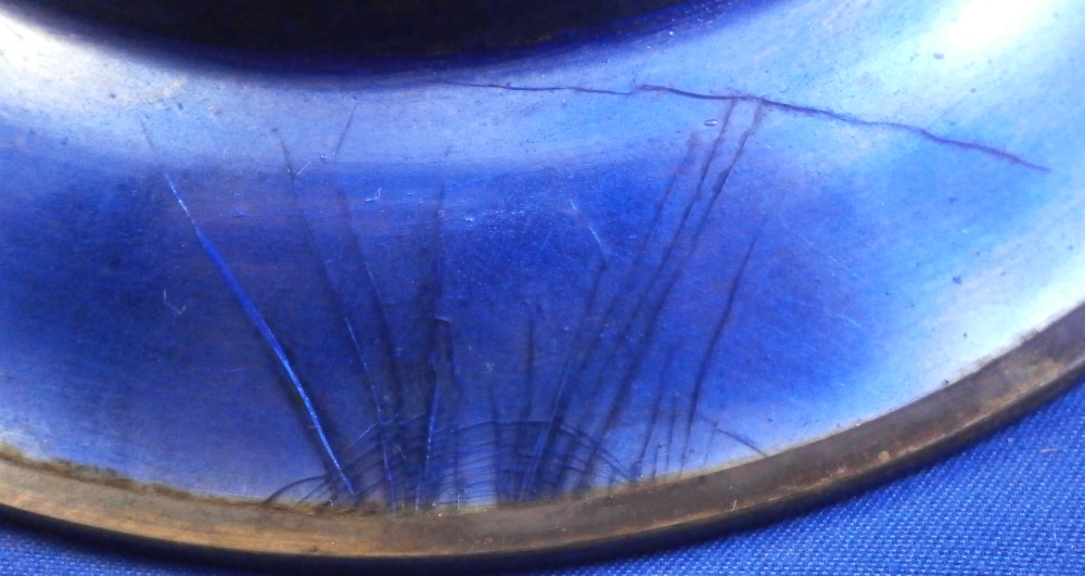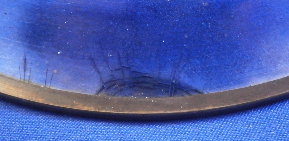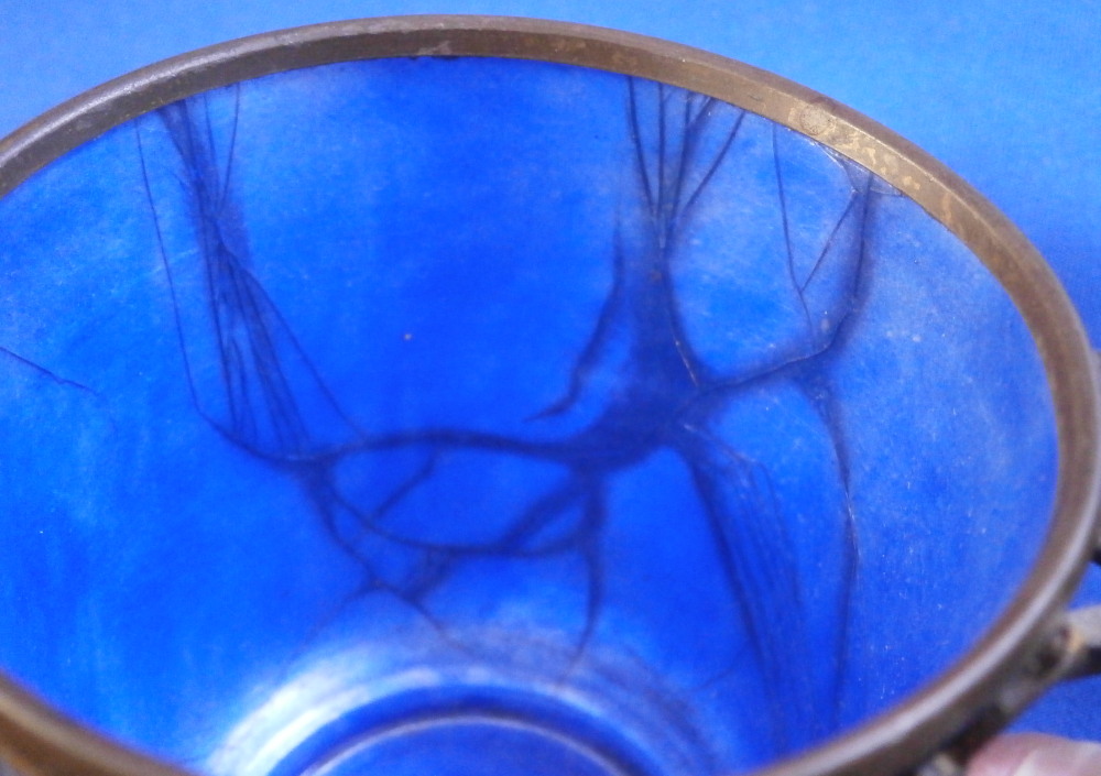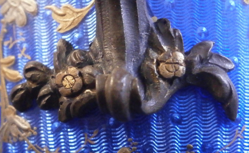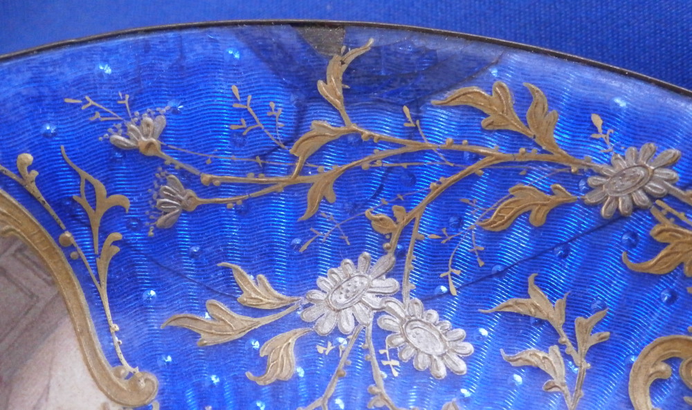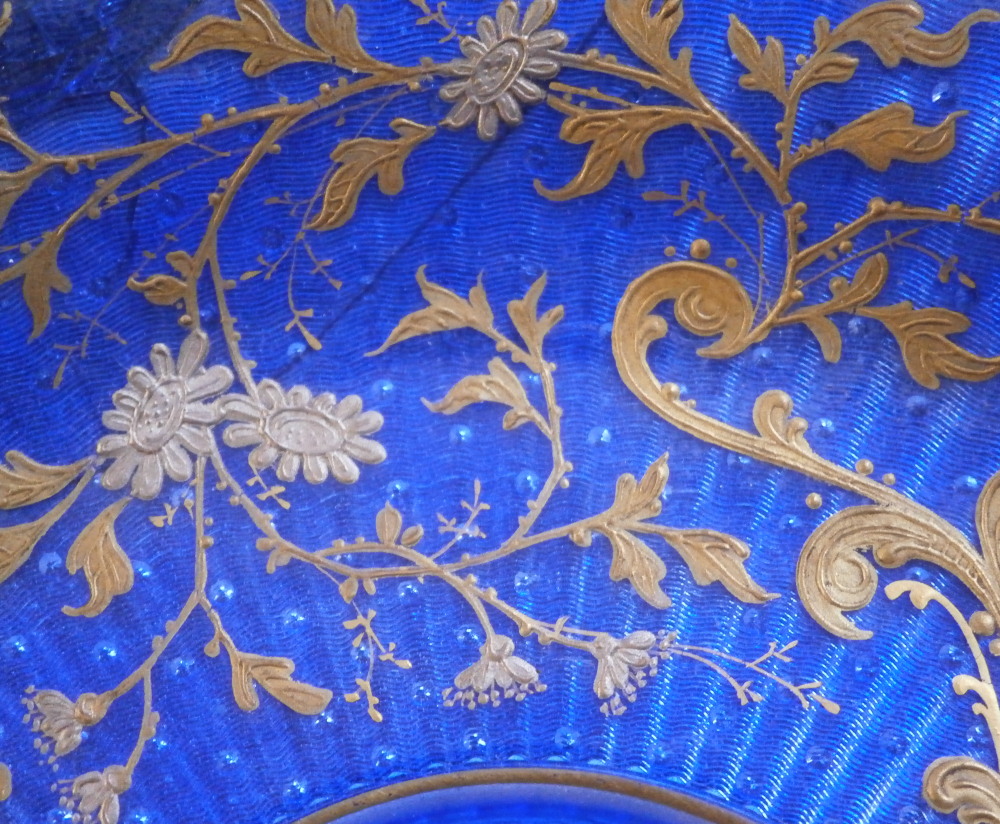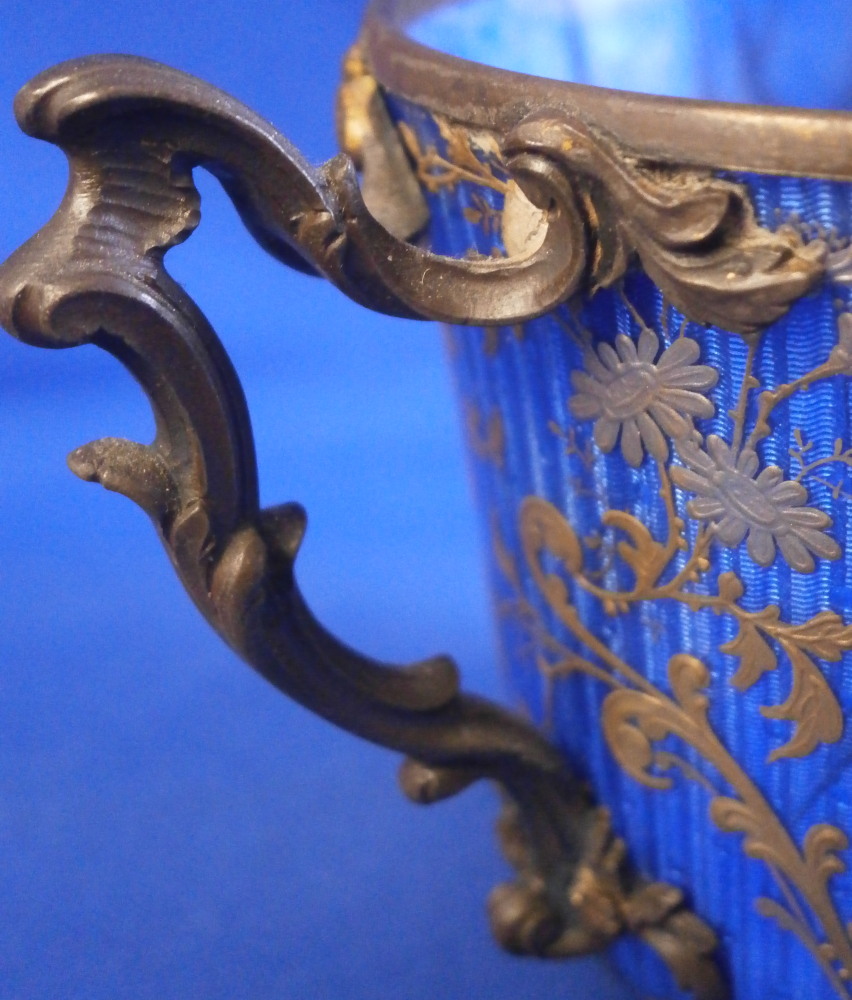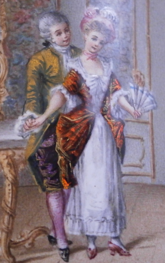 This is an absolutely incredible cup and saucer set made in France in the 19th century - likely in the Limoges area. One finds little trinkets in this sort of enamel like compacts, pill boxes, scent bottles, pendants but I have never seen nor could I now find anything like this set! It's spectacular to say the least! Hard to describe the detail so have a look at the photos. It is a cup & saucer set that has a translucent guilloche enamel in blue on silver, some nice silver and platinum flower design on top of that and each piece has two regular enamel scenes of the best quality. Each scene includes a couple in a room with a ton of details. The enamel is mostly the typical Limoges enamel except for some part of the clothes have that amazing shiny foil enamel as a highlight as shown. Look at the quality of those scenes! Does not come any better!! The handle on the cup is stunning as well. It must have been the best of the best when it was made. Now for the not so good news - there is the obvious damage to the guilloche enamel but I am hoping a restorer I found can fix that. Not an easy task but well worth it! The main damage is to two spots on top of the saucer by the edge and some in the center of the piece. That will be the hardest. The underside of the saucer is simpler due to no decoration on top of that. The inside of the cup is the same. The outside of the cup has one area over one of the scenes and a crack to one of the scenes that are the worst of it. Otherwise it is in great shape. Imagine this piece when it was new? I love porcelain but this set is way beyond even that. I think the silver handle and rim used to be gold washed as well but I am not sure. Small spots seem to indicate that but it is almost all gone. Oddly enough neither piece is marked at all. No silver hallmarks, nothing. That seems strange with this sort of quality and age. The cup is just over 2.375 inches tall with a top diameter of 2.75 inches. The saucer is 0.875 inches tall with a diameter of 5 inches. Please email me for more information or photos.