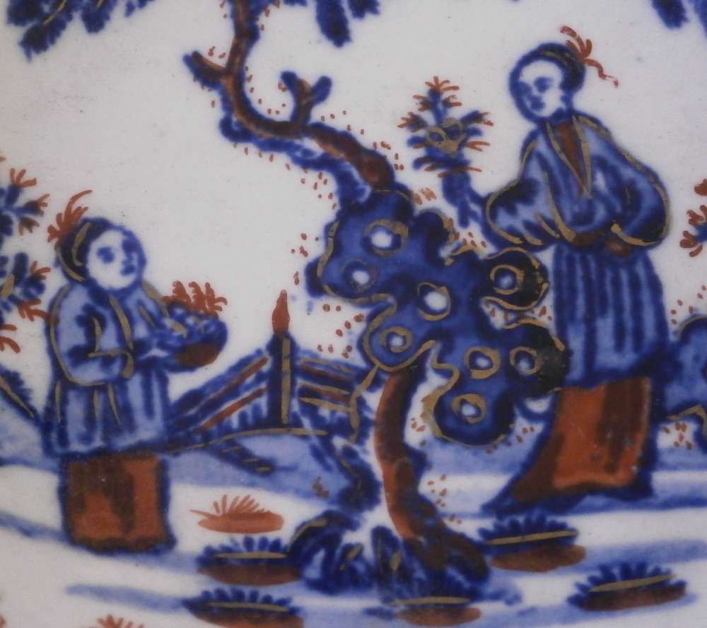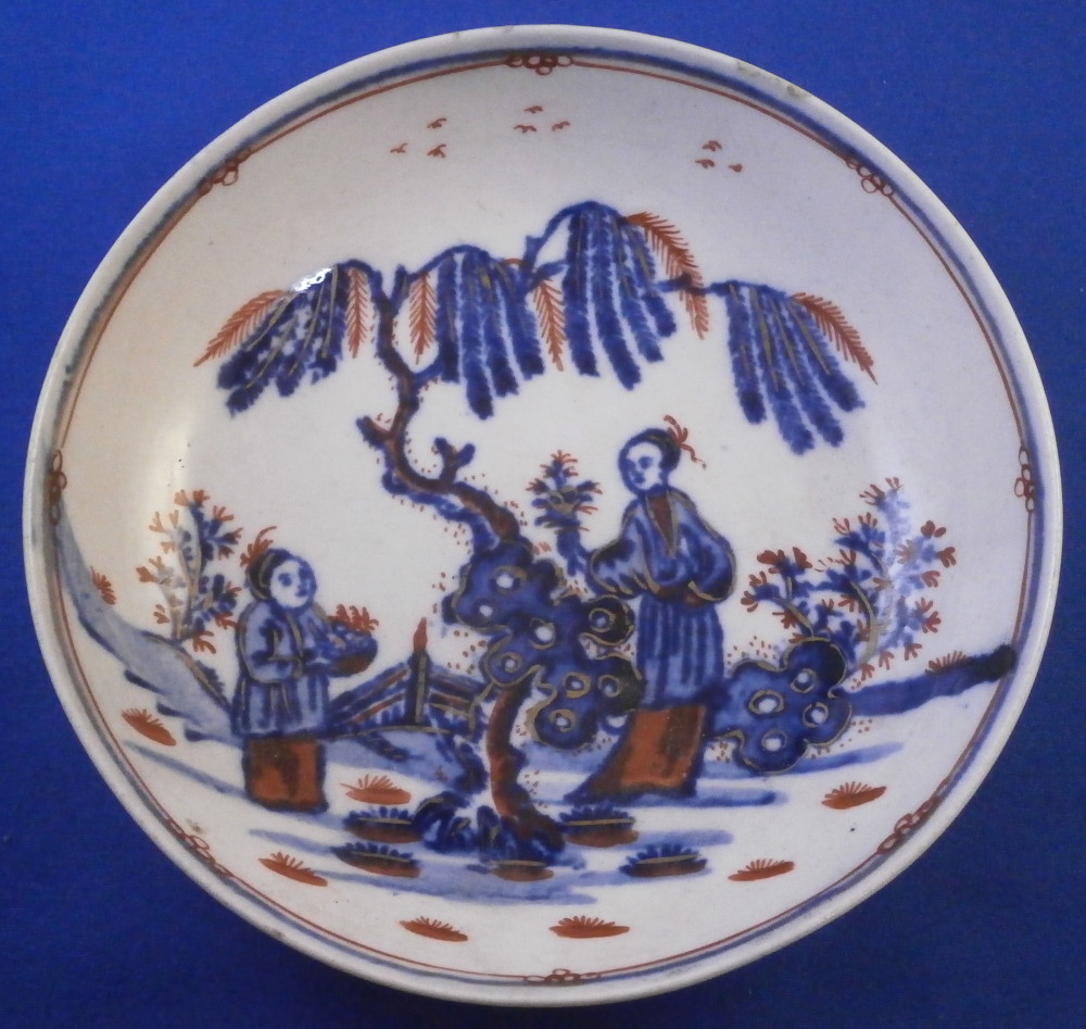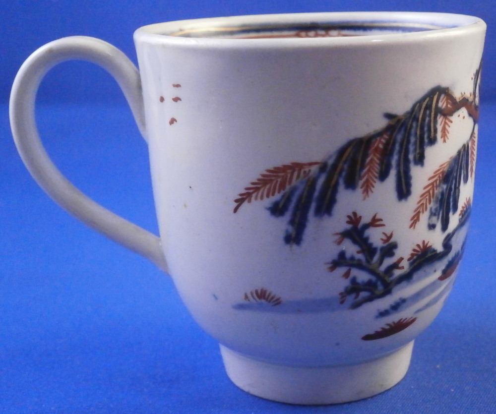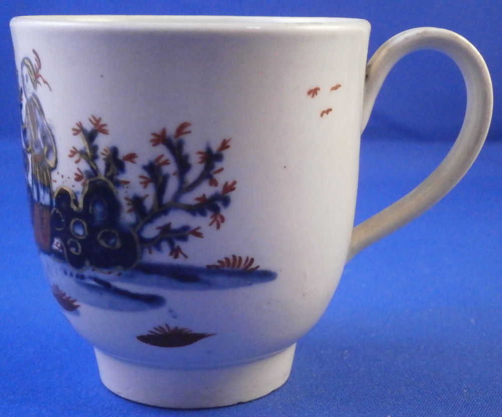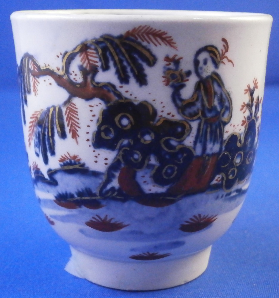 This is a really nice cup and saucer made by one of the Liverpool factories in about 1780. More than likely done by John Pennington. The under glaze blue pattern is called the Chinese Lady and Sevant and it is quite nice with a large willow type tree in the center and a landscape surrounding all around. What is unusual is that it has the over glaze red and gold design to it which is sometimes referred to as clobbered. Many times it is overkill and does not look all that great but here it really does add to the design and makes it a really nice cup & saucer. Not a design I ahve seen this done to before. The set is in superb condition with some of the usual manufacturing flaws but no real damage. Neither piece is marked which is the norm! The cup is just under 2.625 inches tall and 2.5 inches in diameter. The saucer is 1.125 inches tall and 5.25 inches in diameter. Please email me for more information or other pictures.