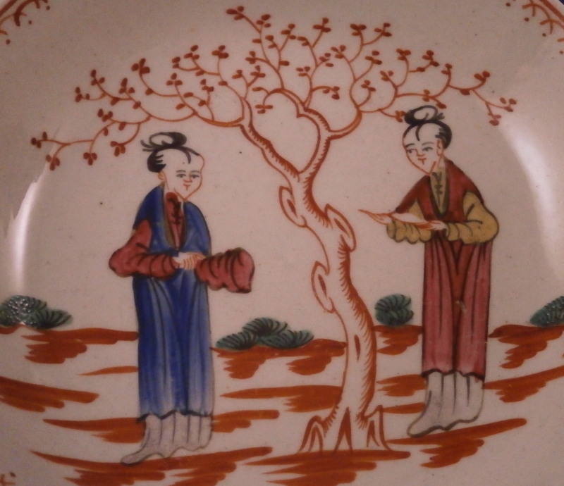 This is a rare saucer made by Seth Pennington of Liverpool in the 18th century. It is hand painted with a superb Chinoiserie scene of two figures with a tree in the center and some some grasses in the background. The colors are strong and the detail superb which makes this one elegant English saucer :) Typical red trim for this maker along the edge. The saucer is in perfect condition with just a teeny bit of wear and minor manufacturing flaws typical to their wares. The piece is unmarked which is the norm! It is 1.25 inches tall and 5.25 inches in diameter. Please email me for more information or other pictures.