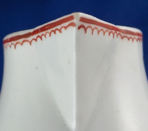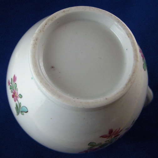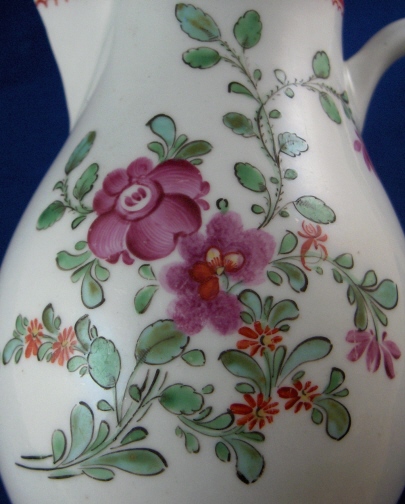 This is a rather rare milk jug or hot water pitcher which I thought was made by one of the Liverpool companies but a buddy of mine said he thought it was made by Lowestoft du to the decoration. Since I do not know enough about the finer points of English porcelain an email on this would be appreciated :) Either way it is a really nice piece from the 18th century and much larger than the tiny creamers you usually find. It is superbly painted with a nice large floral design on one side and three smaller flowers and a leaf on the other side. Nice red trim to the top and the handle. The pitcher is in superb condition with a little wear and a very minor muncher on the tip of the spout. You can see the rings from the hand made manufacturing process on the inside which is neat. The piece is unmarked which is the norm. It is 5 inches tall and 3.5 inches in diameter. Please email me for more information or other pictures.