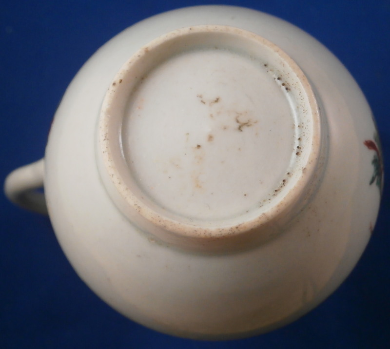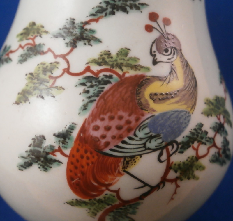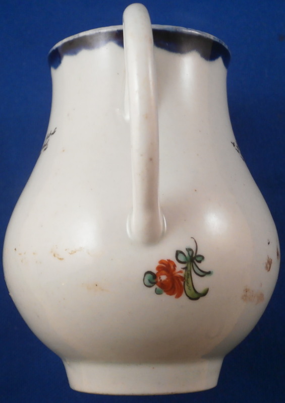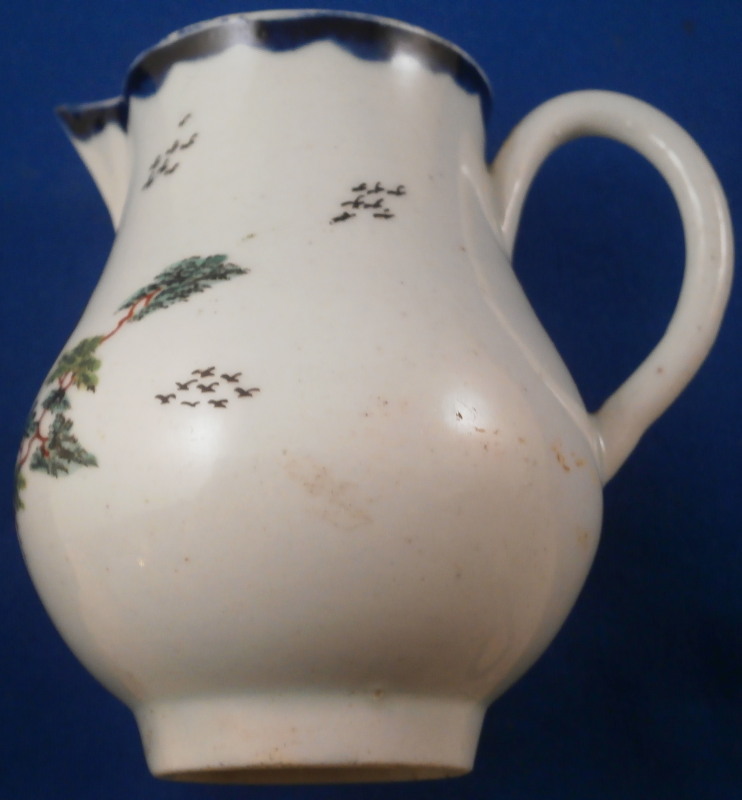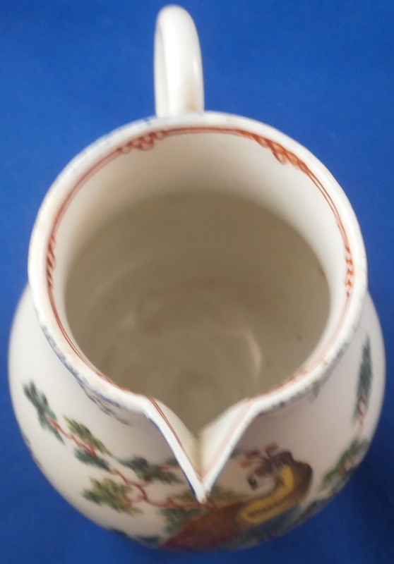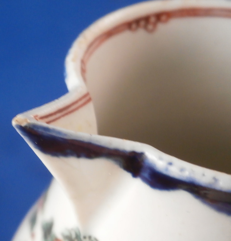 This is a really nice creamer / milk / cream jug made by one of the Liverpool area makers in the 18th century. In this case it was made by Seth Pennington in about 1780. The sparrow beak pitcher has a baluster body and is hand painted with a superb polychrome enamel bird scene including a bird of paradise on a branch of some sort - likely meant to be a prunus branch. Tiny black birds flying in the distance and a typical and very nice red trim to the inside rim. An unusual under glaze blue trim to the outside top rim. The piece is in great condition with a teeny nibble to the very tip of the spout. The creamer is not marked which is the norm! It is 3.25 inches tall with a diameter of about 2.5 inches. Really nice piece! Please email me for more information or other pictures.