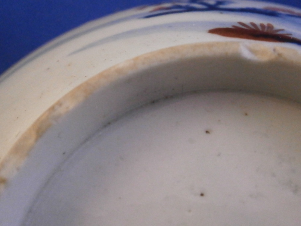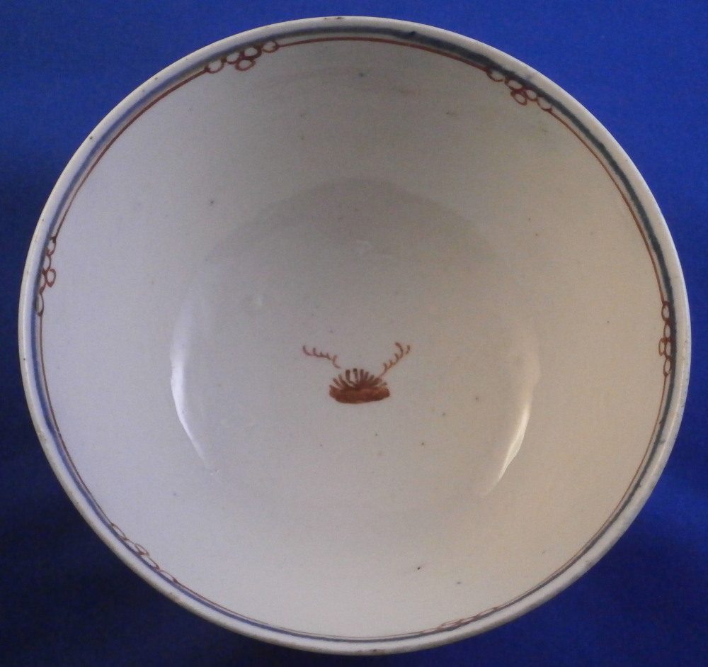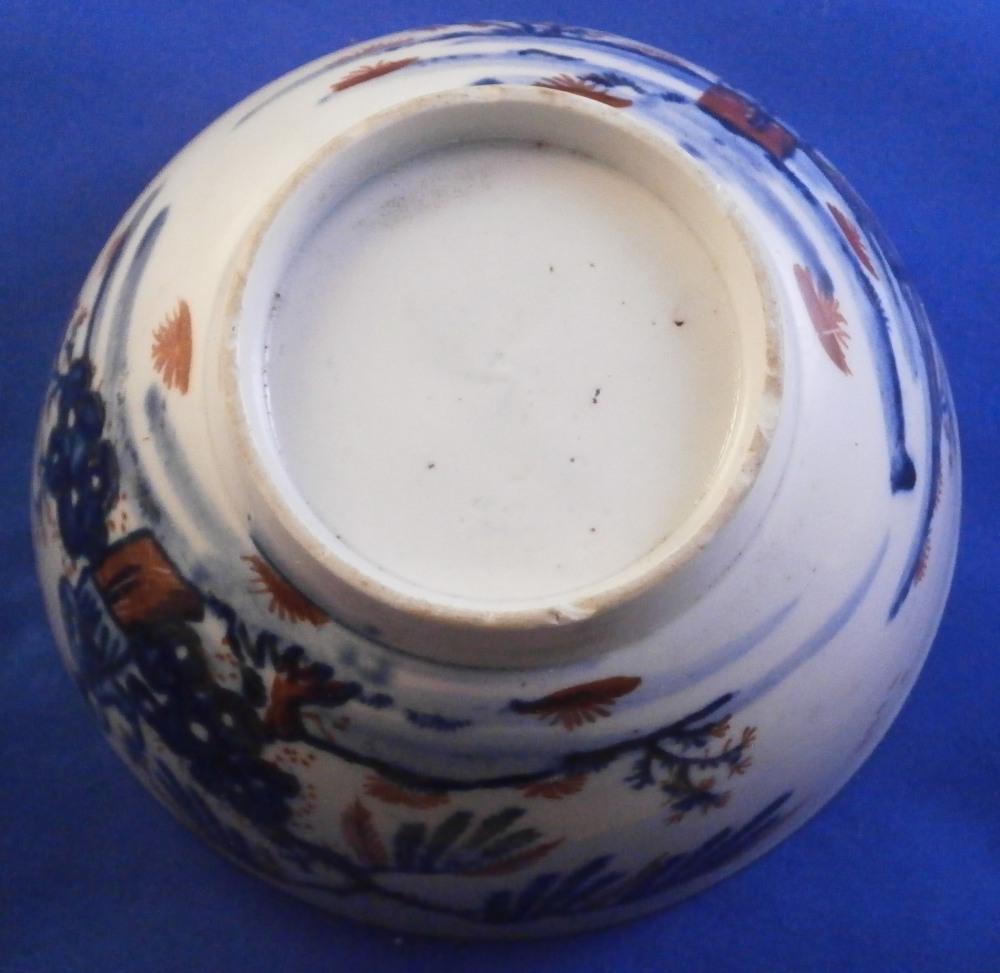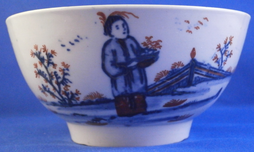 This is a really nice small waste bowl made by one of the Liverpool factories in about 1780. More than likely done by John Pennington. It is decorated with an under glaze blue pattern called the Chinese Lady and Servant design. One side has the Chinese lady with a large willow type tree in the background while the other side has a scene of a servant with a fence in the background in a landscape. Blue lines to the inside edge with a red trim over that typical for the Liverpool area makers. The under glaze blue design one can find from time to time but what is unusual is that it has the over glaze red and gold design to it which is sometimes referred to as clobbered. Many times it is overkill and does not look all that great but here it really does add to the design and makes it a really nice slop bowl. Not a pattern I have seen this done often to before. The piece is in superb condition with some of the usual manufacturing flaws and a touch of wear plus some nibbles to the foot ring that look to be original to when it was made but no real damage and it displays perfectly. It is not marked which is the norm! The piece is 2.25 inches tall and 4.625 inches in diameter. Please email me for more information or other pictures.