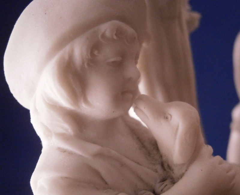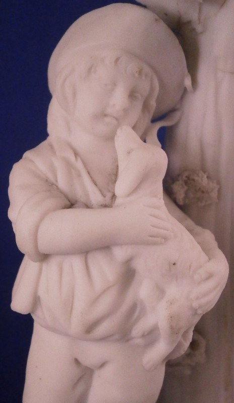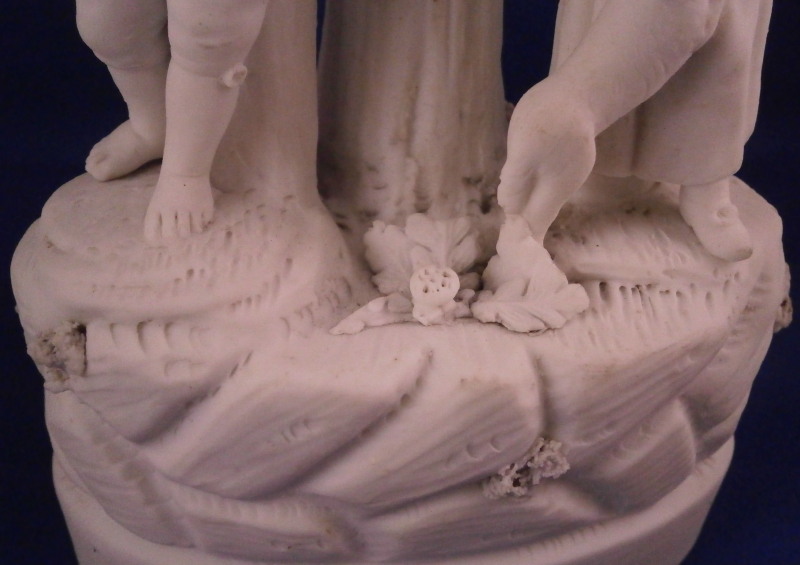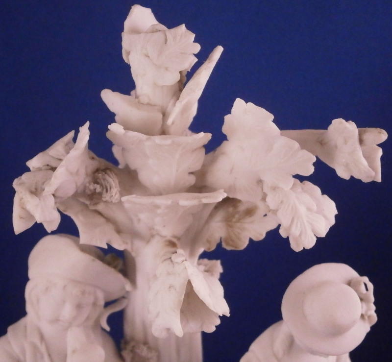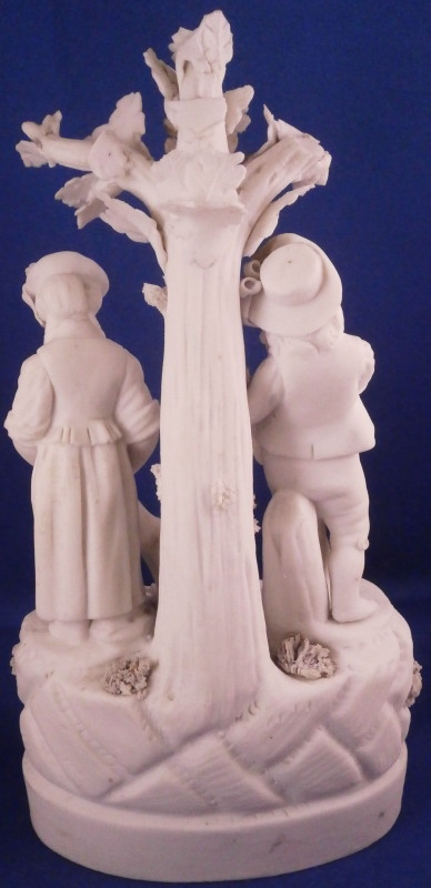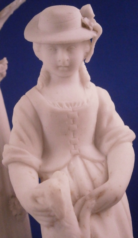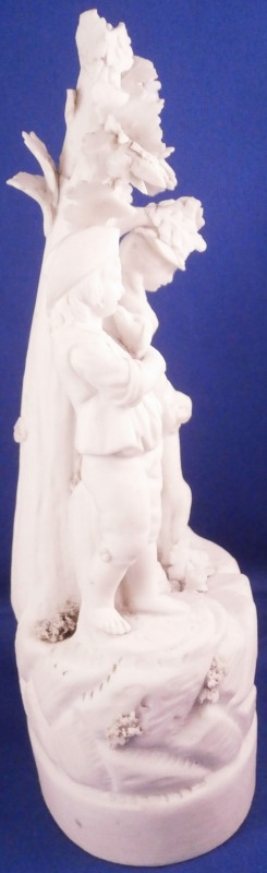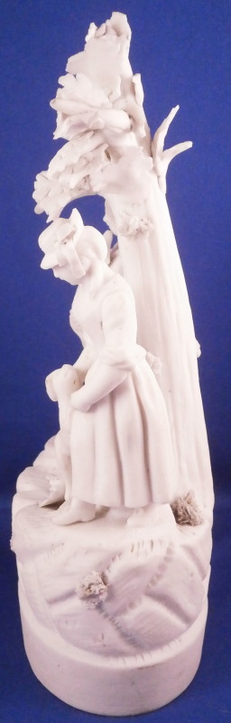 This is a nice figurine made by La Courtille of France around 1780. The factory was also called Rue de la Fontaine-au-Roi or Locre . The figurine is made of unglazed or biscuit porcelain and is of a couple with their pets standing under a tree on a typical rock base with some greenery and the base rim underneath. Both are wearing a nice hat with the gentleman holding a dog in his arms while the lady is petting the dog that has its paws on her skirt. The figure is not marked underneath but this is a typical piece for this maker and this type of base gives it away easily. The figurin is in great condition with obviously some damage to the leaves but no other issues so in better shape than most one comes across. All in all a superb example! The figurine is 7.75 inches tall, 4 inches wide and 2.5 inches deep. Please email me for more information or other pictures.