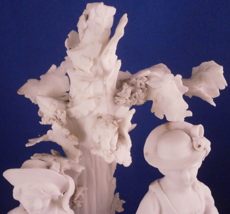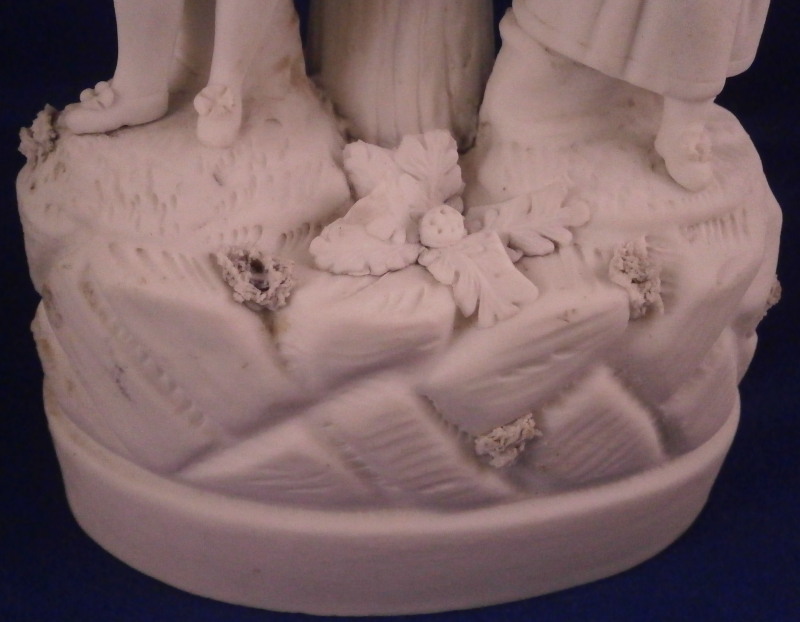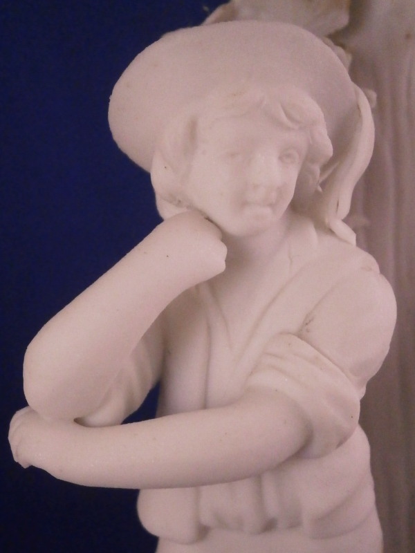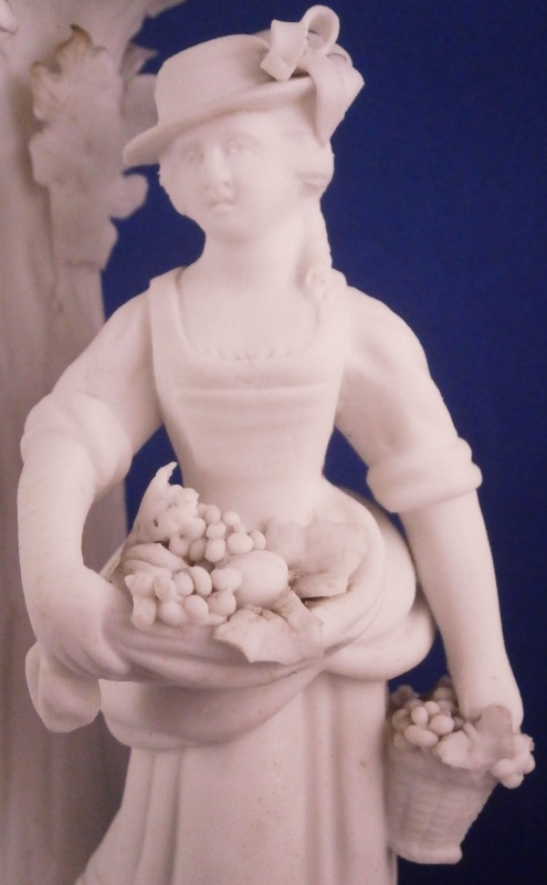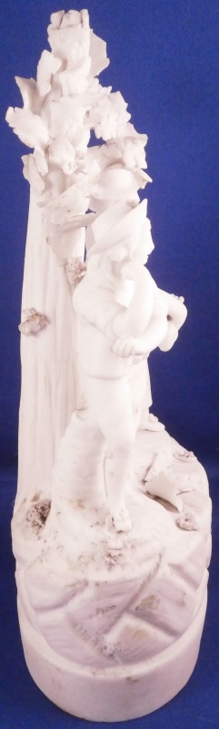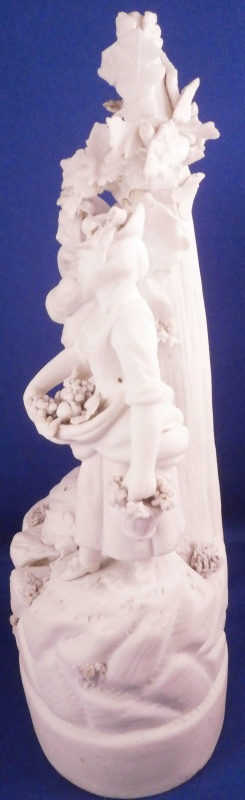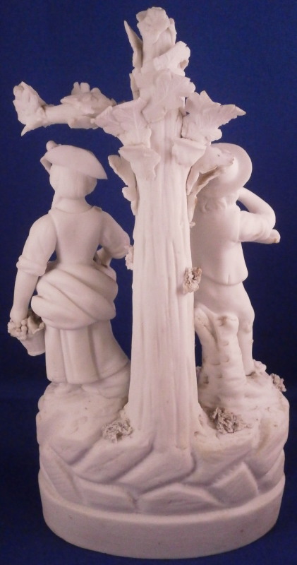 This is a nice figurine made by La Courtille of France around 1780. The factory was also called Rue de la Fontaine-au-Roi or Locre . The figurine is made of unglazed or biscuit porcelain and is of a couple standing under a tree on a typical rock base with some greenery and the base rim underneath. Both are wearing a nice hat with the gentleman in deep thought while the lady is is holding two baskets with some grapes and fruit in them. The figure is not marked underneath but this is a typical piece for this maker and this type of base gives it away easily. The figurine is in great condition with obviously some damage to the leaves and one branch is missing on the tree over the gentleman's head. No other issues so in better shape than most one comes across. All in all a superb example! The figurine is 7.75 inches tall, 4 inches wide and 2.5 inches deep. Please email me for more information or other pictures.