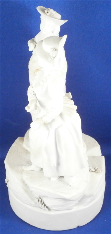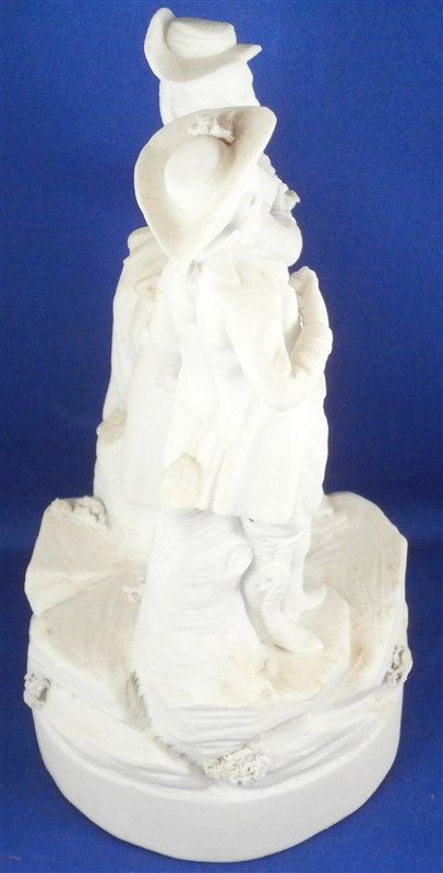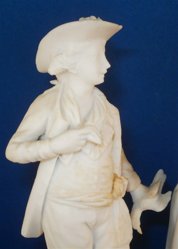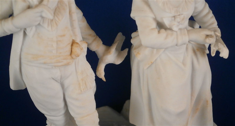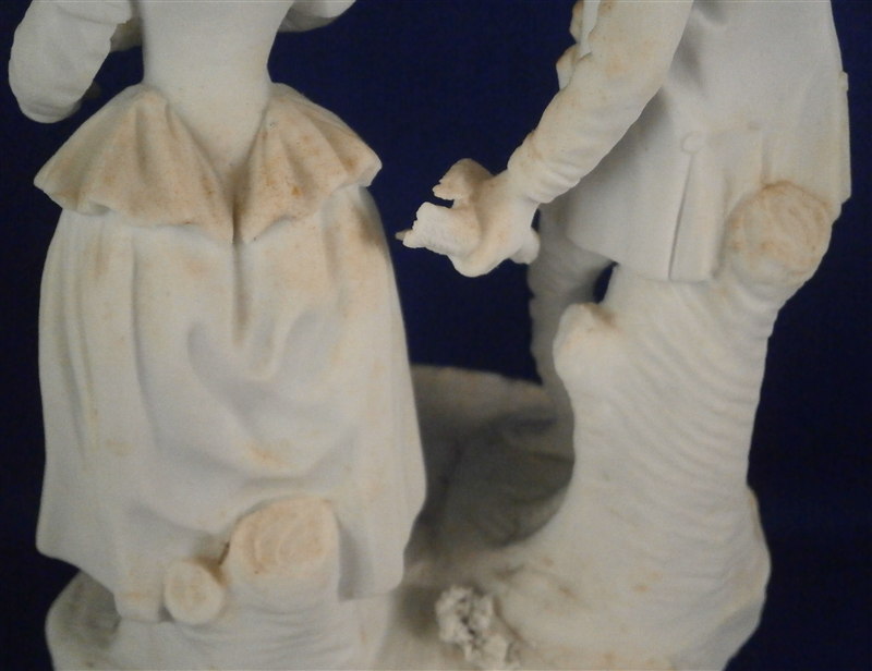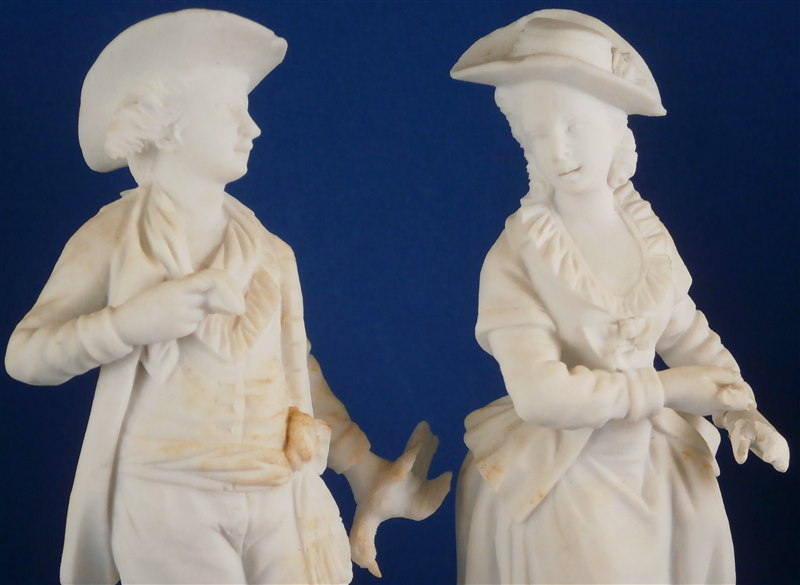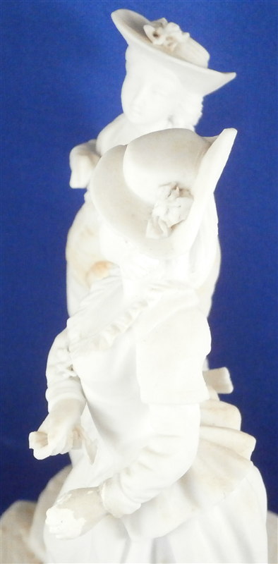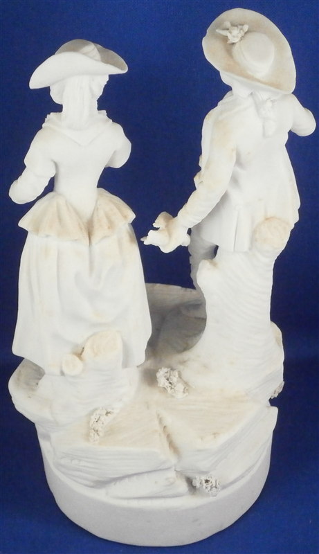 This is a figurine made by La Courtille of France around 1780. The factory was also called Rue de la Fontaine-au-Roi or Locre . The figurine is made of unglazed or biscuit porcelain and is of a couple dressed in their Sunday's best standing on a typical rock base with some greenery and the base rim underneath. The gentleman is wearing a nice hat and is holding a bird in his left hand. The lady is also wearing a nice hat and was likely holding a cane or staff in her hands which is now missing. The piece is marked underneath with their incised crossed torch mark as well as an incised monogram or letter but I am unsure what they are meant to be. The figure displays superbly but has a few minor damages - as I stated earlier there might have been a staff in her hands at some point, her left hand was off and damaged and has been reglued, some damage to bos in their hat, her blouse and the one on her shoe is missing and some minor chips to her hat and the base edge. A bit of staining that could easily be cleaned up but all in all a superb example! The figurine is 7.25 inches tall and the base has a diameter of about 3.5 inches. Please email me for more information or other pictures.